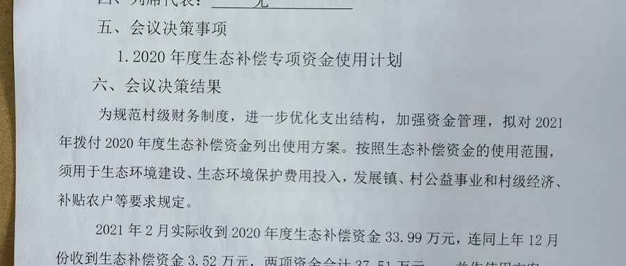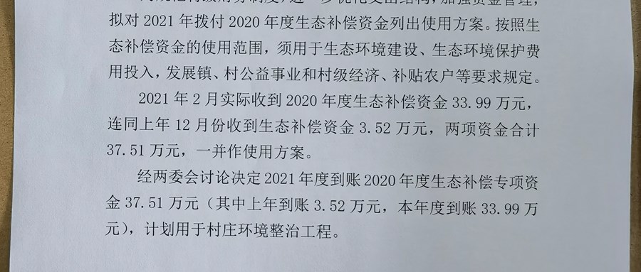 2021年2月收到2020年度生态补偿资金33.99万元,连同2020年12月份收到生态补偿资金3.52万元,两项资金合计37.51万元,一并作使用方案。经两委会讨论决定2021年度到账2020年度生态补偿专项资金37.51万元(其中上年到账3.52万元,本年度到账33.99万元),计划用于村庄环境整治工程。