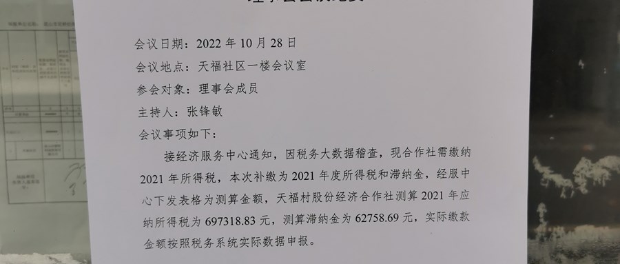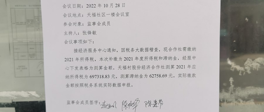 2022年天福村股份经济合作社关于2021年度所得税及滞纳金缴纳事宜