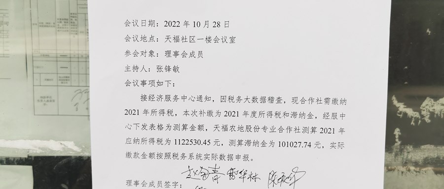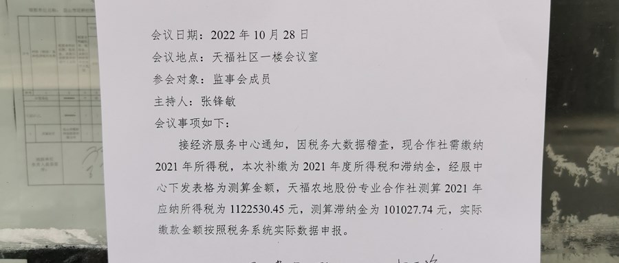 2022年天福农地股份专业合作社关于2021年度所得税及滞纳金缴纳事宜