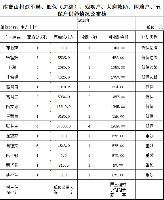 南吉山村烈军属、低保(边缘)、残疾户、大病救助、困难户、五保户供养情况公布榜