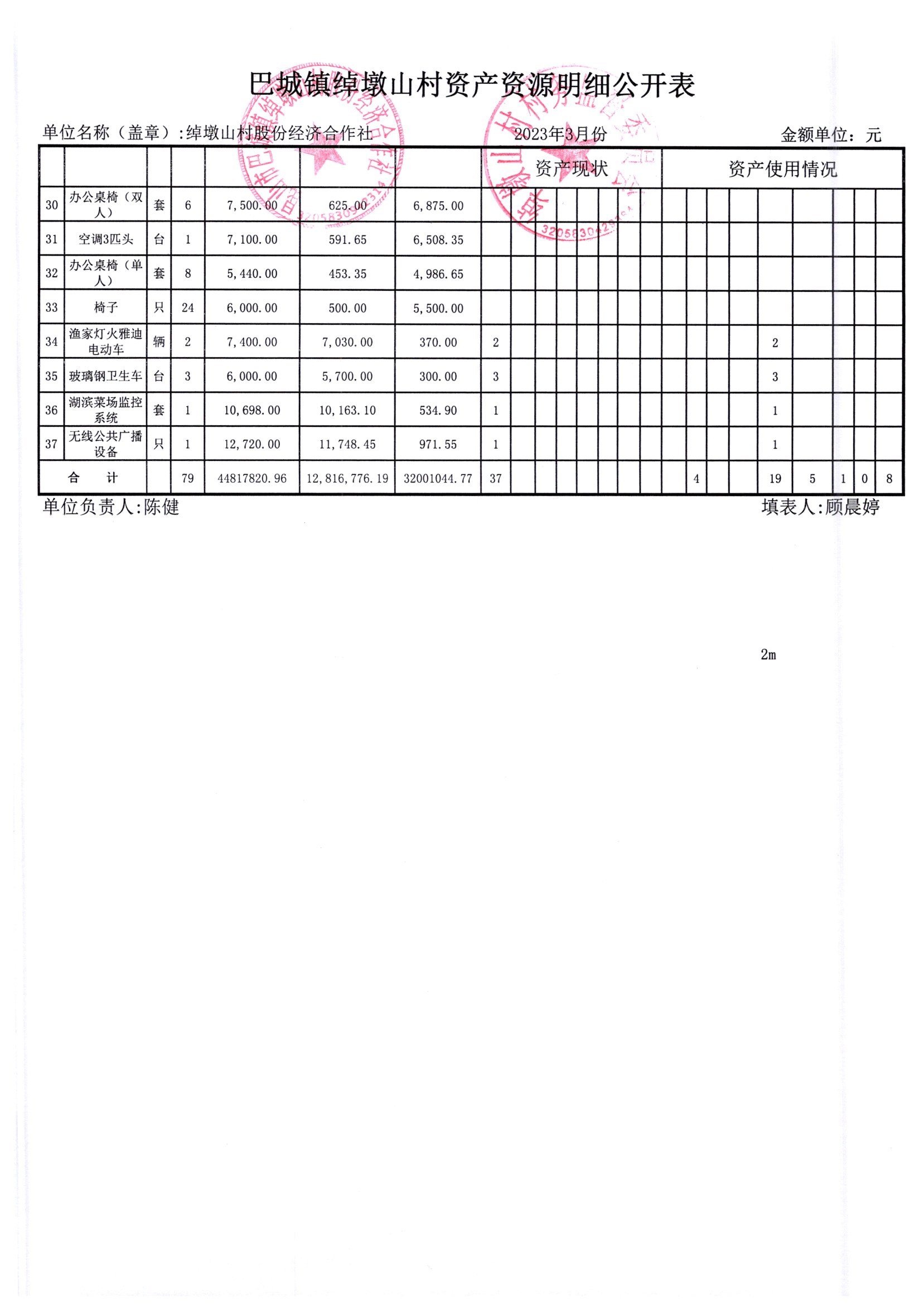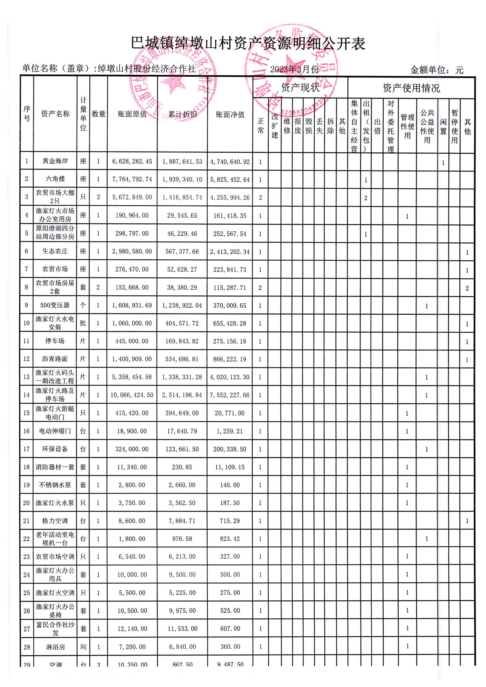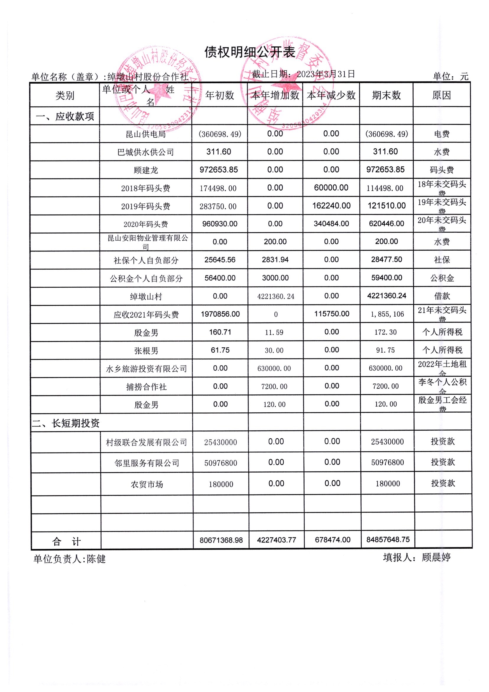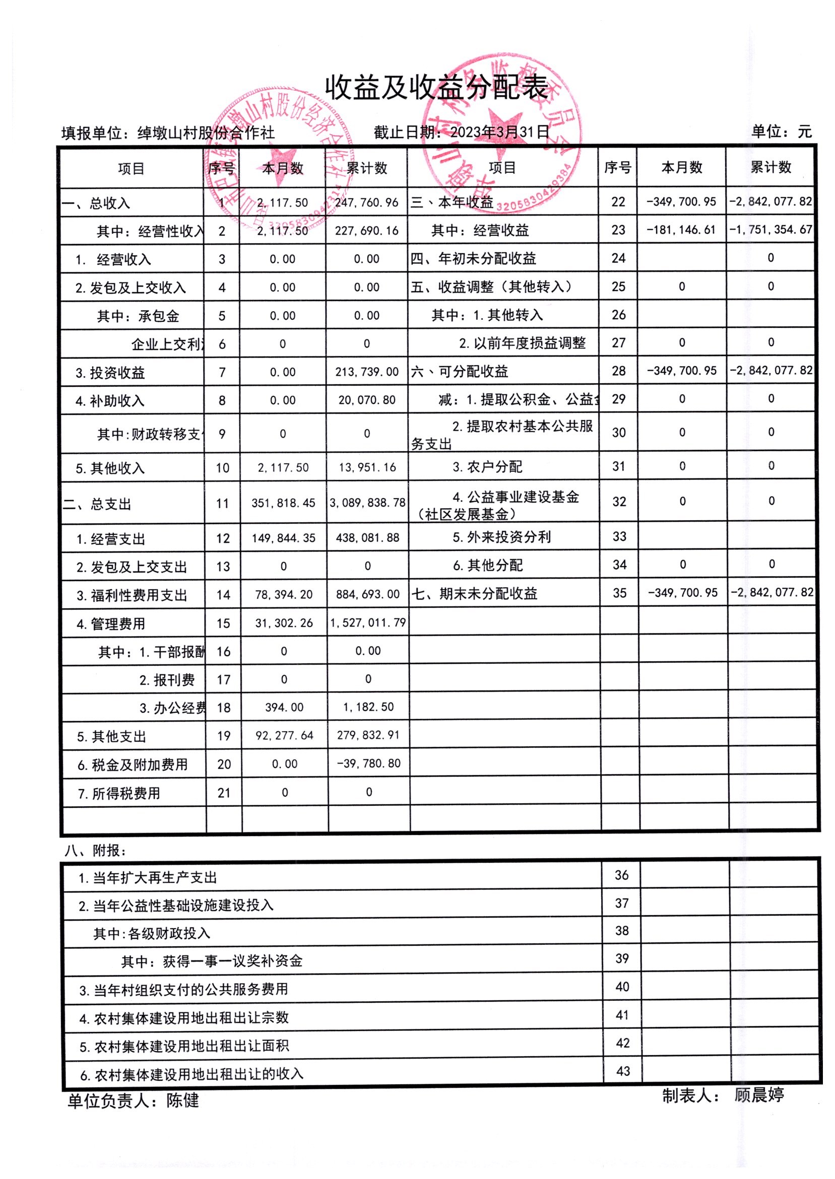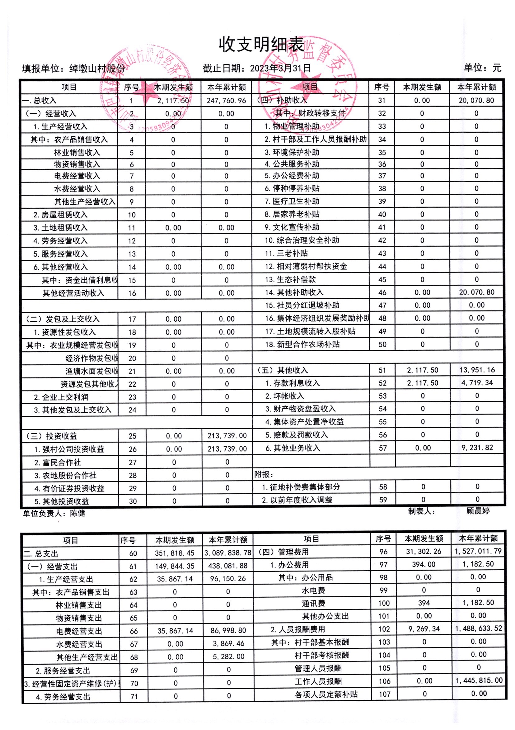 2023年3月份绰墩山村股份经济合作社财务公开