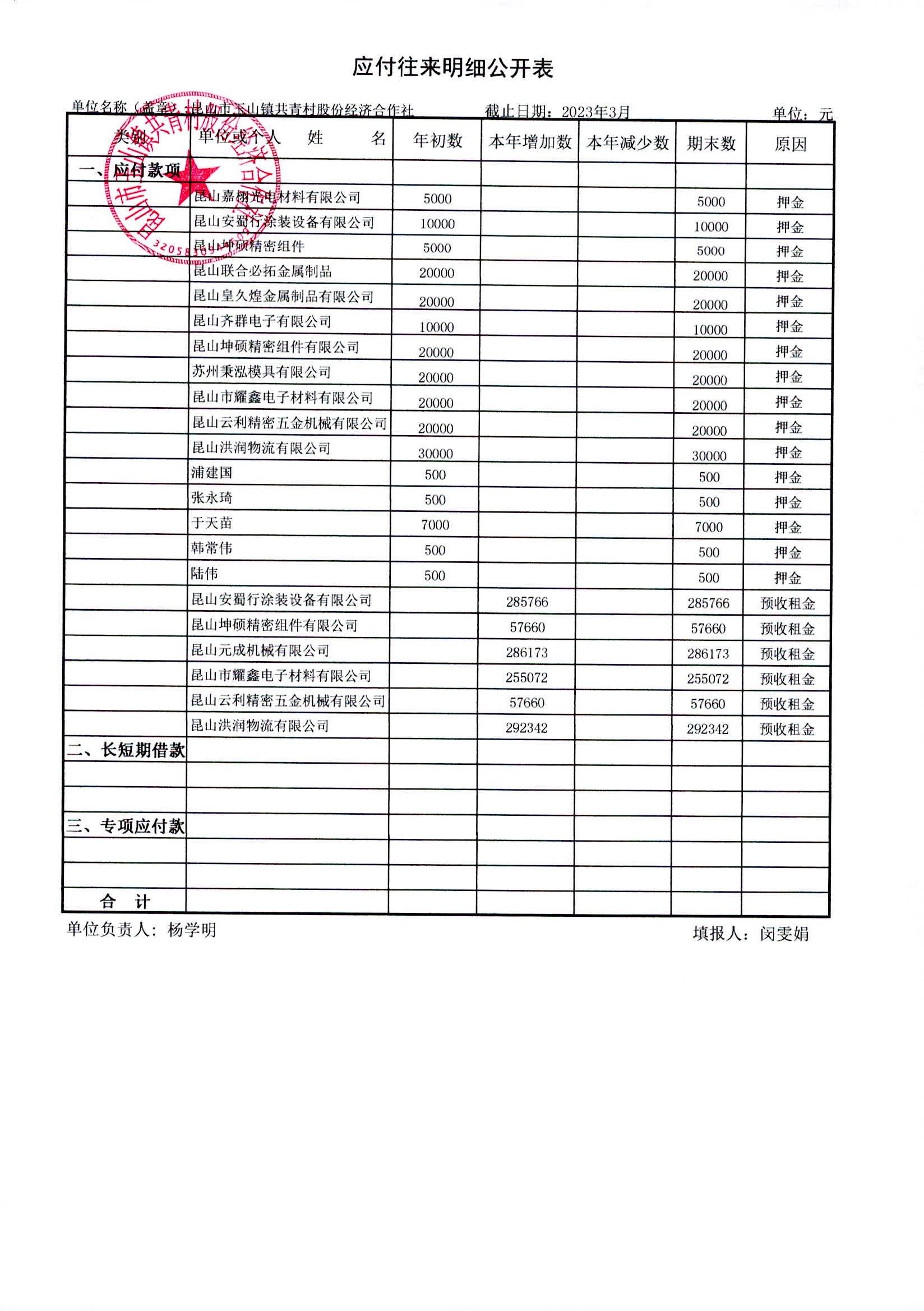2023年3月份共青村股份经济合作社应付往来明细公开表