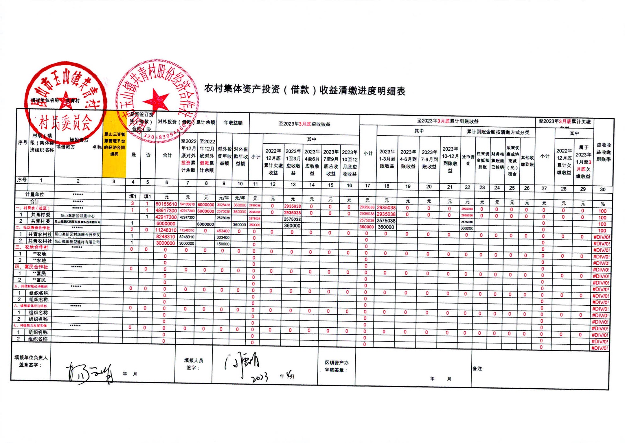 2023年3月共青村农村集体资产投资(借款)收益清缴进度明细表
