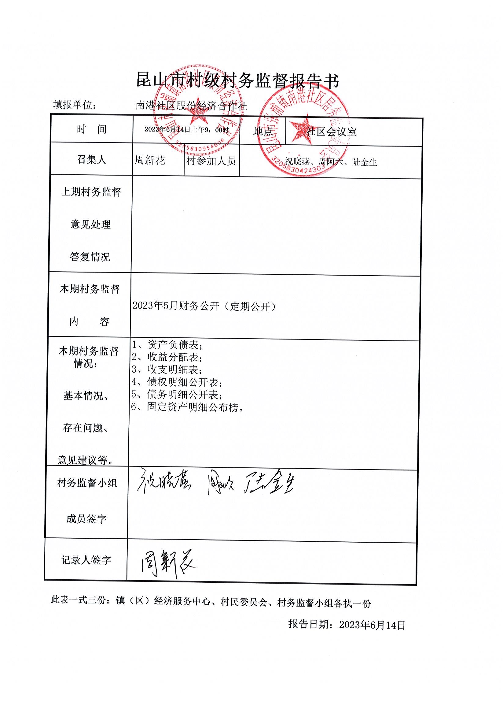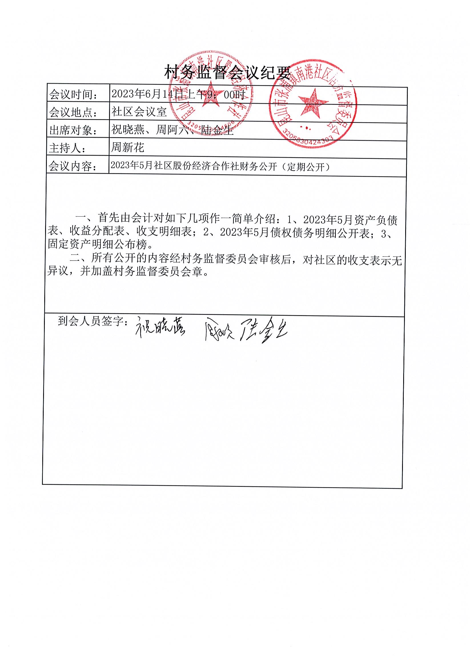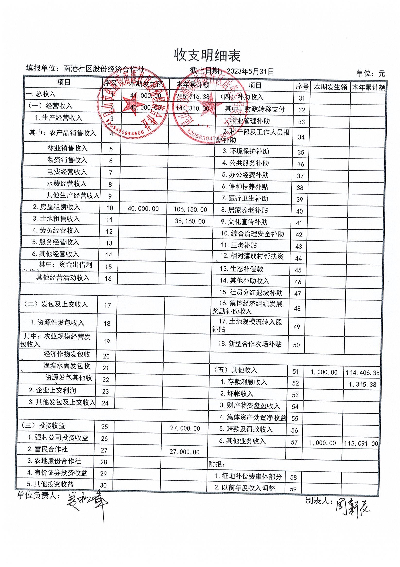 南港社区股份经济合作社2023年5月财务公开(定期公开)