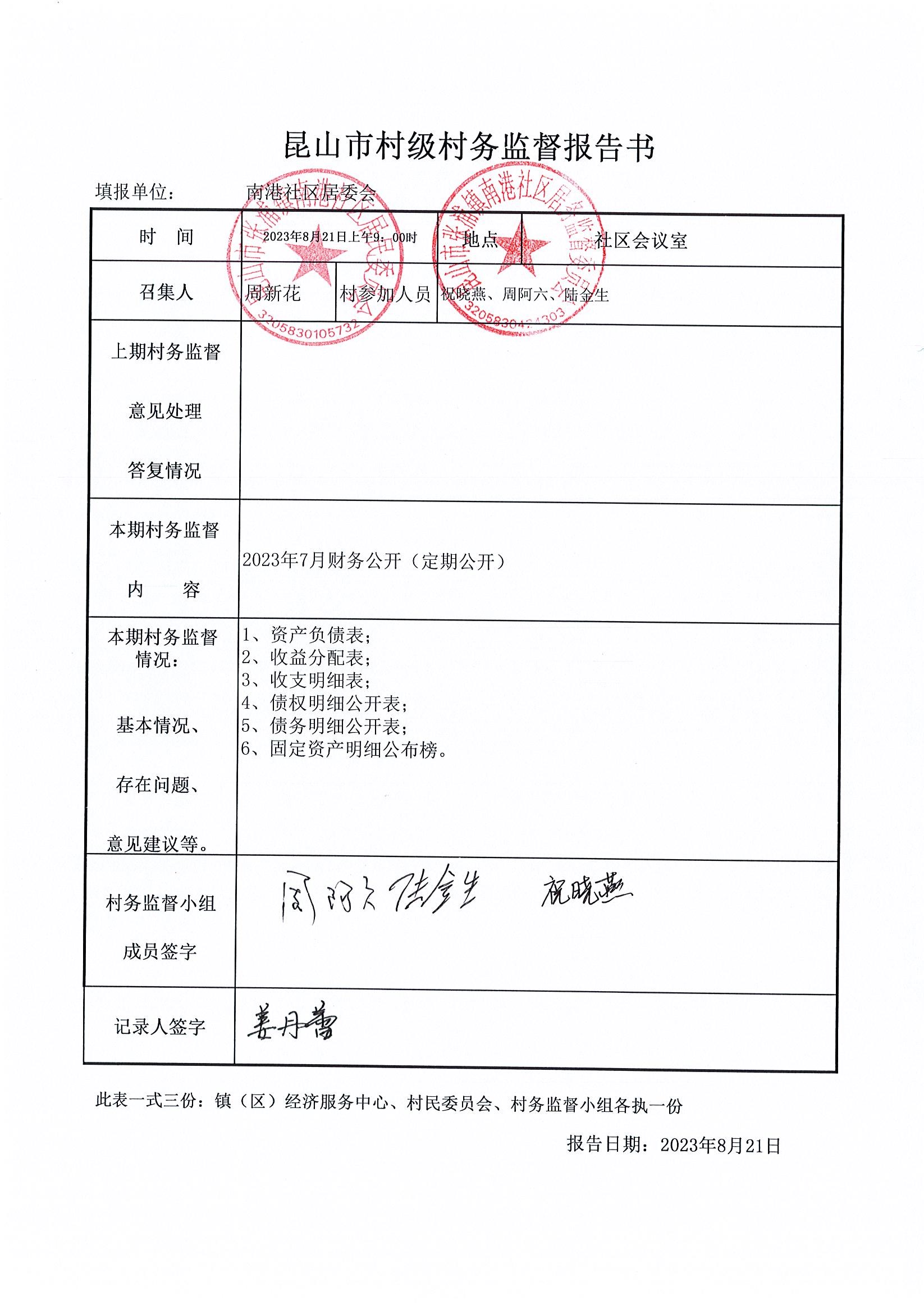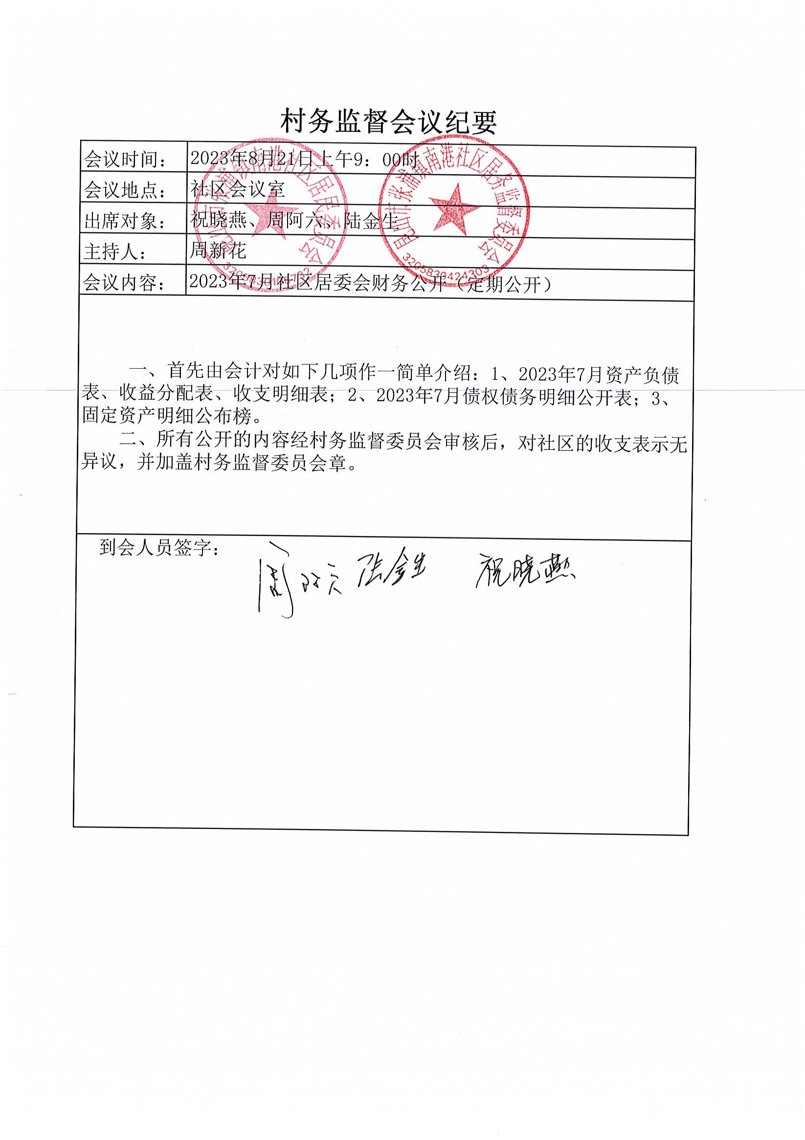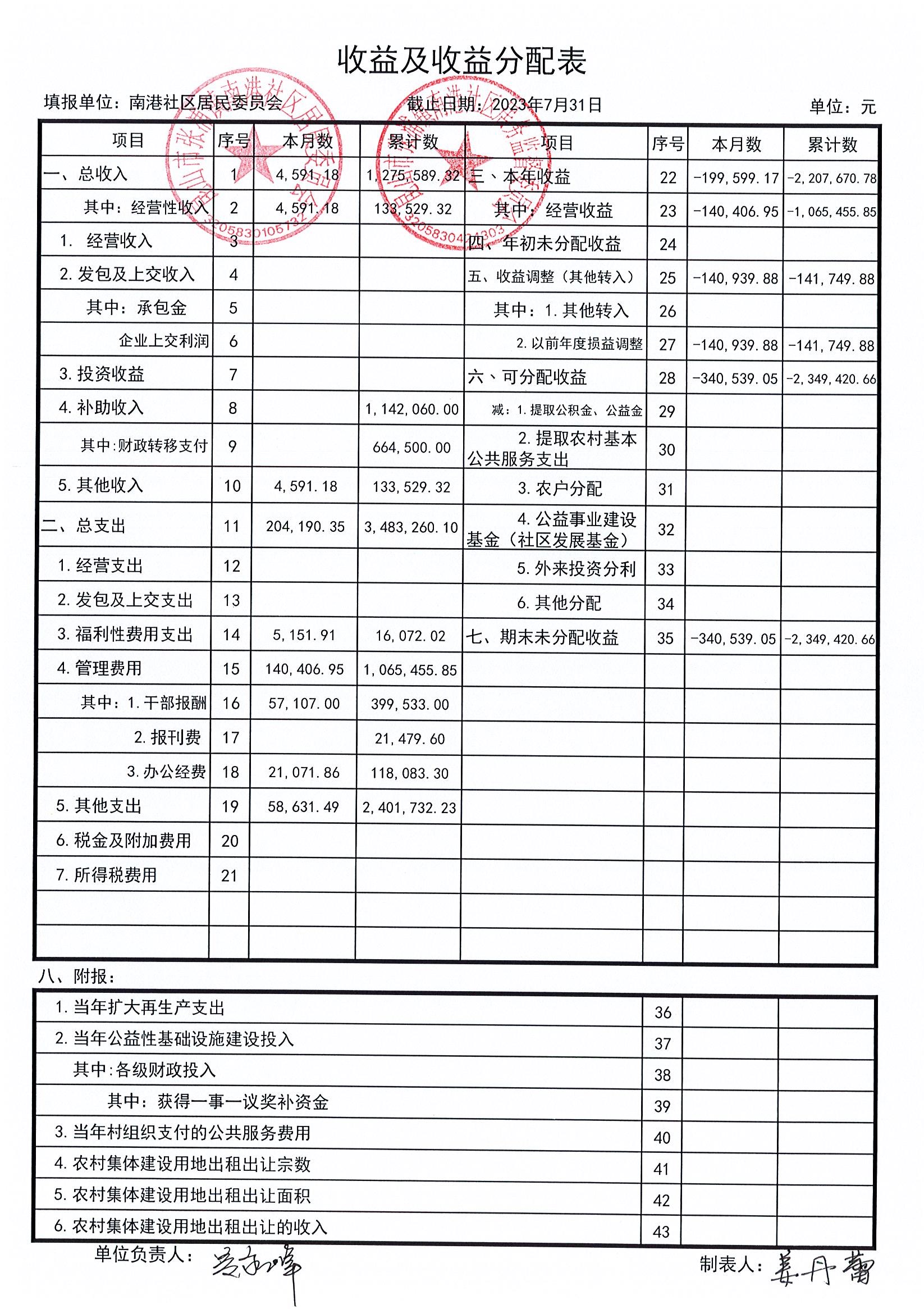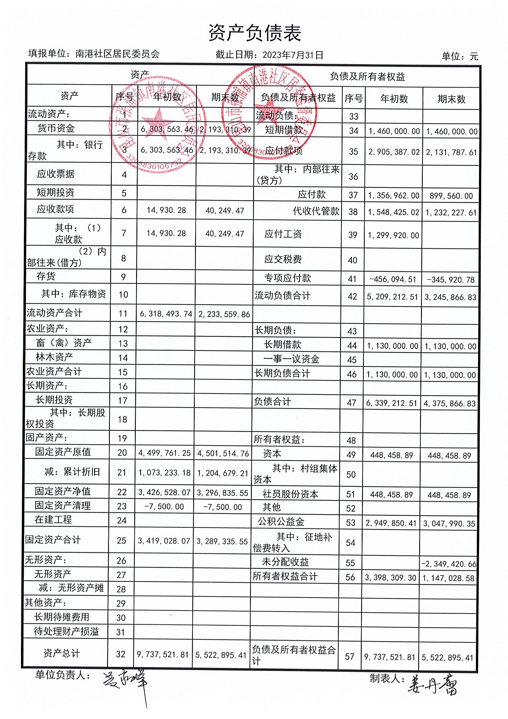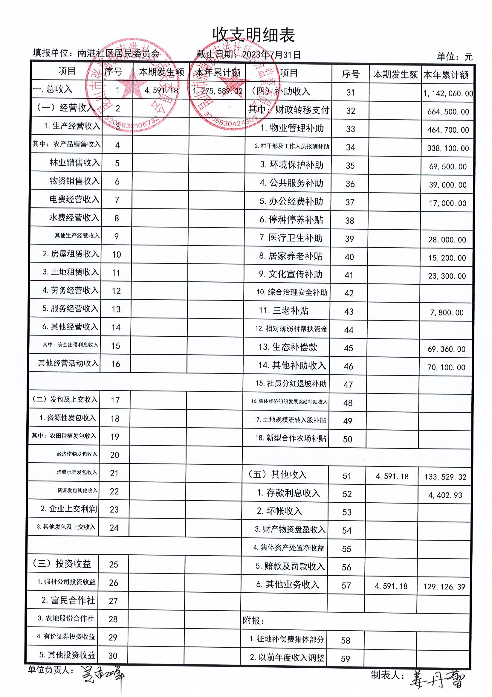 南港社区居委会2023年7月财务公开(定期公开)