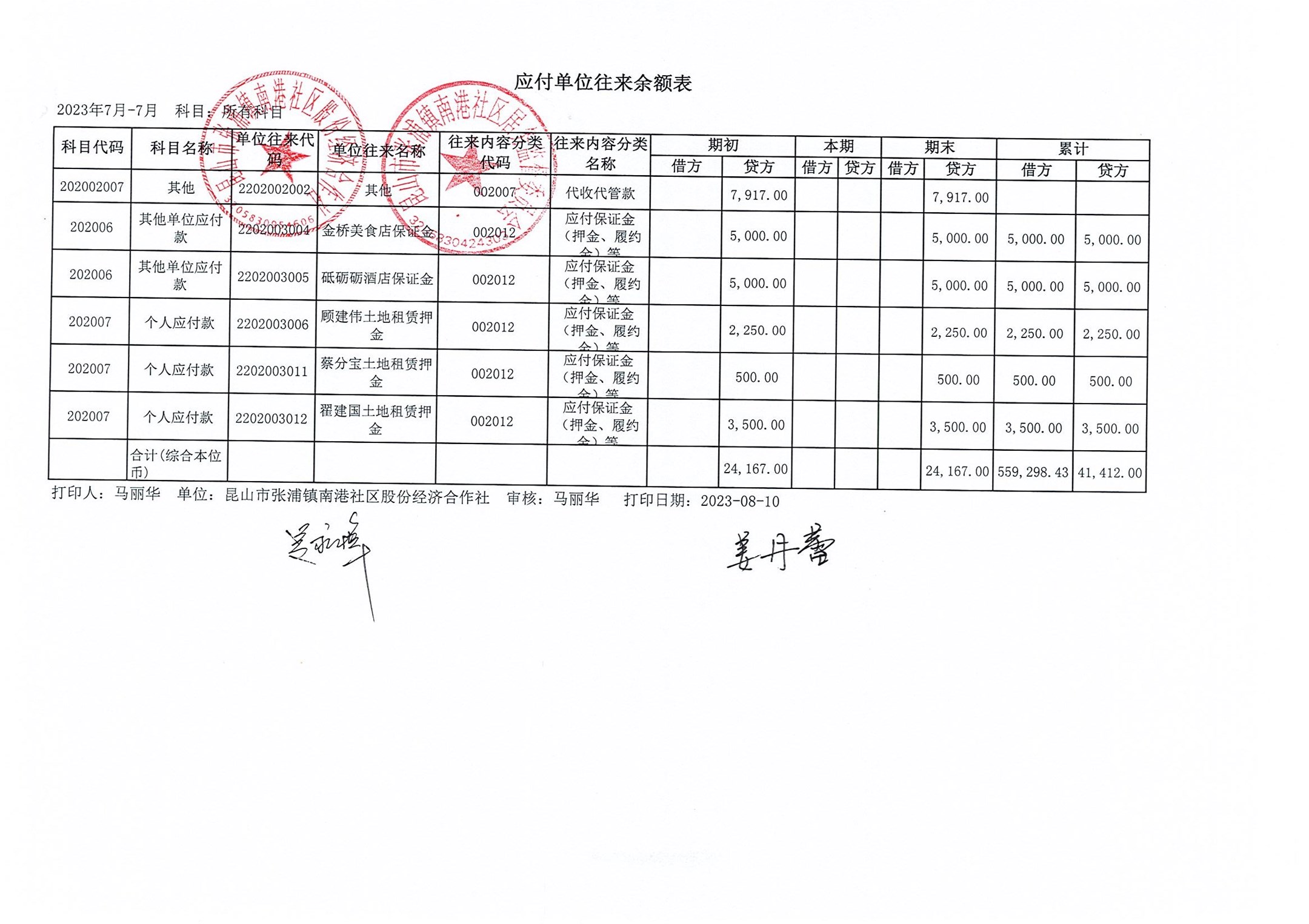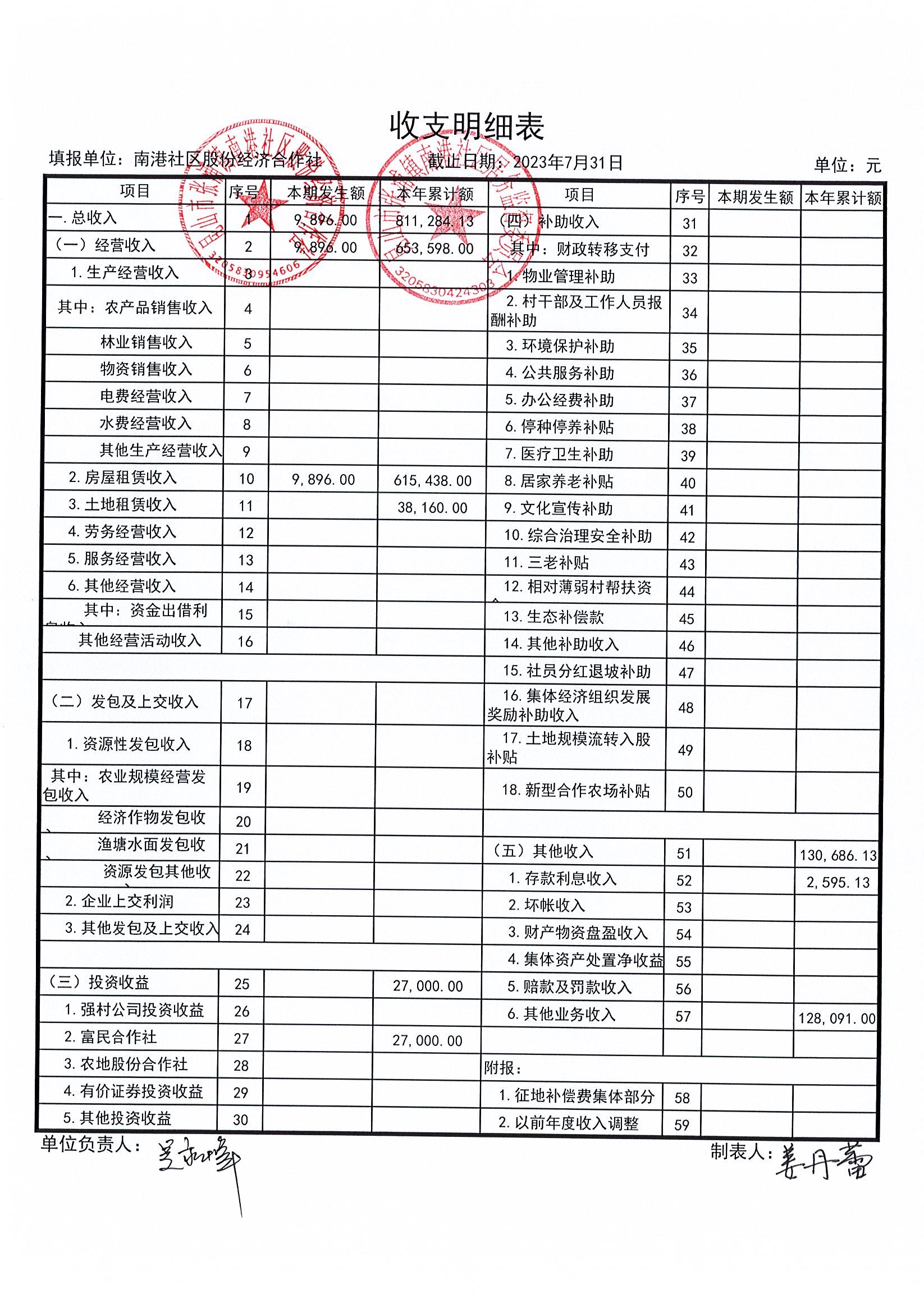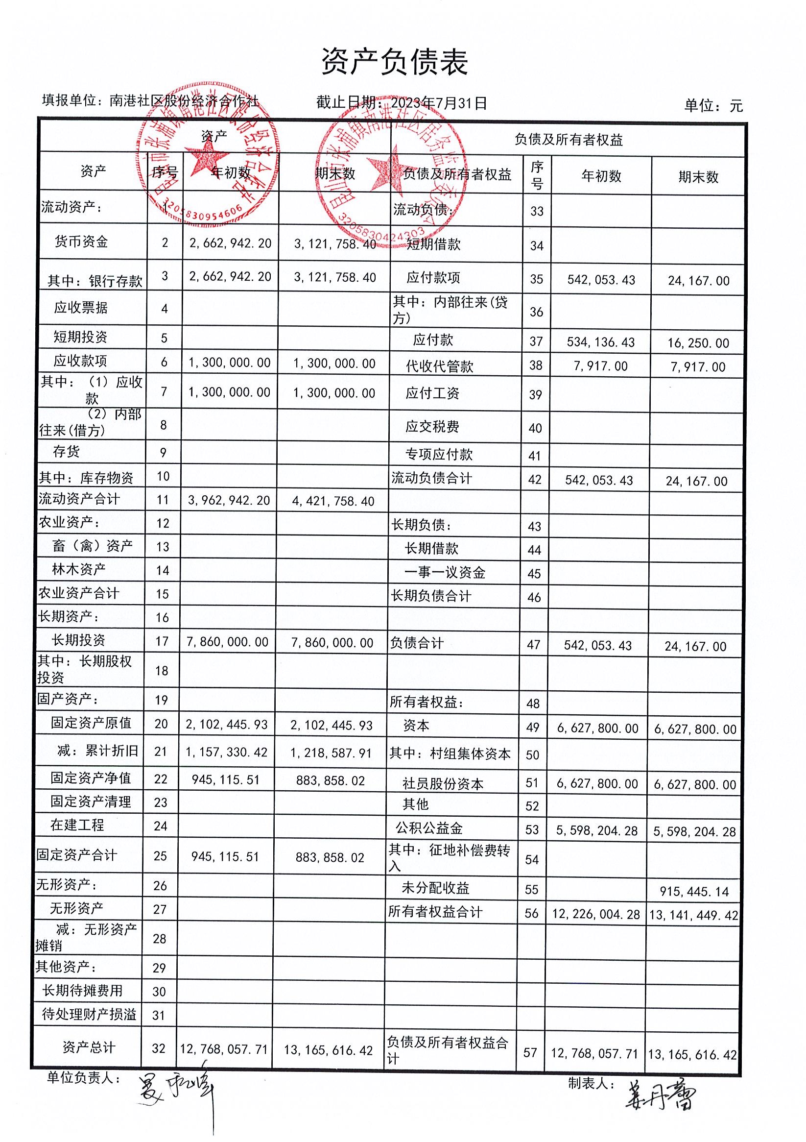 南港社区股份经济合作社2023年7月财务公开(定期公开)