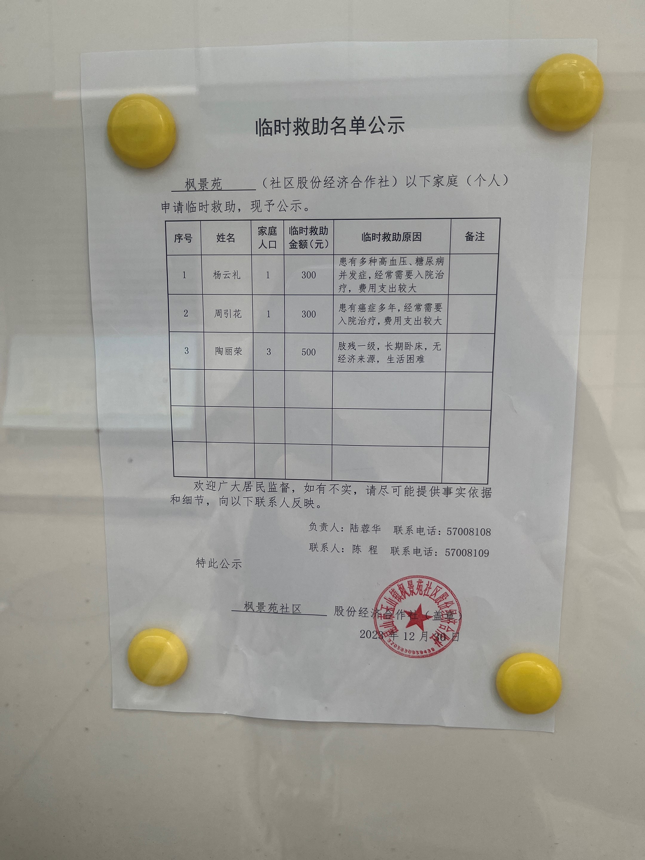 2023年12月社区临时救助公示
