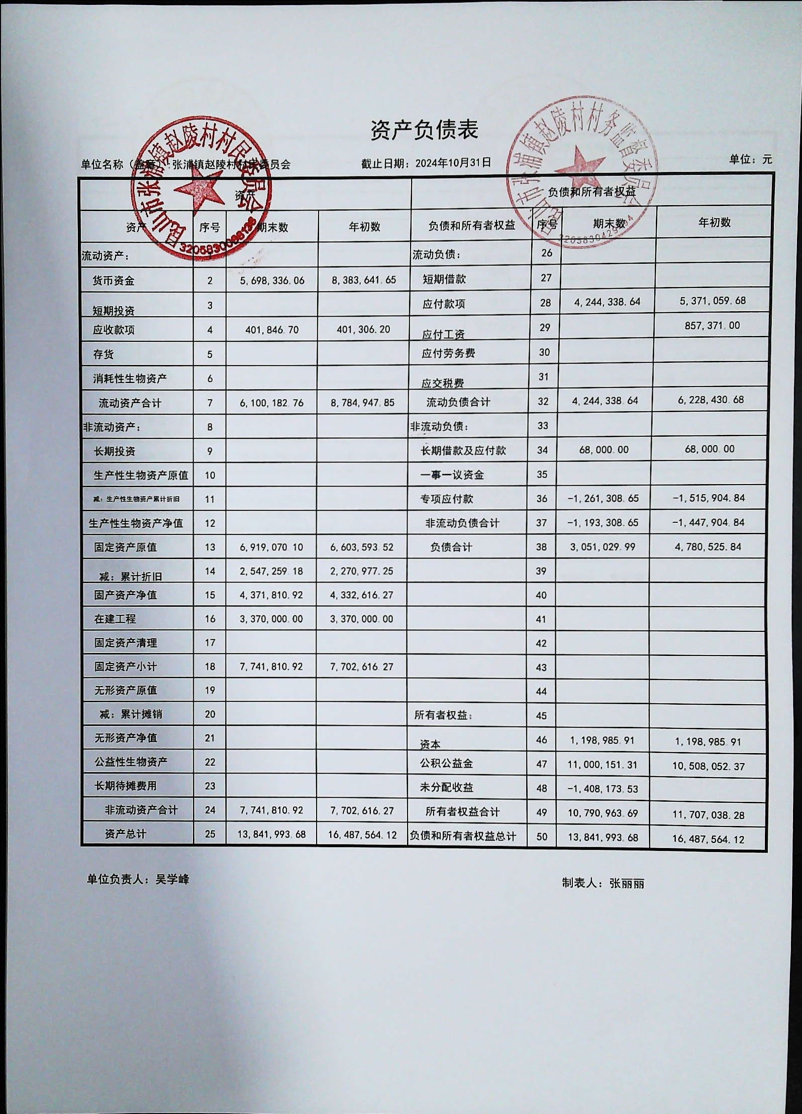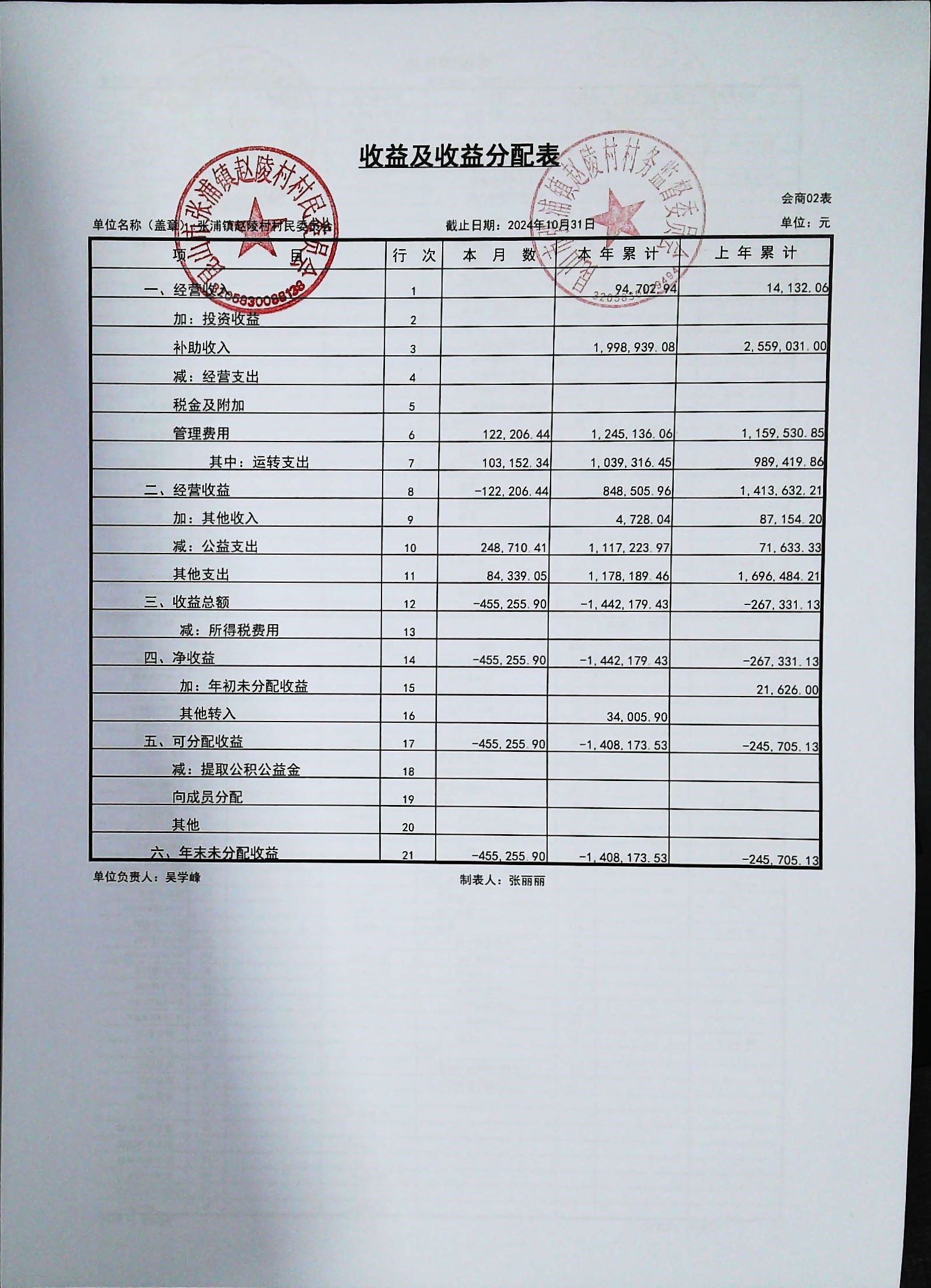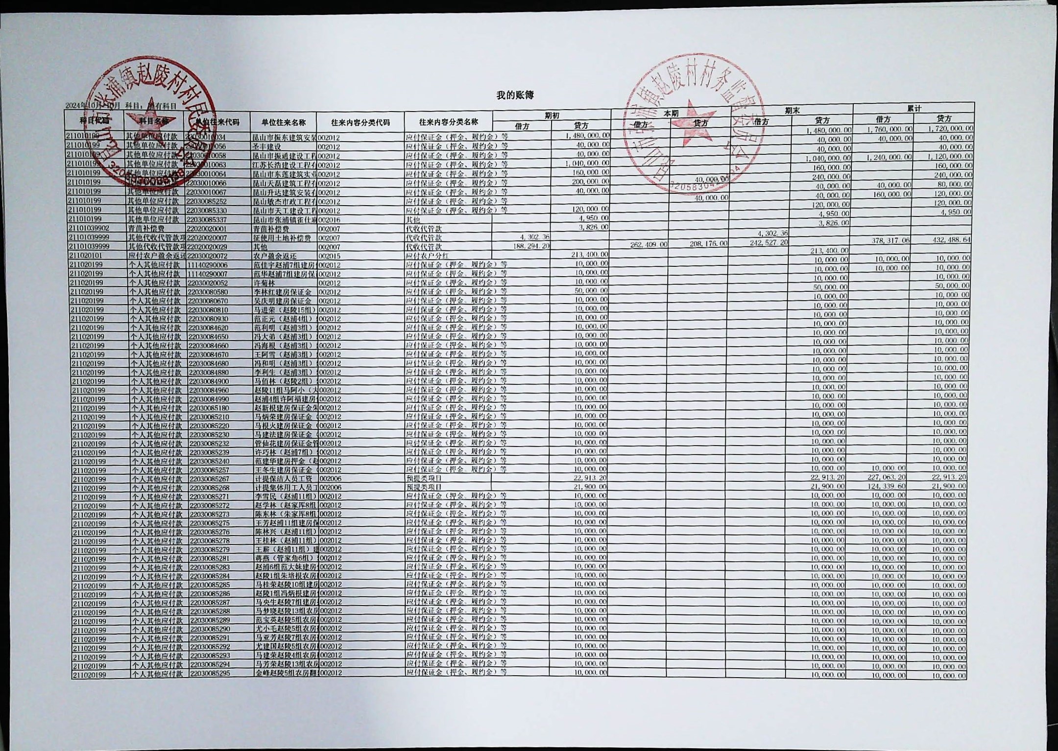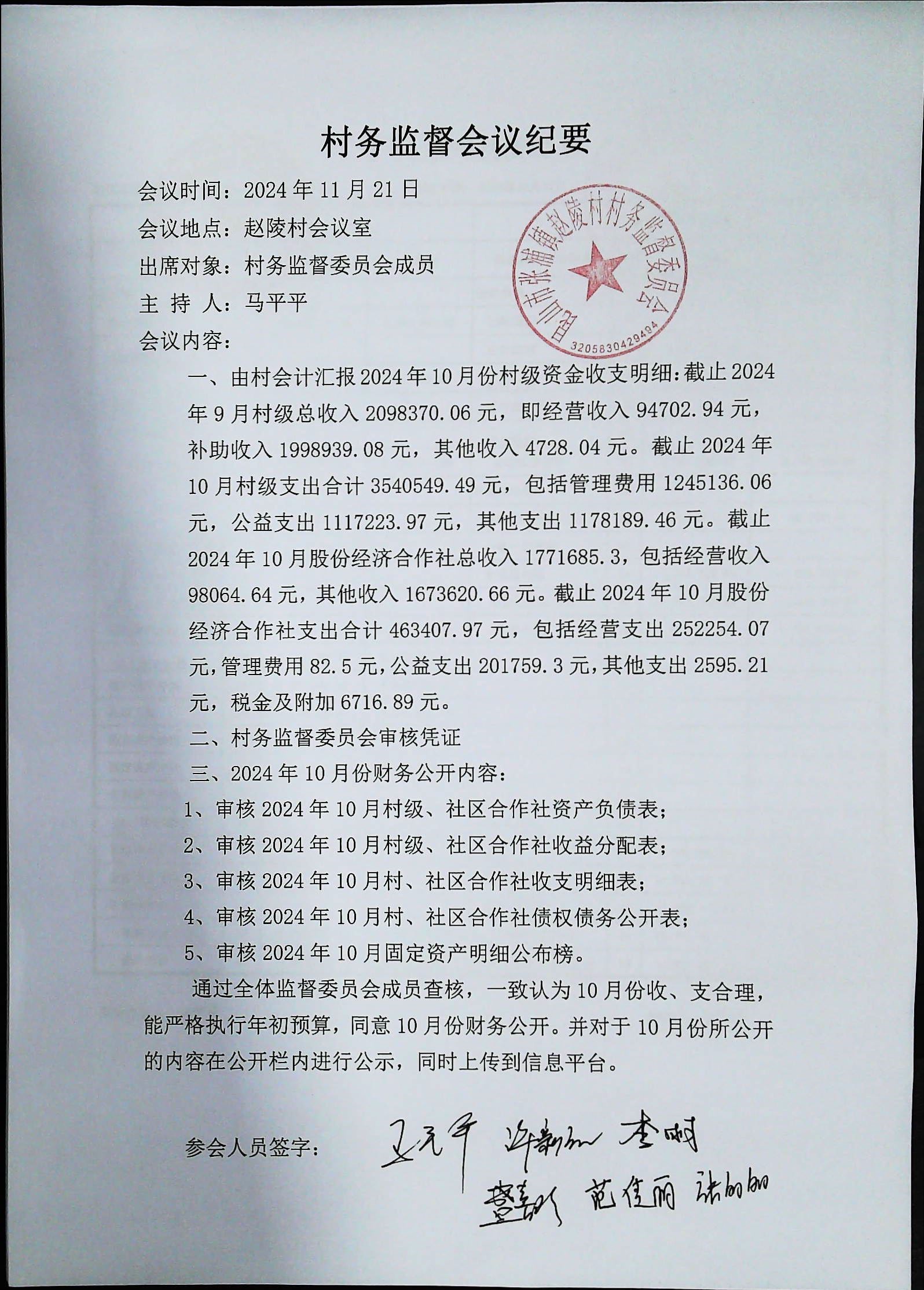 赵陵村2024年度10月份财务公开