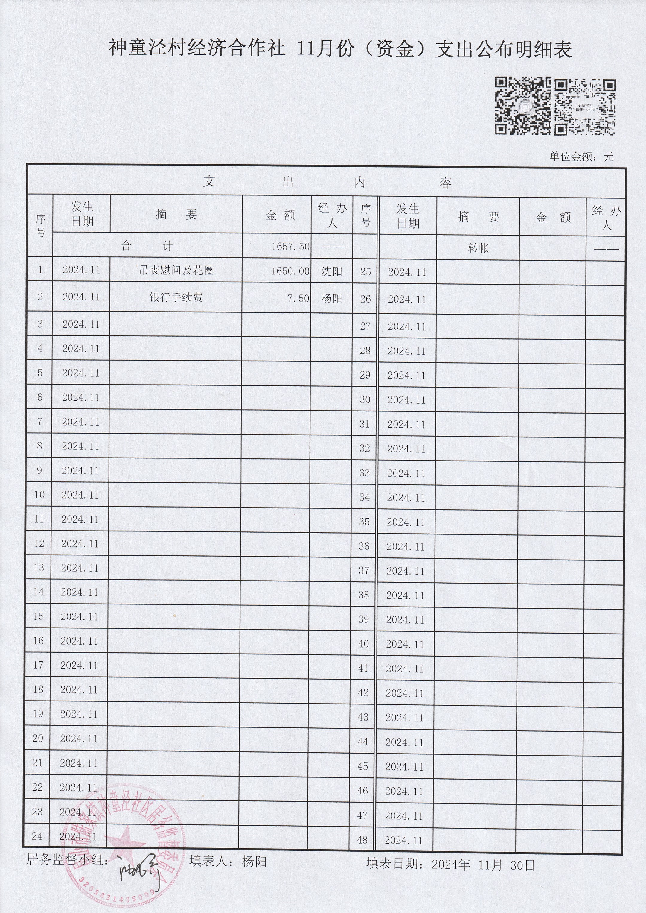 神童泾村股份经济合作社11月份(资金)收支公布明细表