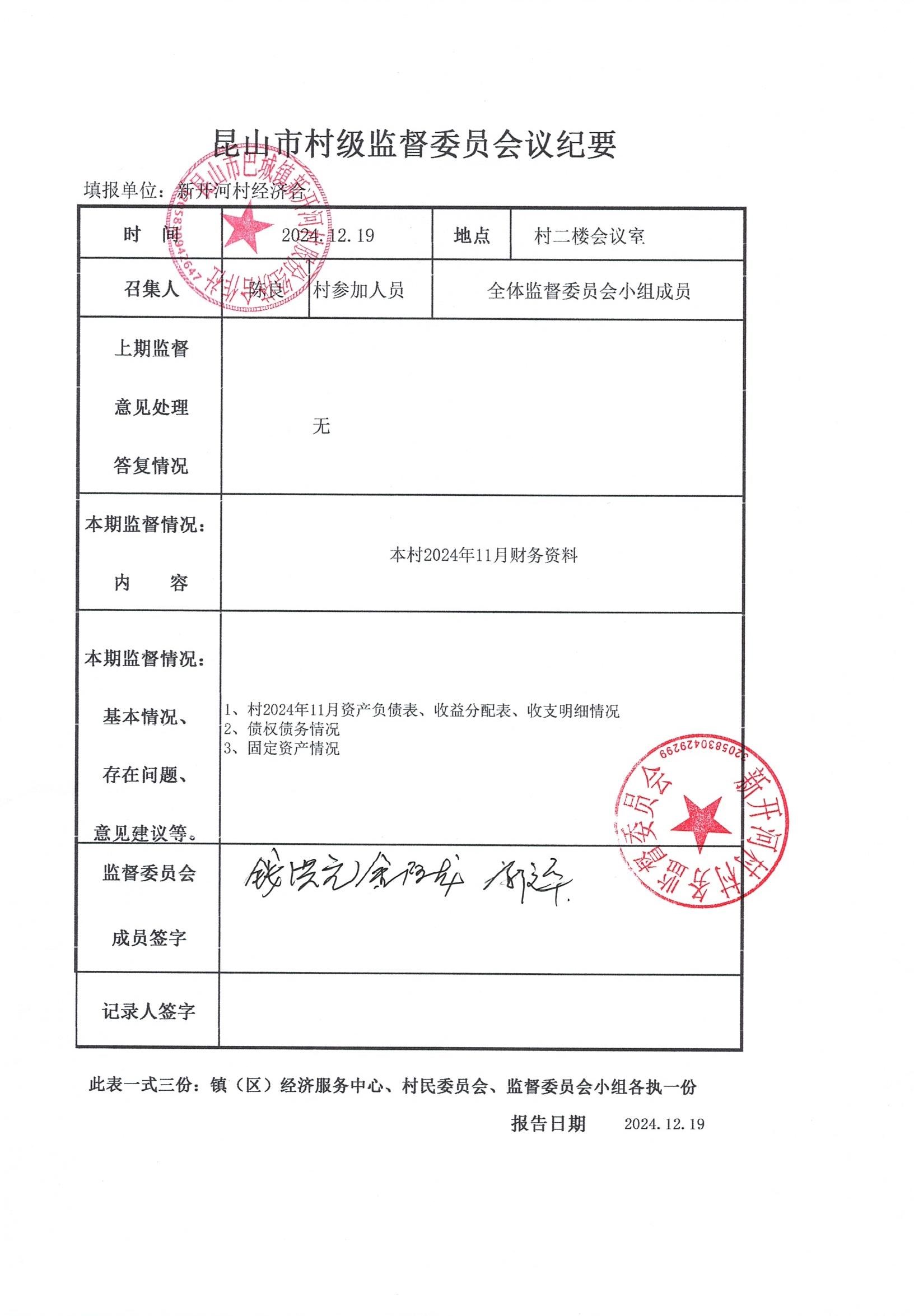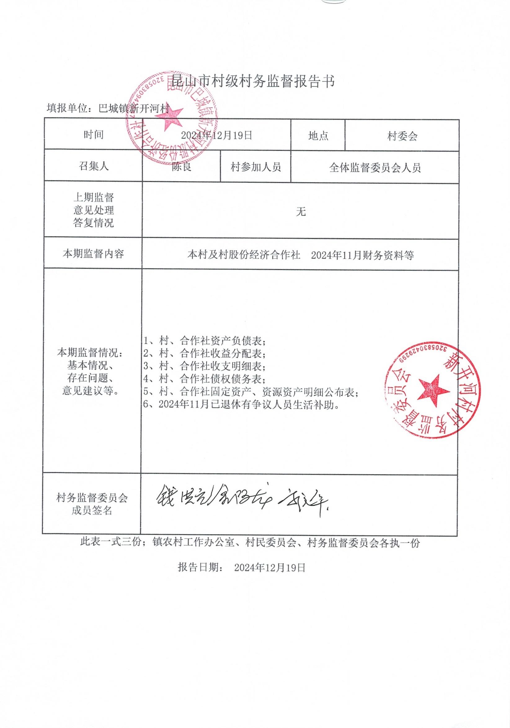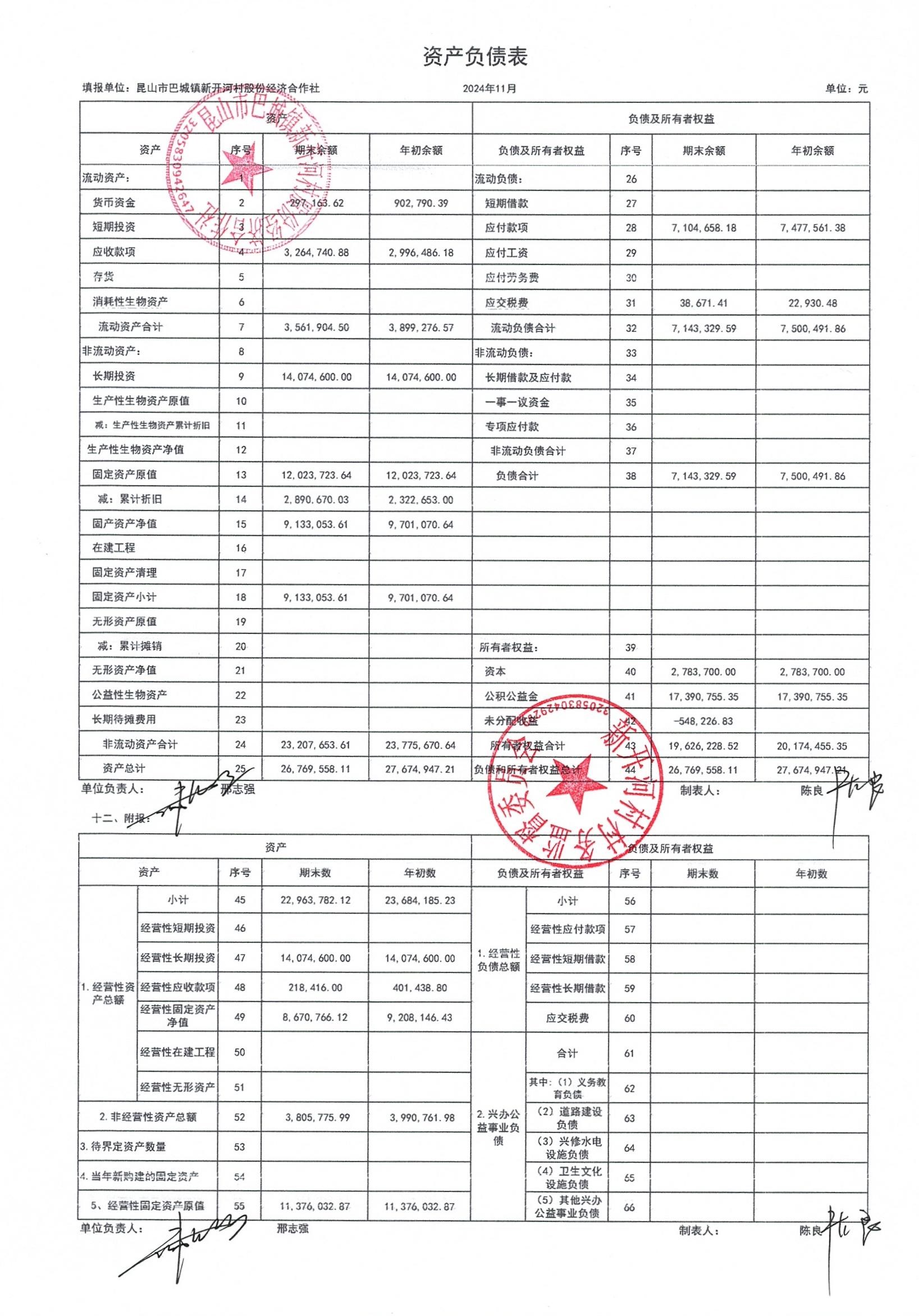新开河村股份经济合作社2024年11月财务公开