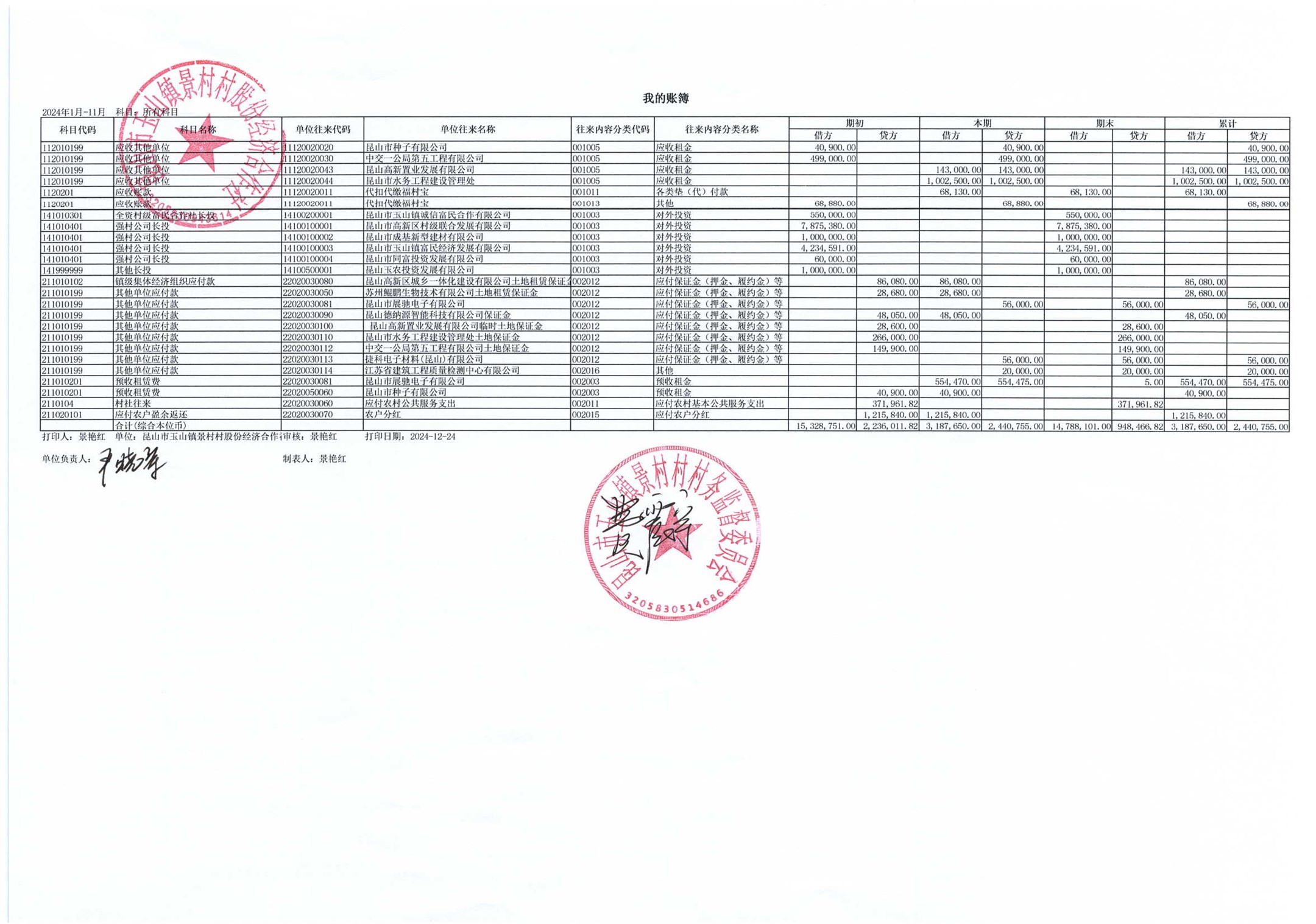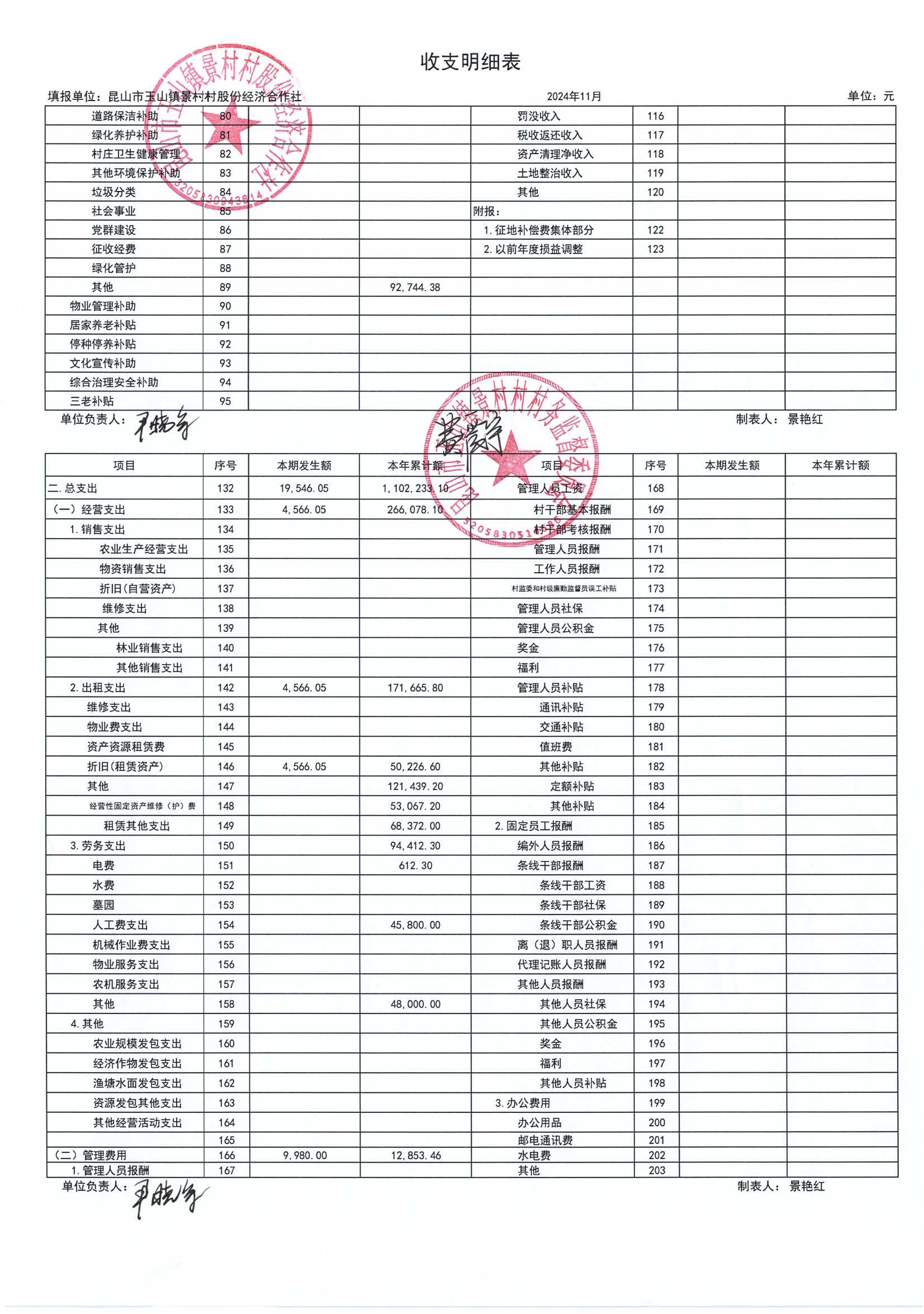高新区景村村股份经济合作社2024年12月财务公开: