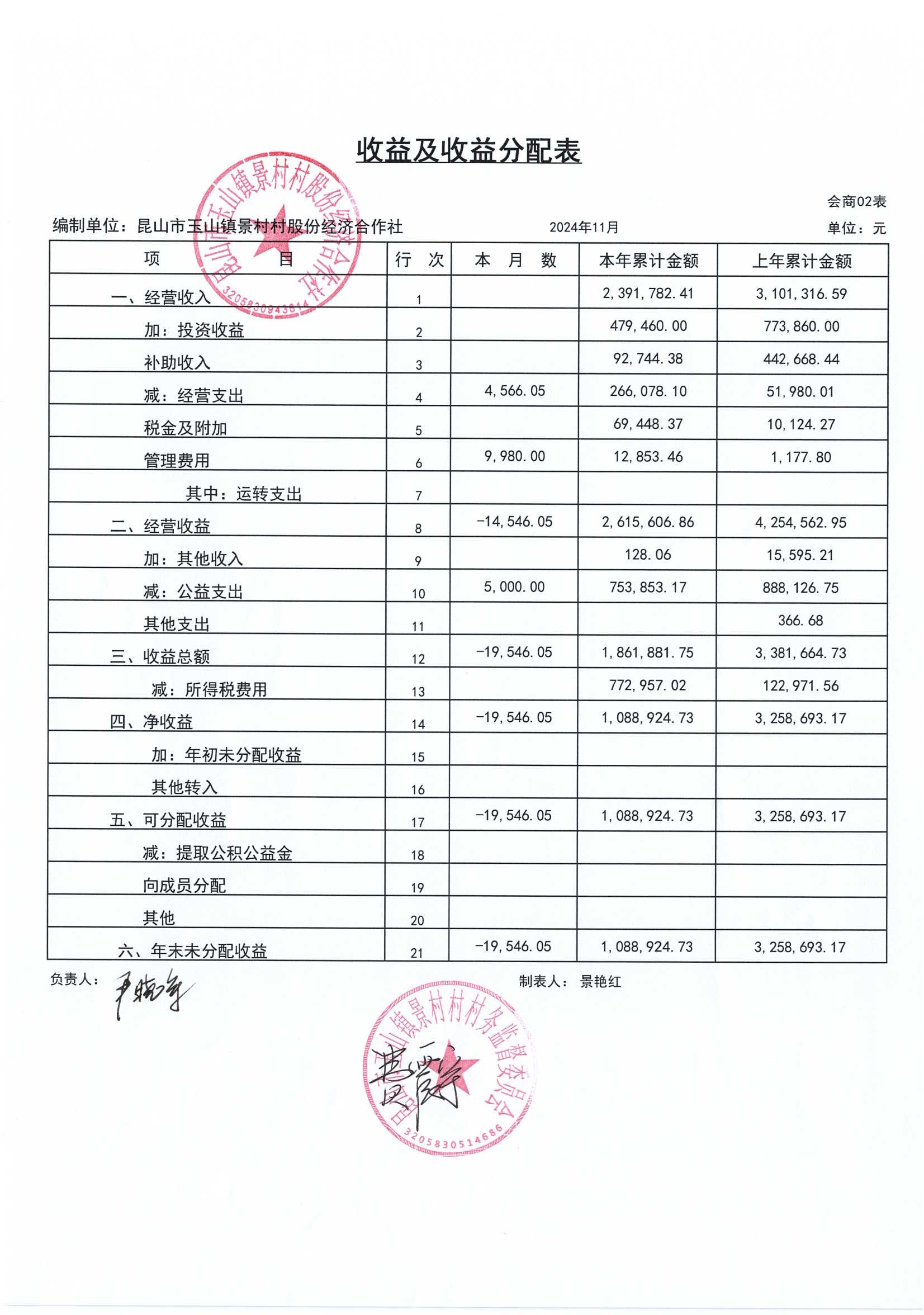 高新区景村村股份经济合作社2024年12月财务公开