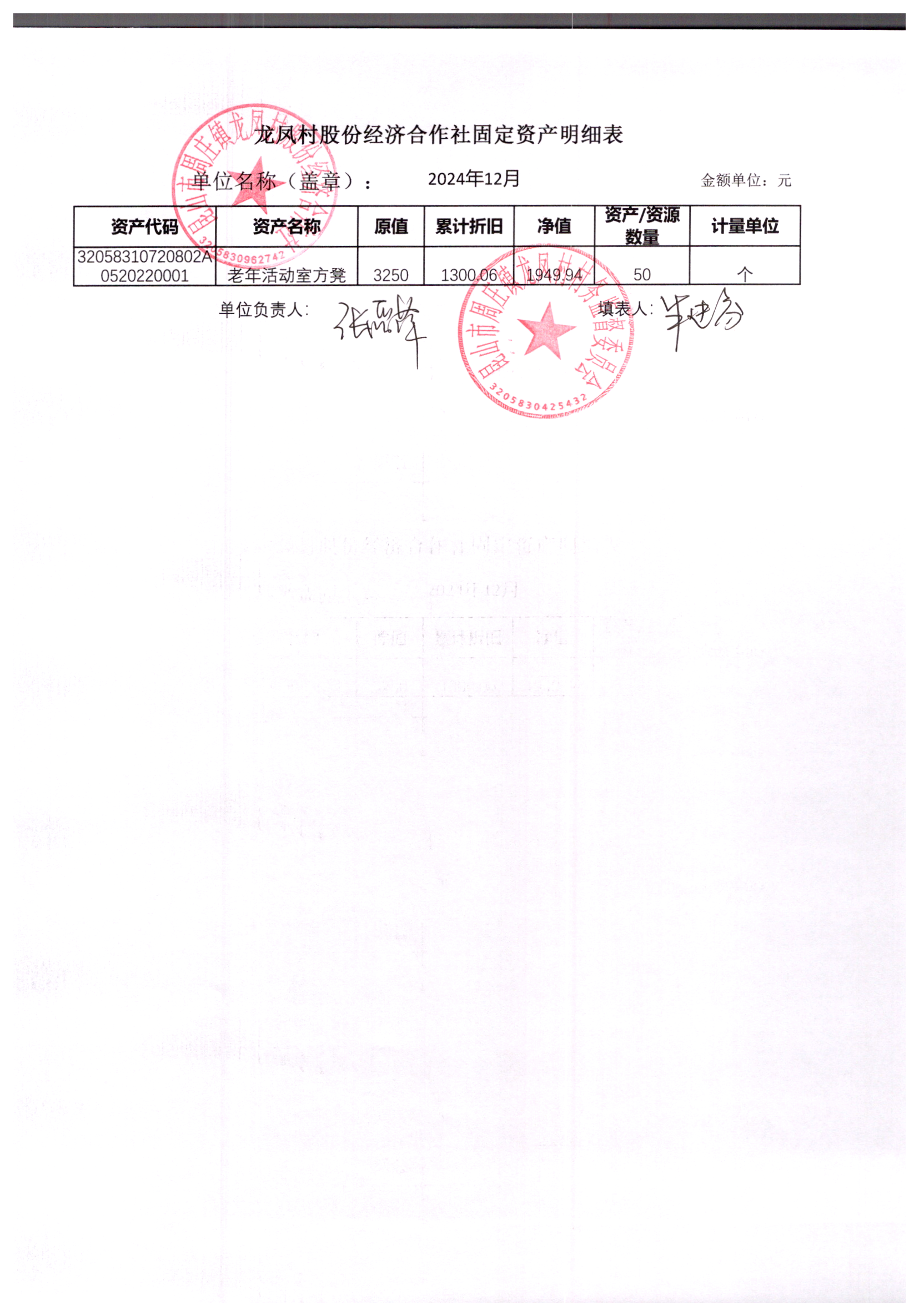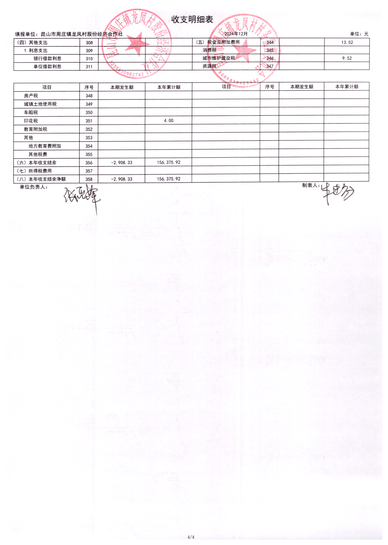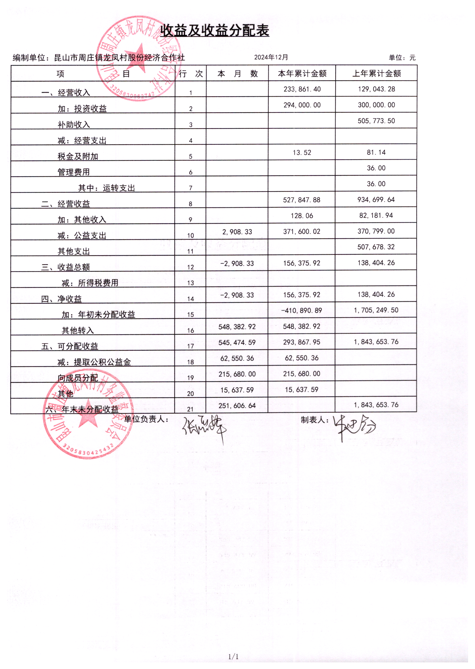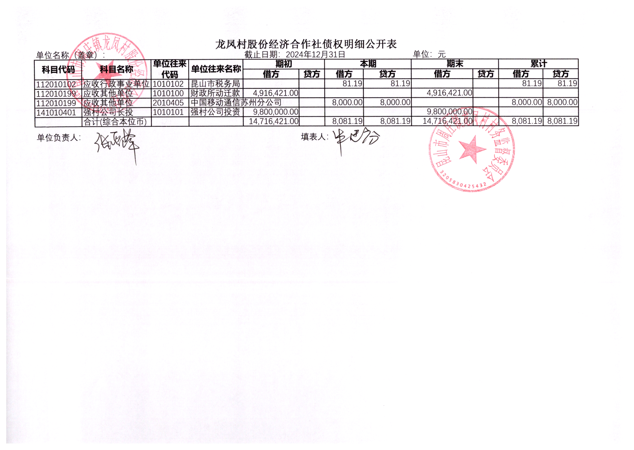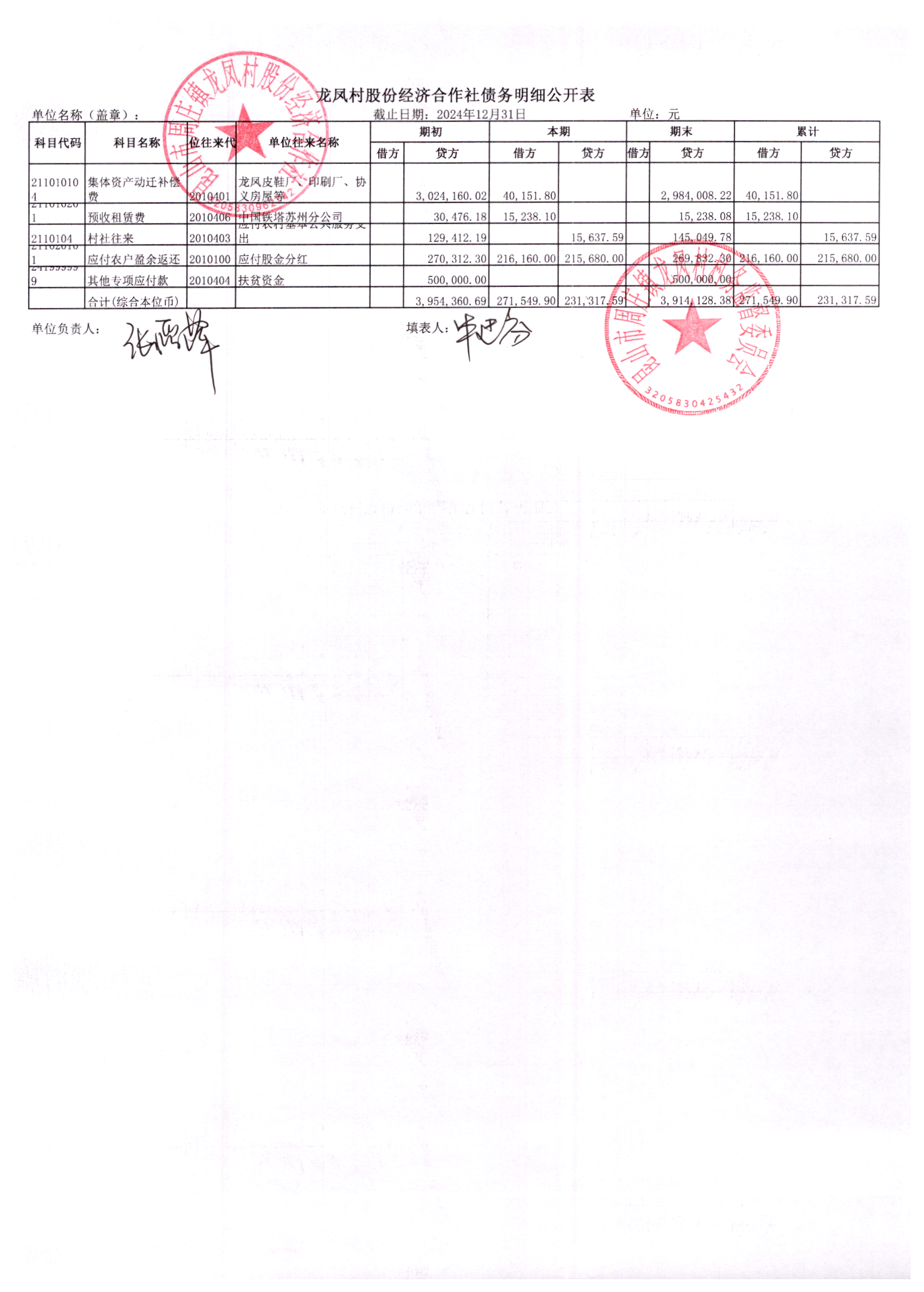 2024年龙凤村股份经济合作社12月份财务公开