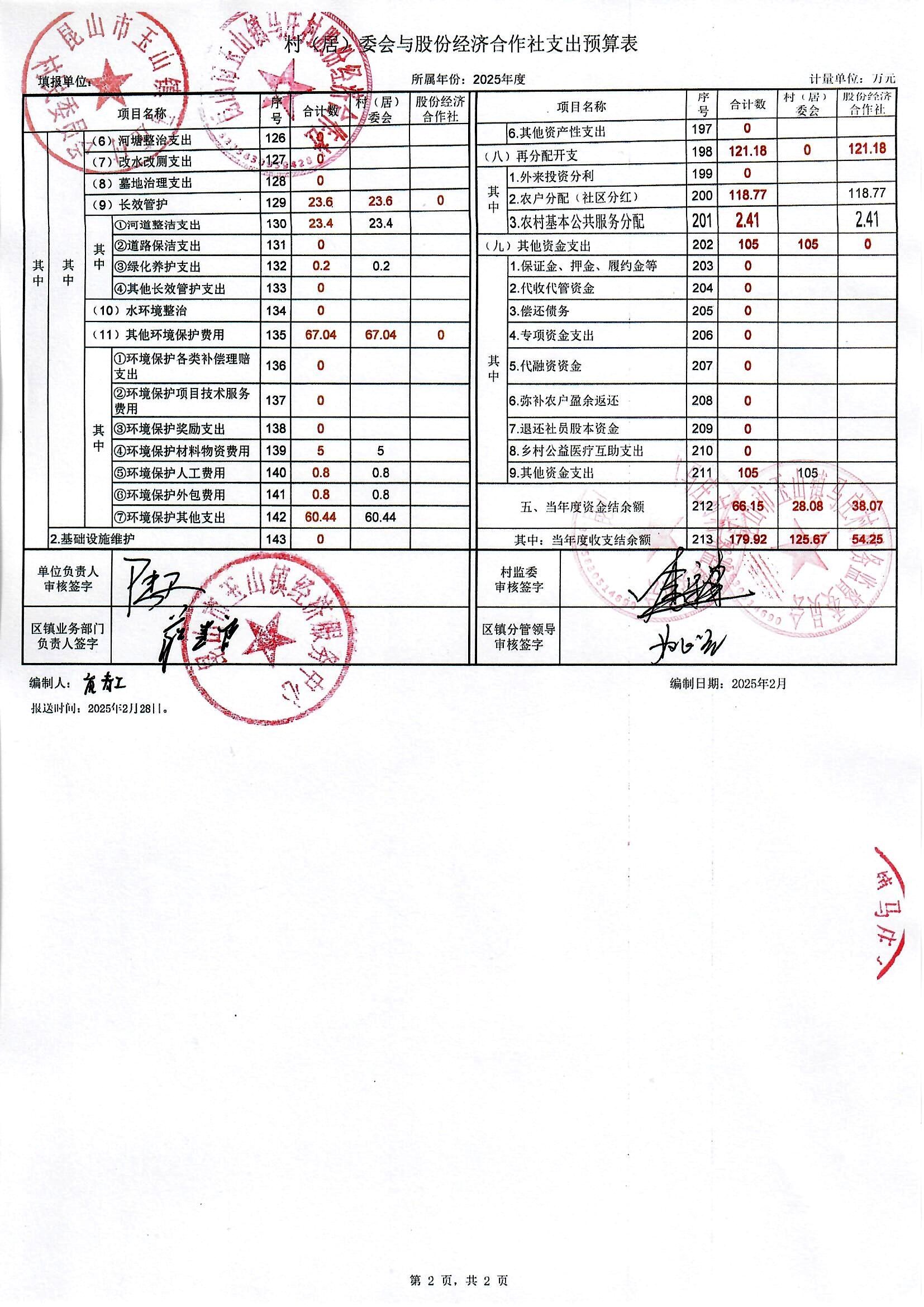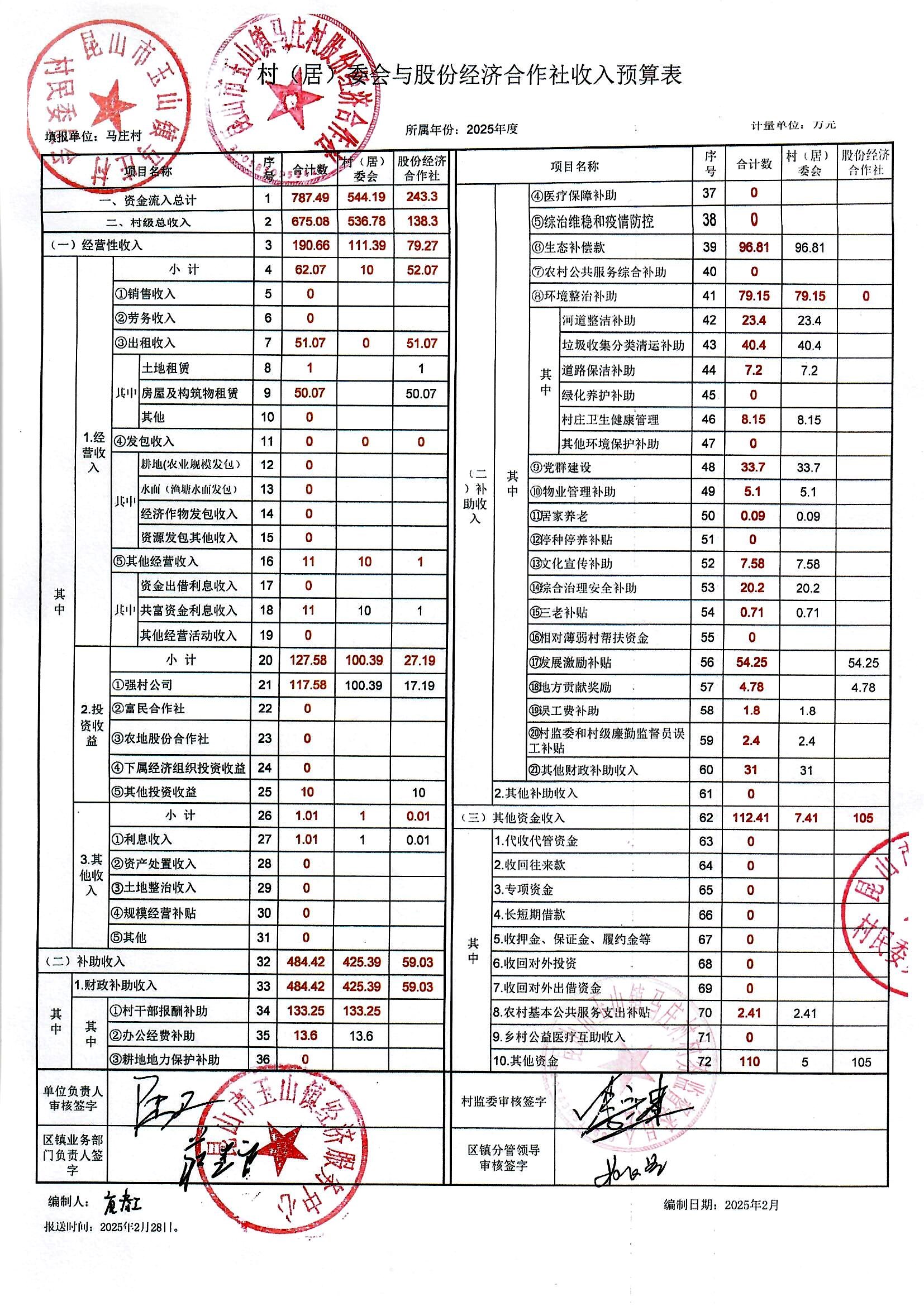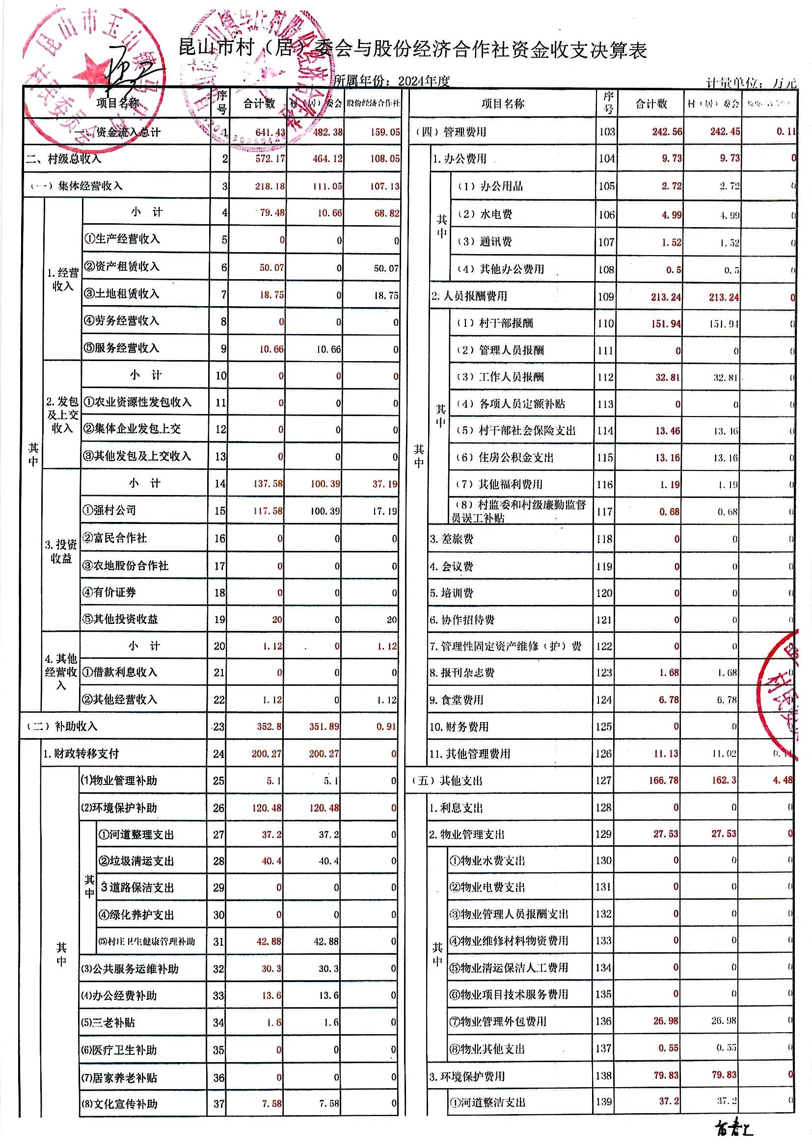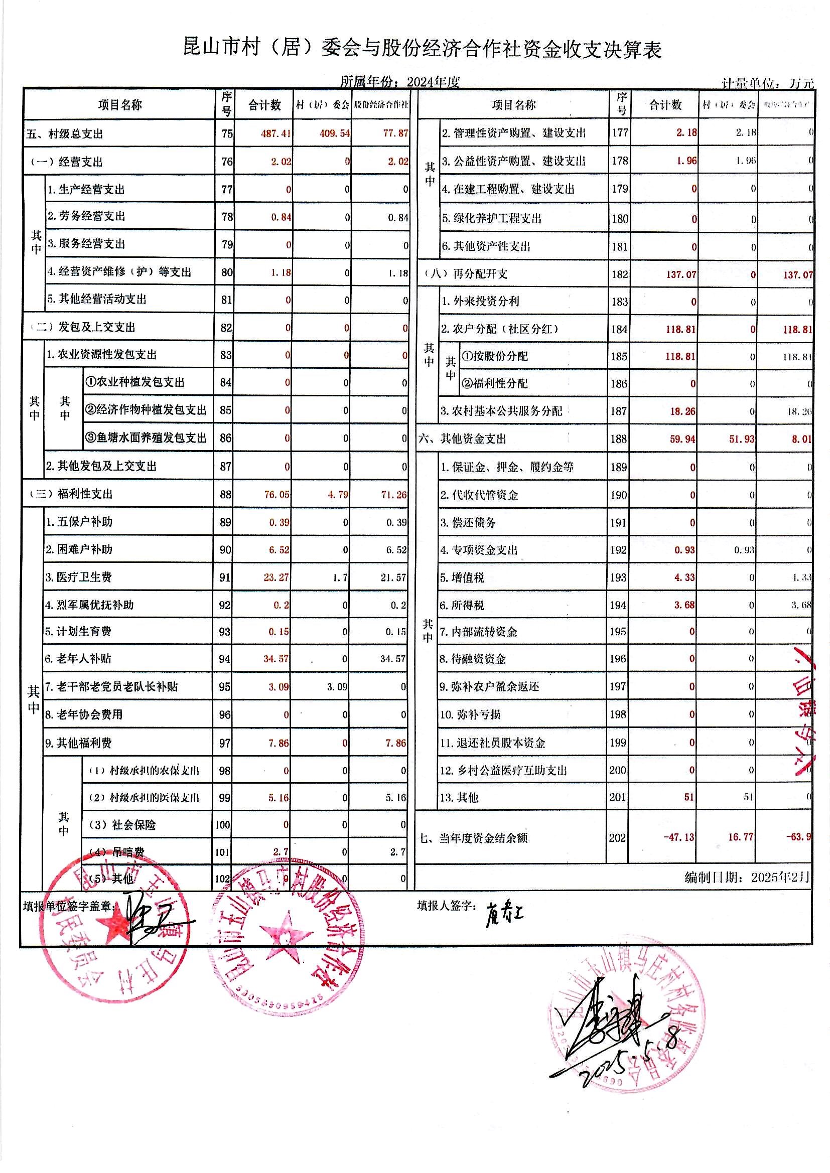 马庄村2024年收支决算表和2025年收支预算表