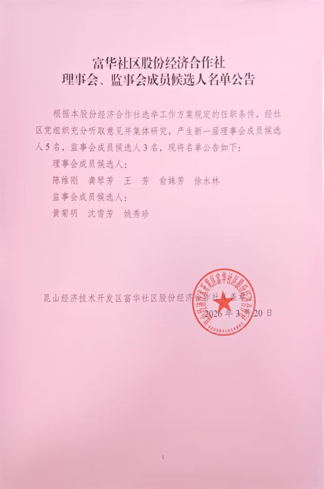富华社区股份经济合作社理事会、监事会成员候选名单第二次公告