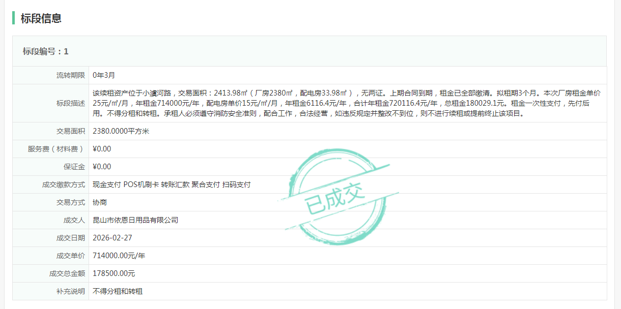农村集体资产流转交易结果公示(小澞河路187号-续租)