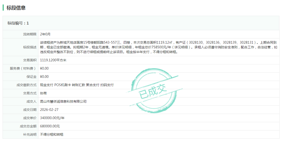 农村集体资产流转交易结果公示(15号楼朝阳路543-557三、四楼续租)