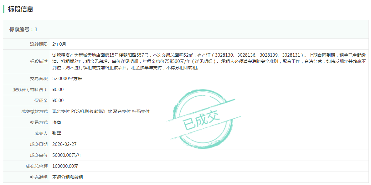农村集体资产流转交易结果公示(15号楼朝阳路557号-续租)