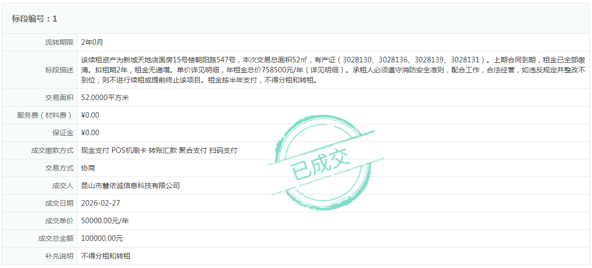 农村集体资产流转交易结果公示(15号楼朝阳路547号-续租)