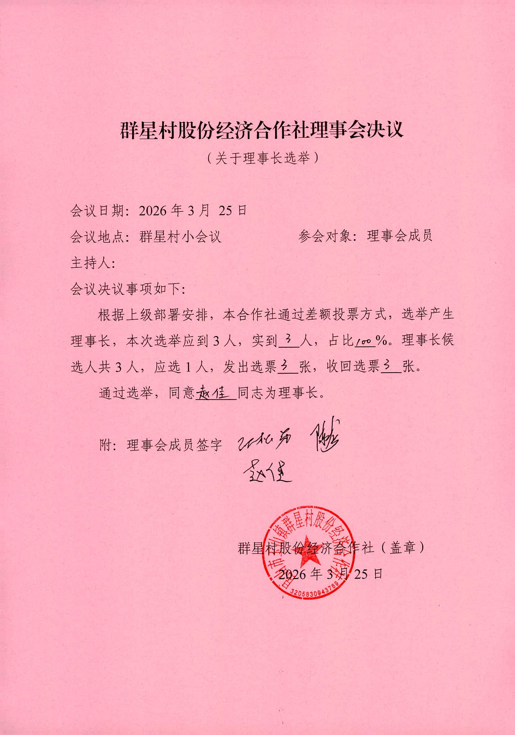 群星村股份经济合作社理事会决议(关于理事长选举)