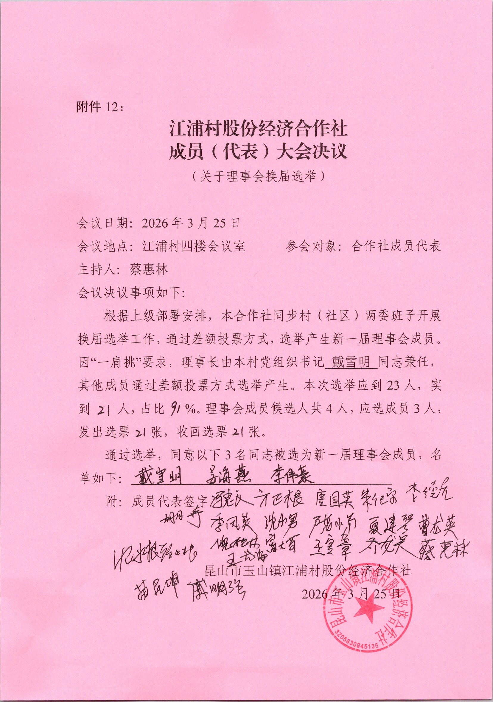 江浦村股份经济合作社成员(代表)大会决议(关于理事会换届选举)