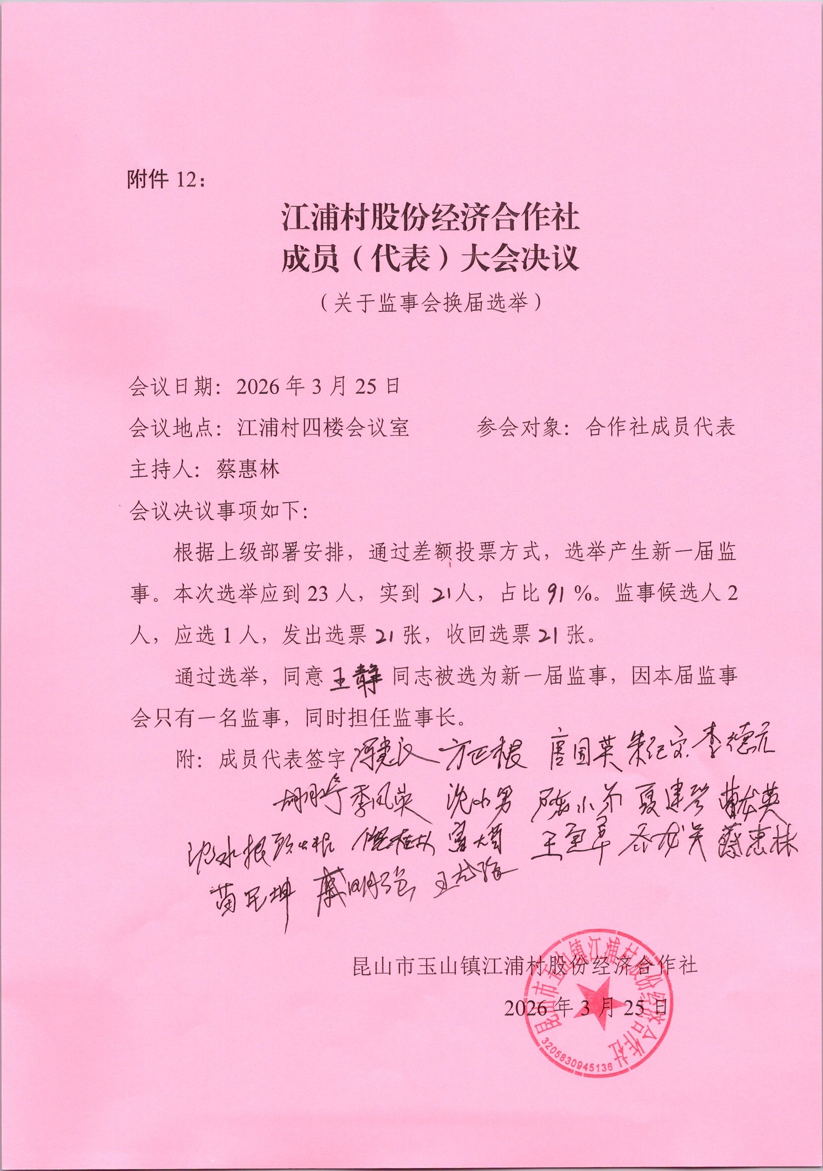 江浦村股份经济合作社成员(代表)大会决议(关于监事会换届选举)