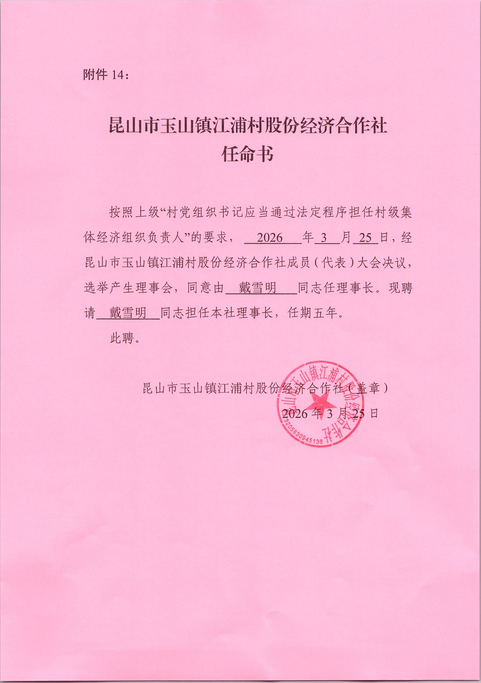 昆山市玉山镇江浦村股份经济合作社任命书