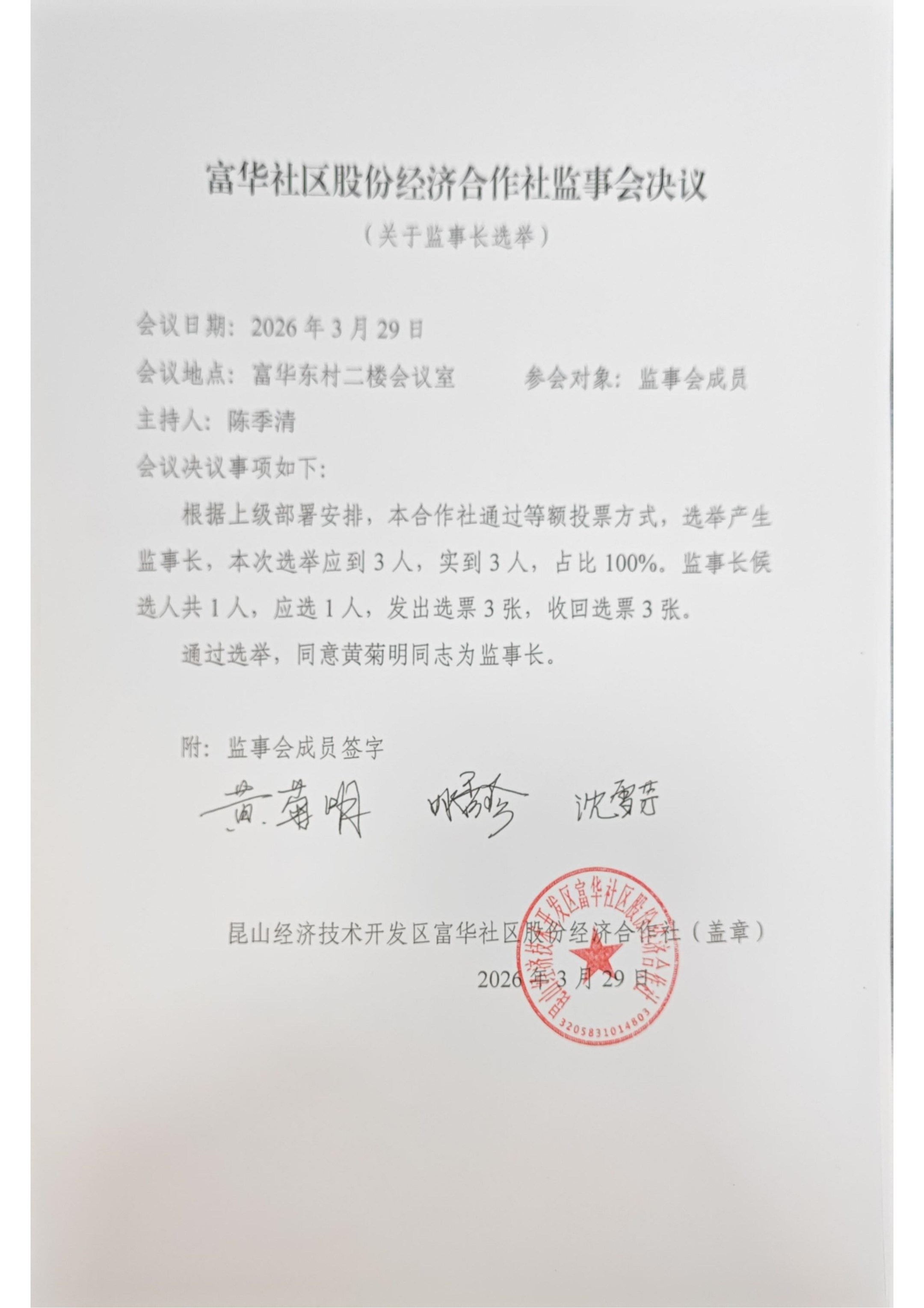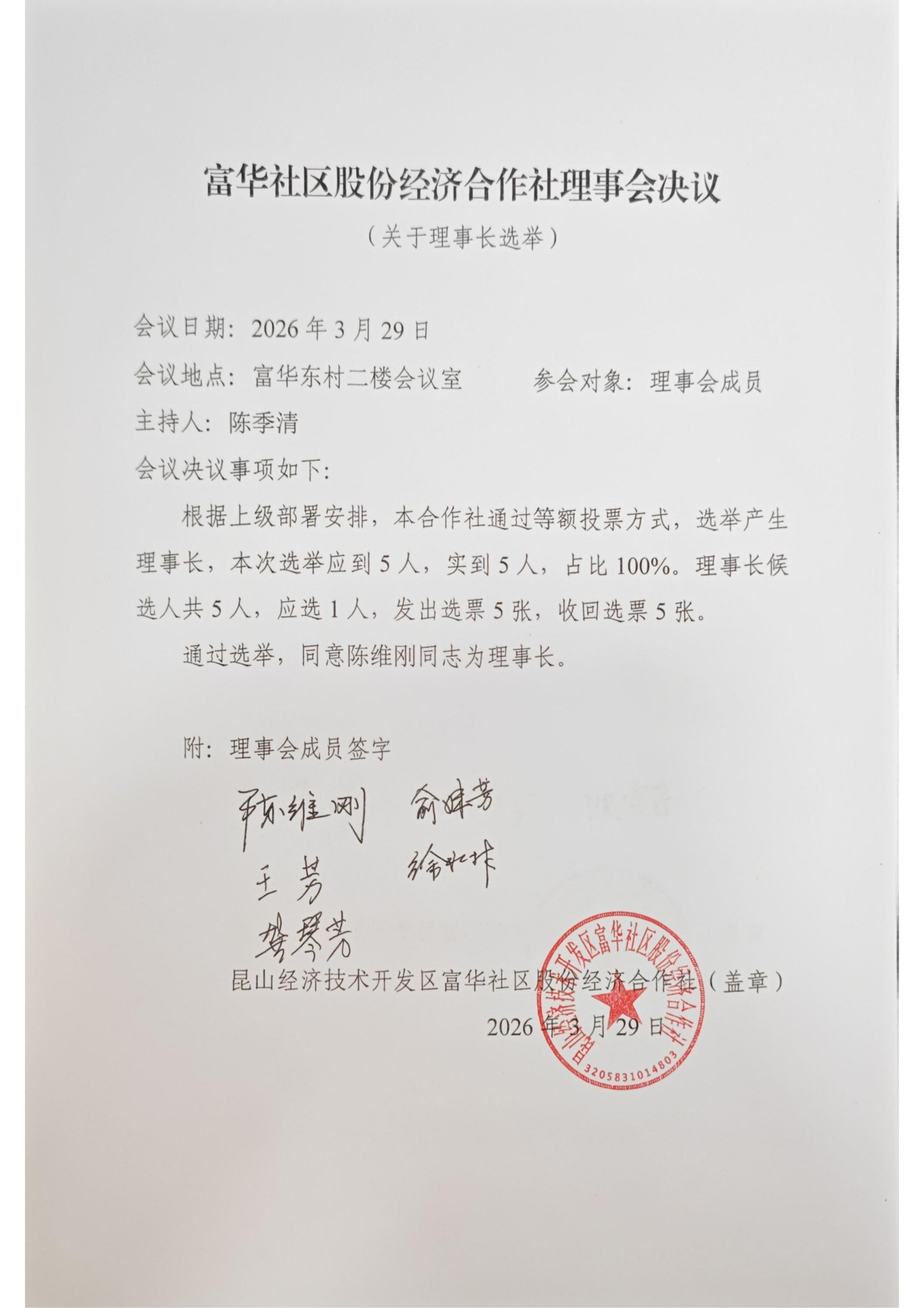 富华社区股份经济合作社理事会、监事会决议(理事长、监事长换届)
