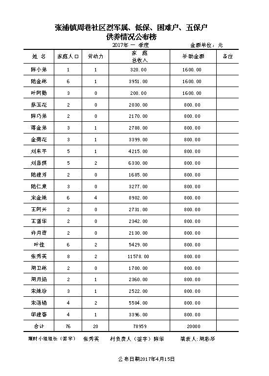 烈军属、低保、困难户、五保户 供养情况公布榜(2017年第一季度)