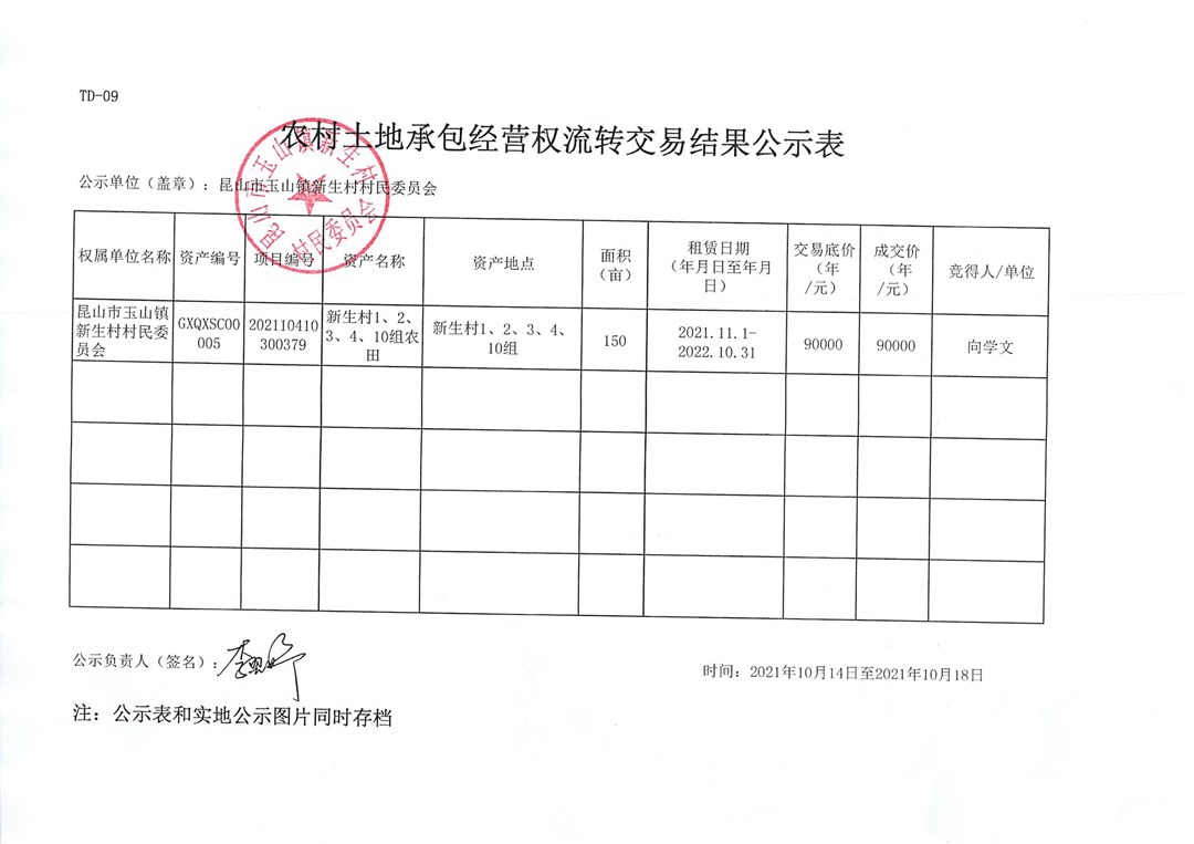 农村土地租赁经营权流转交易结果公示(新生村1、2、3、4、10组农田)