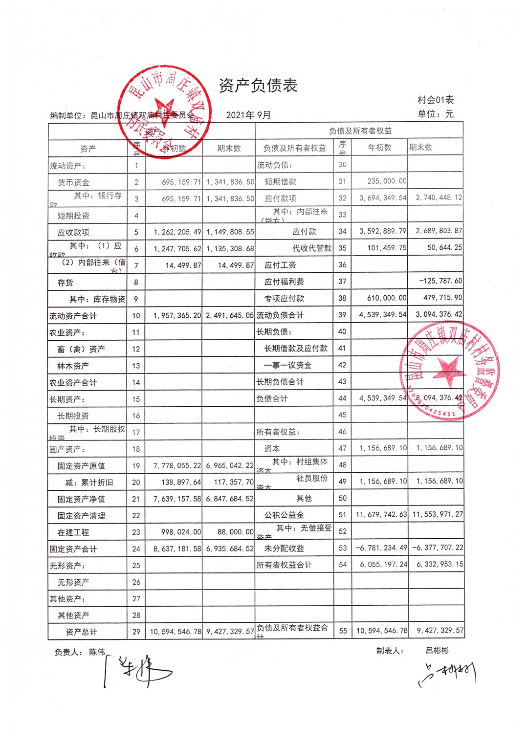 2021年第三季度财务公开-双庙村资产负债表(村)