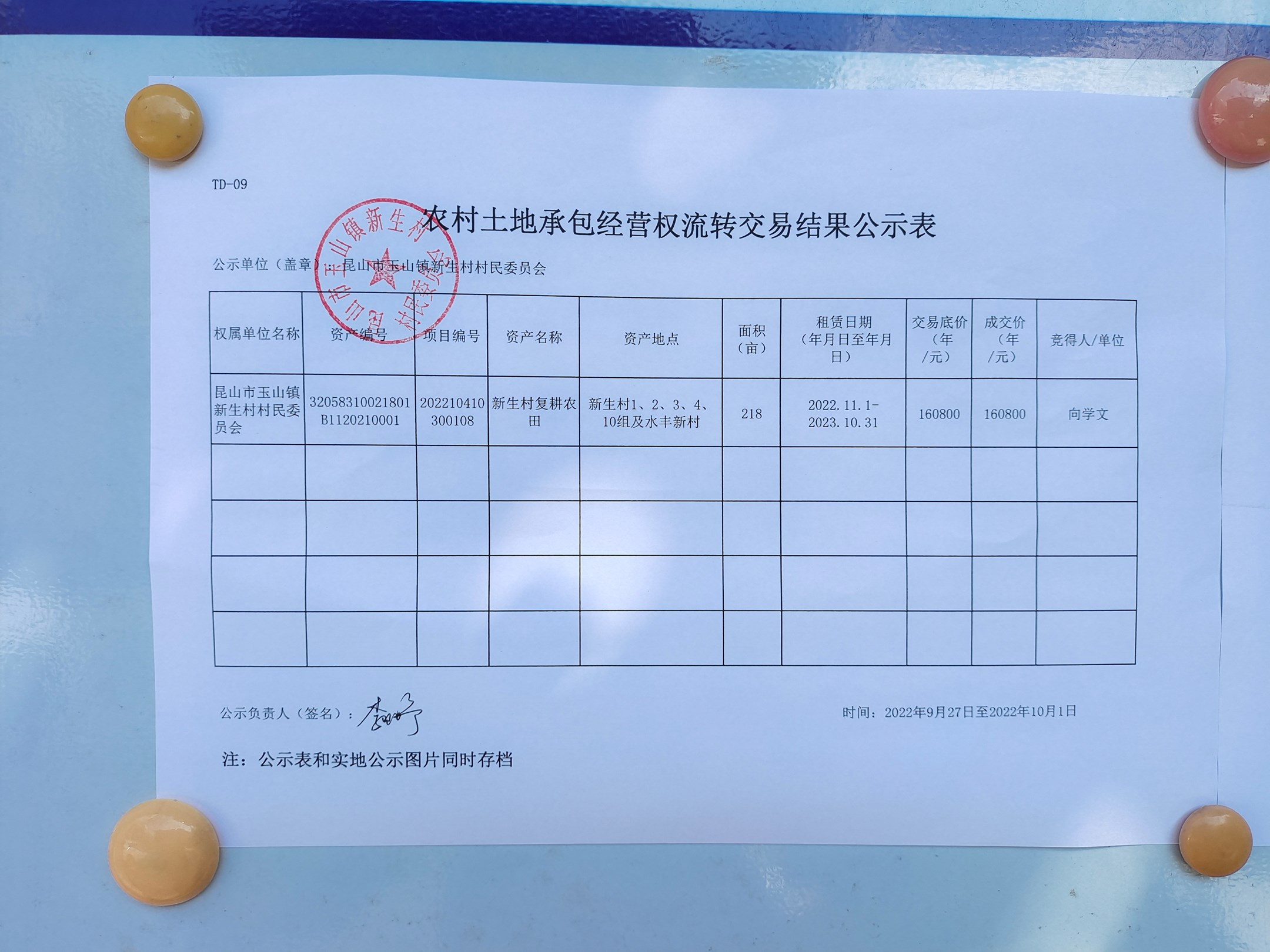农村土地承包经营权流转交易结果公示表(复耕农田)