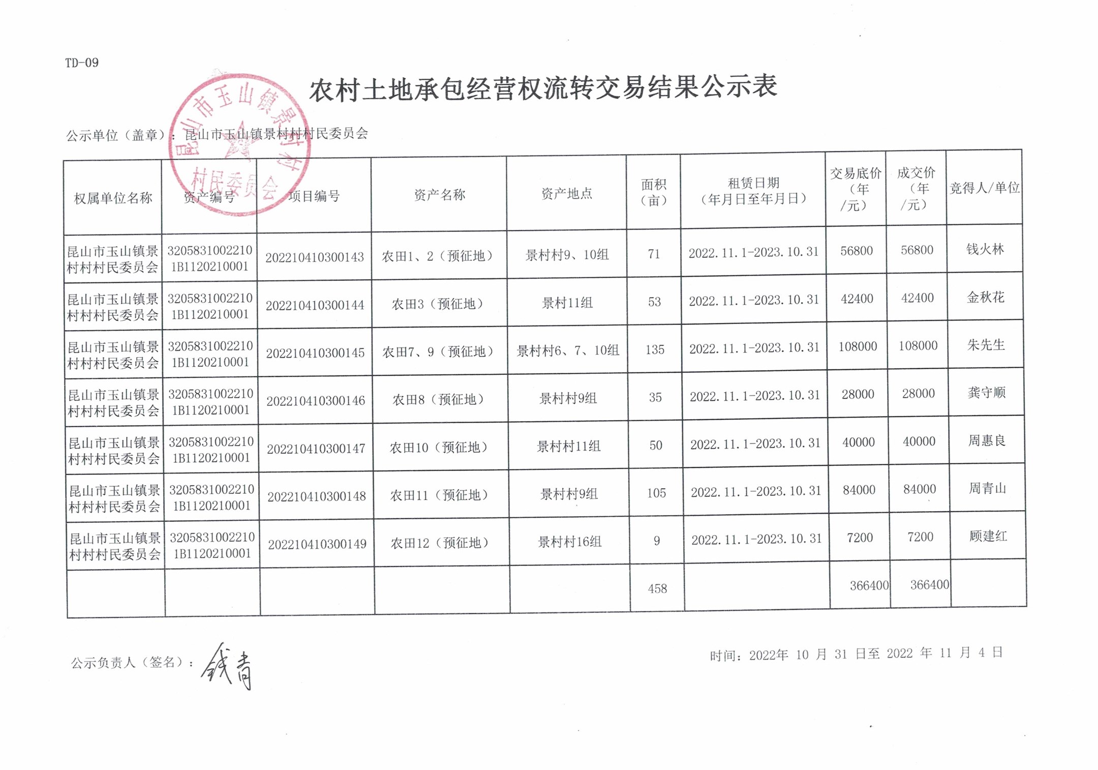 高新区景村村2023年土地承包经营权流转交易结果公示-农田