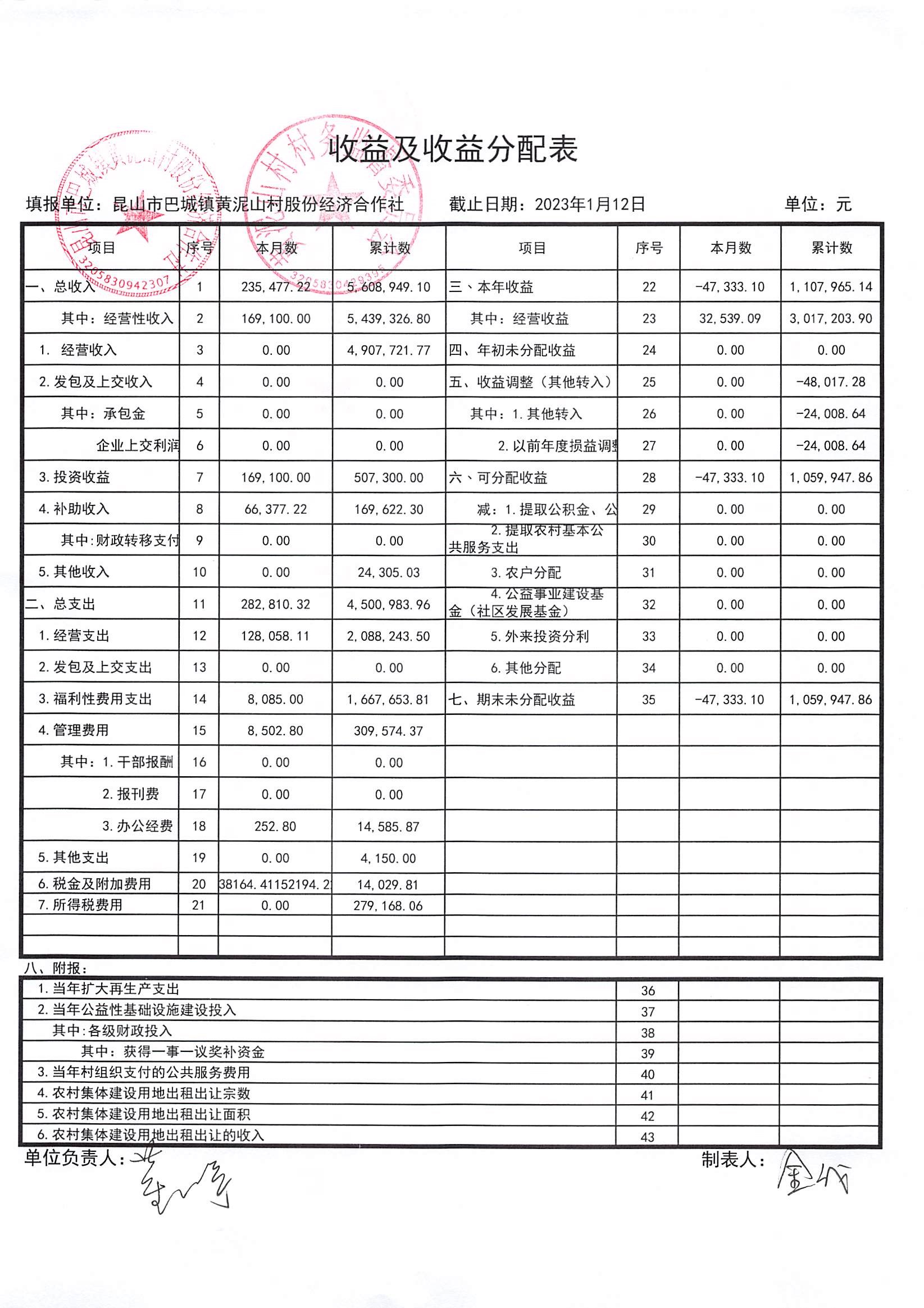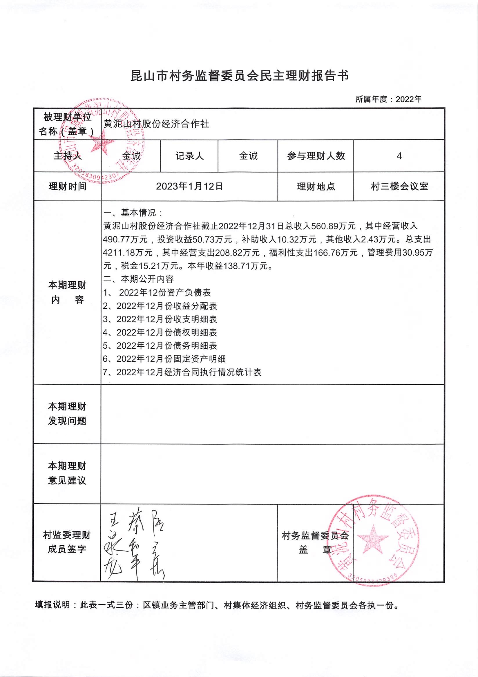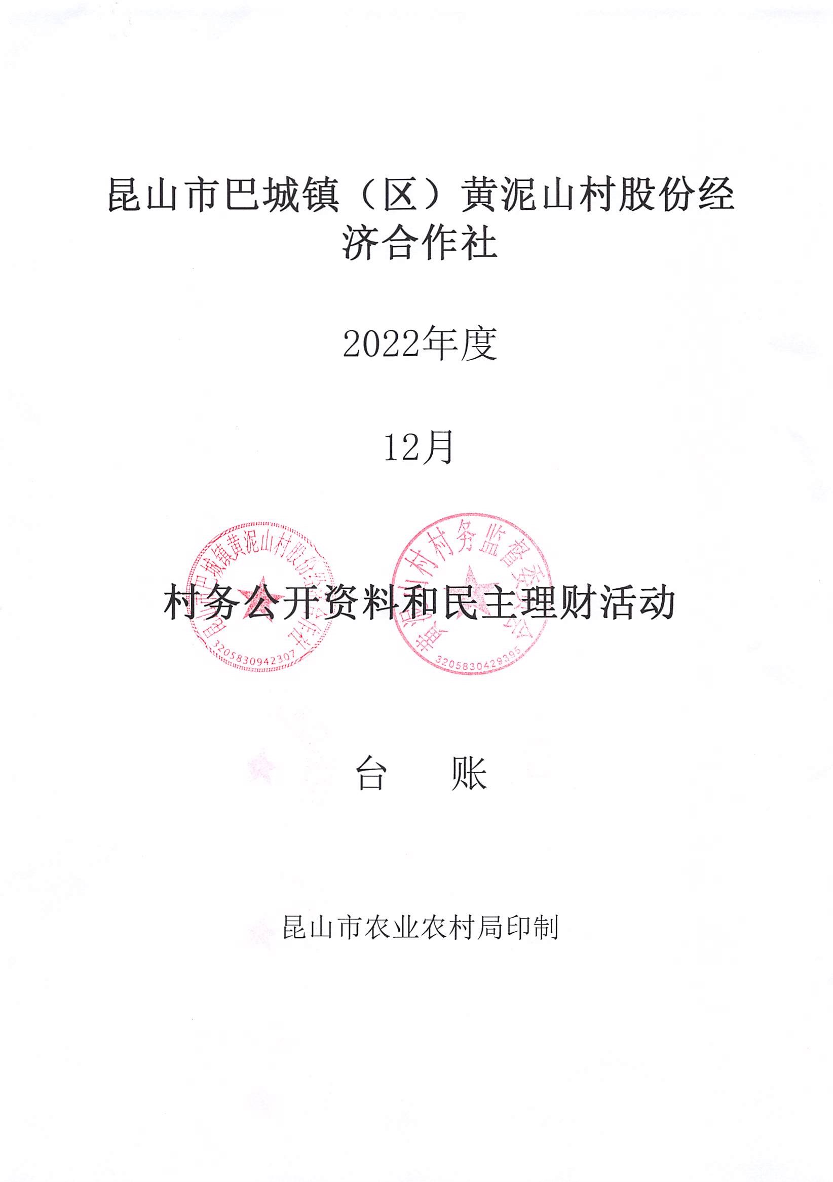 黄泥山村股份经济合作社12月份财务公开