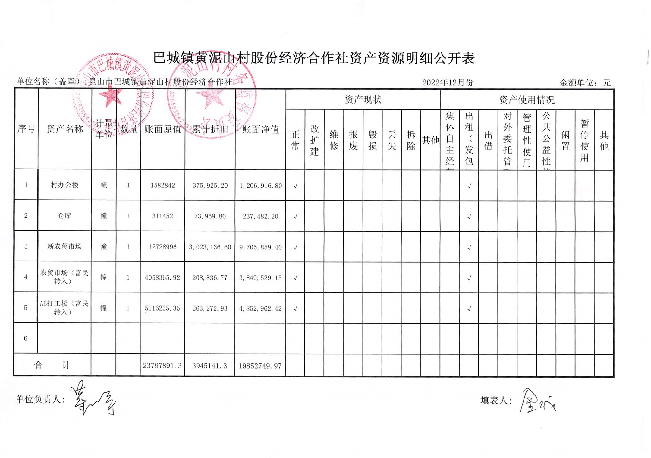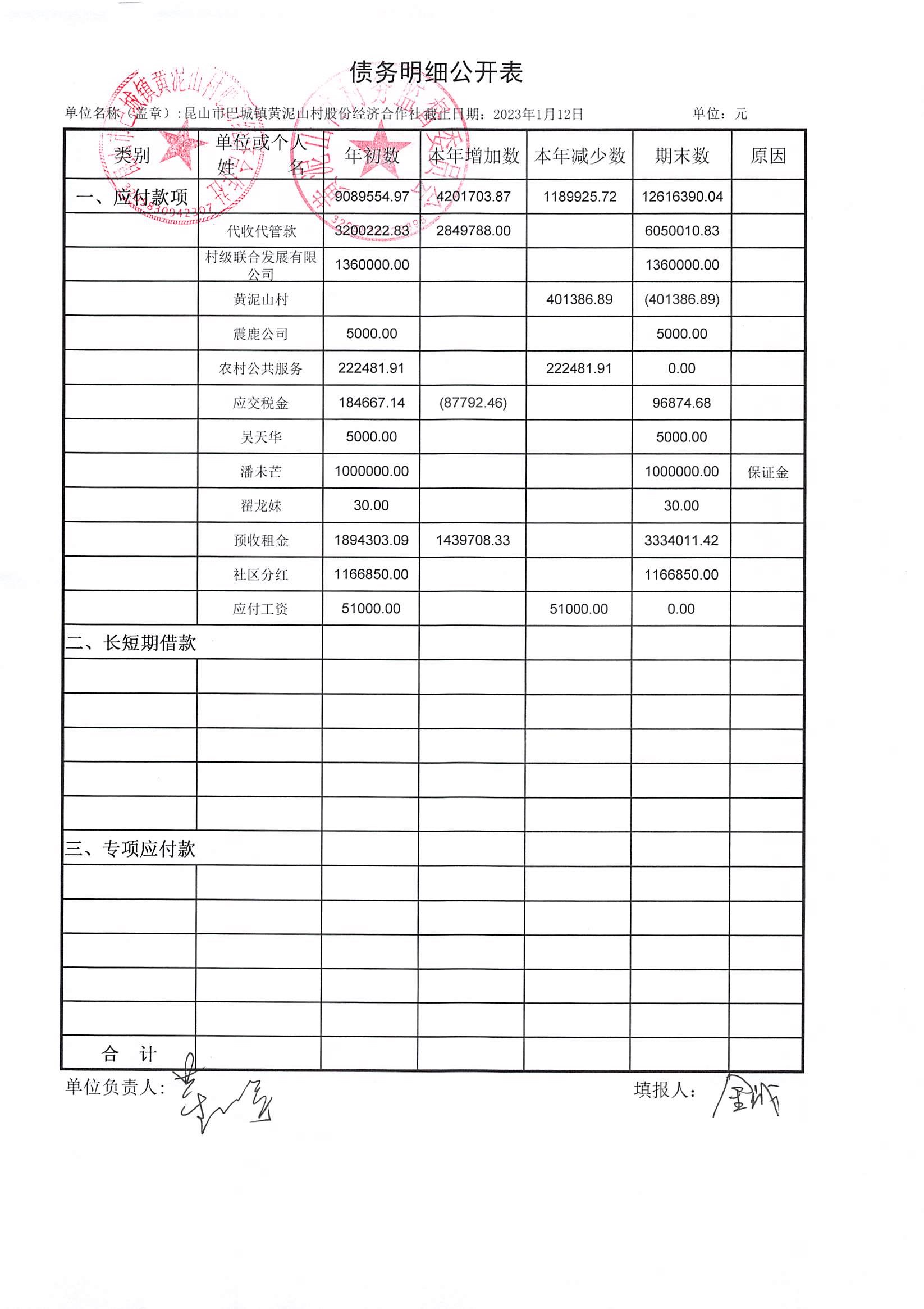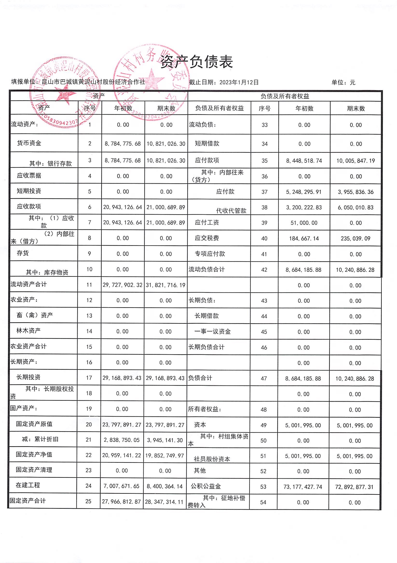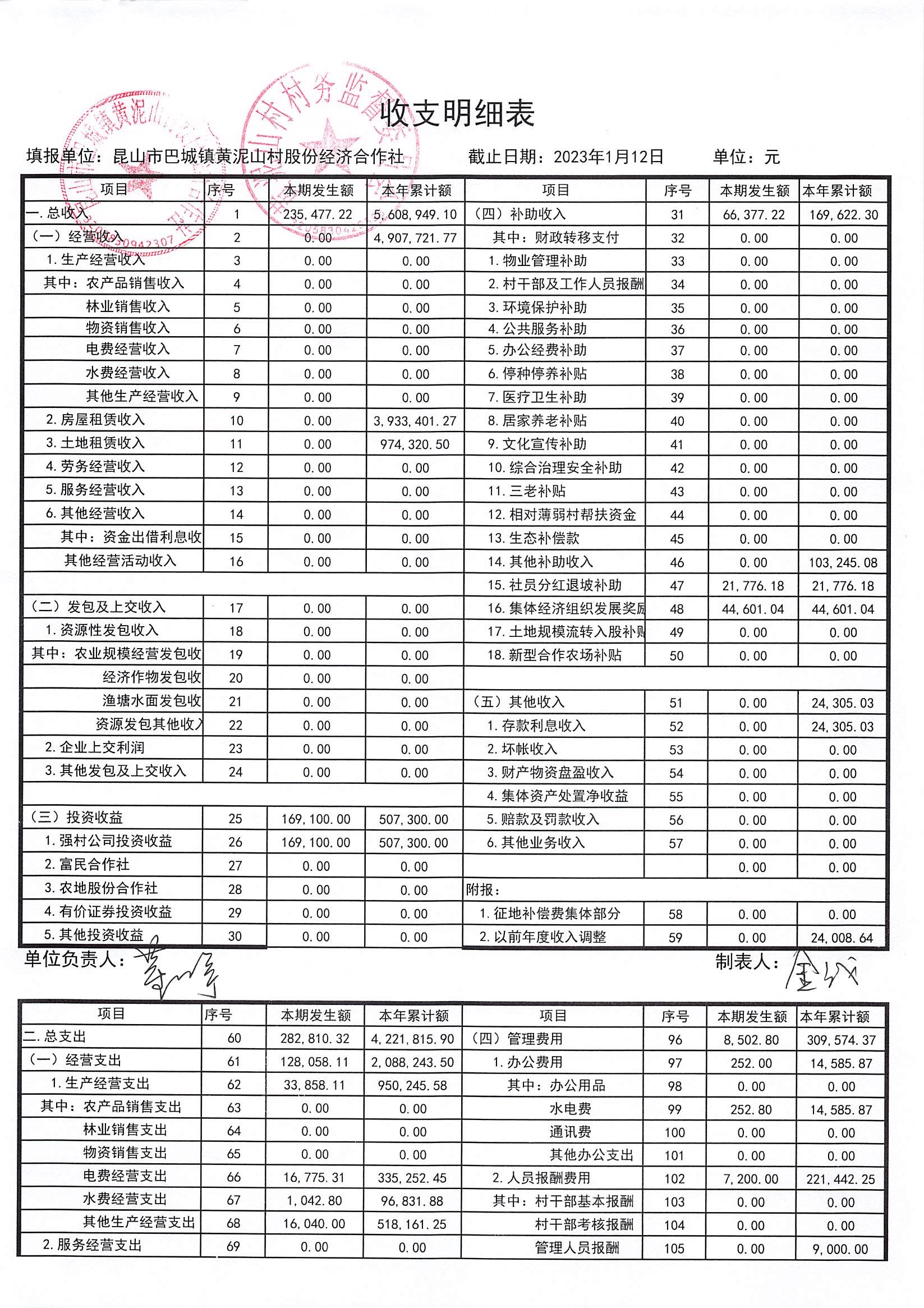 黄泥山村股份经济合作社12月份财务公开