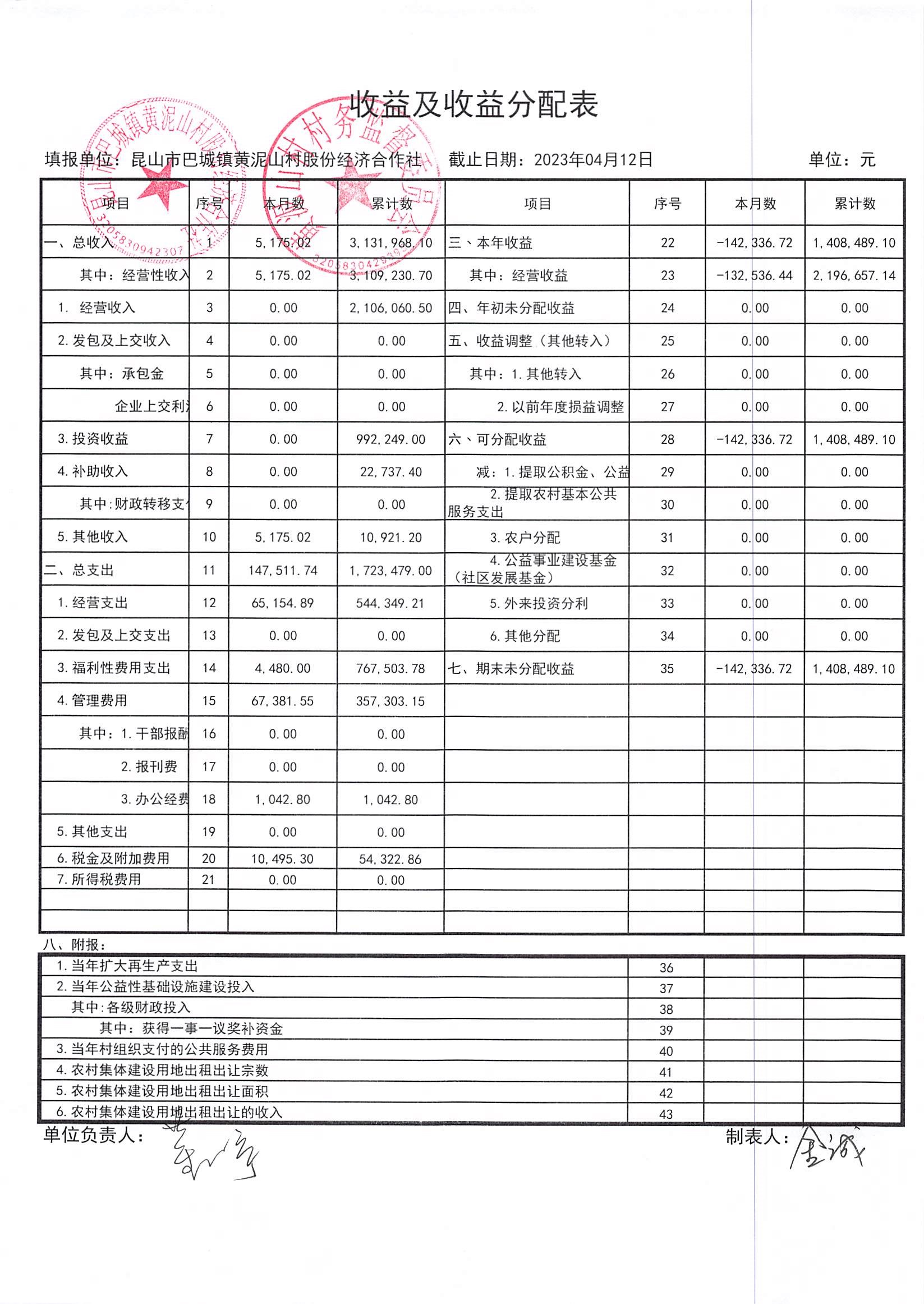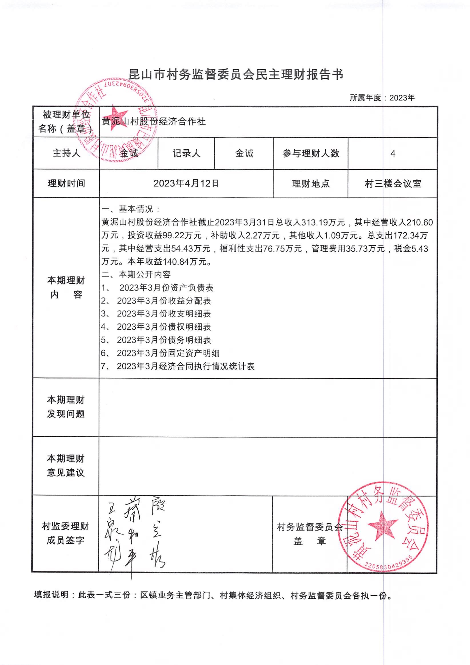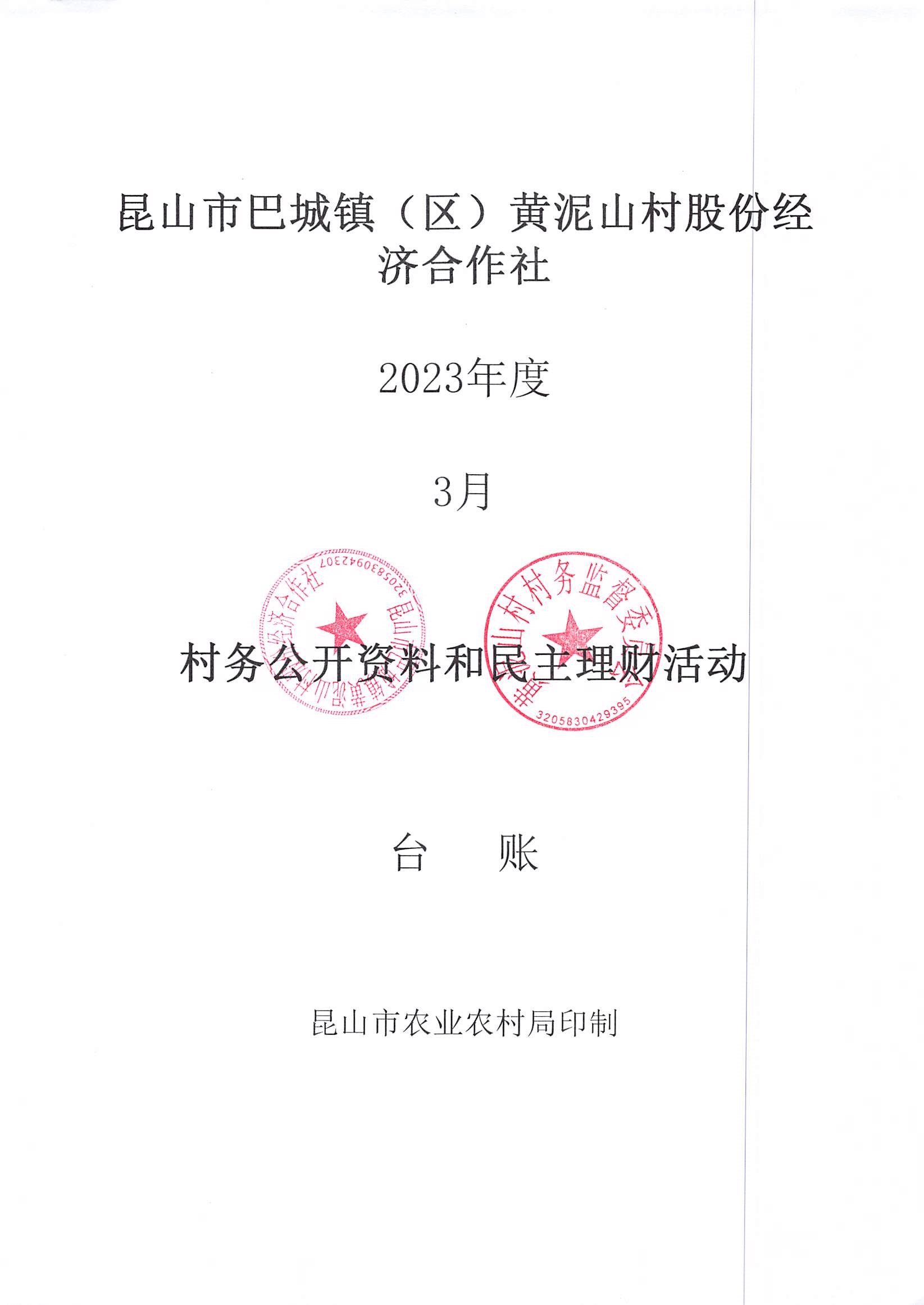 黄泥山村股份经济合作社3月份财务公开