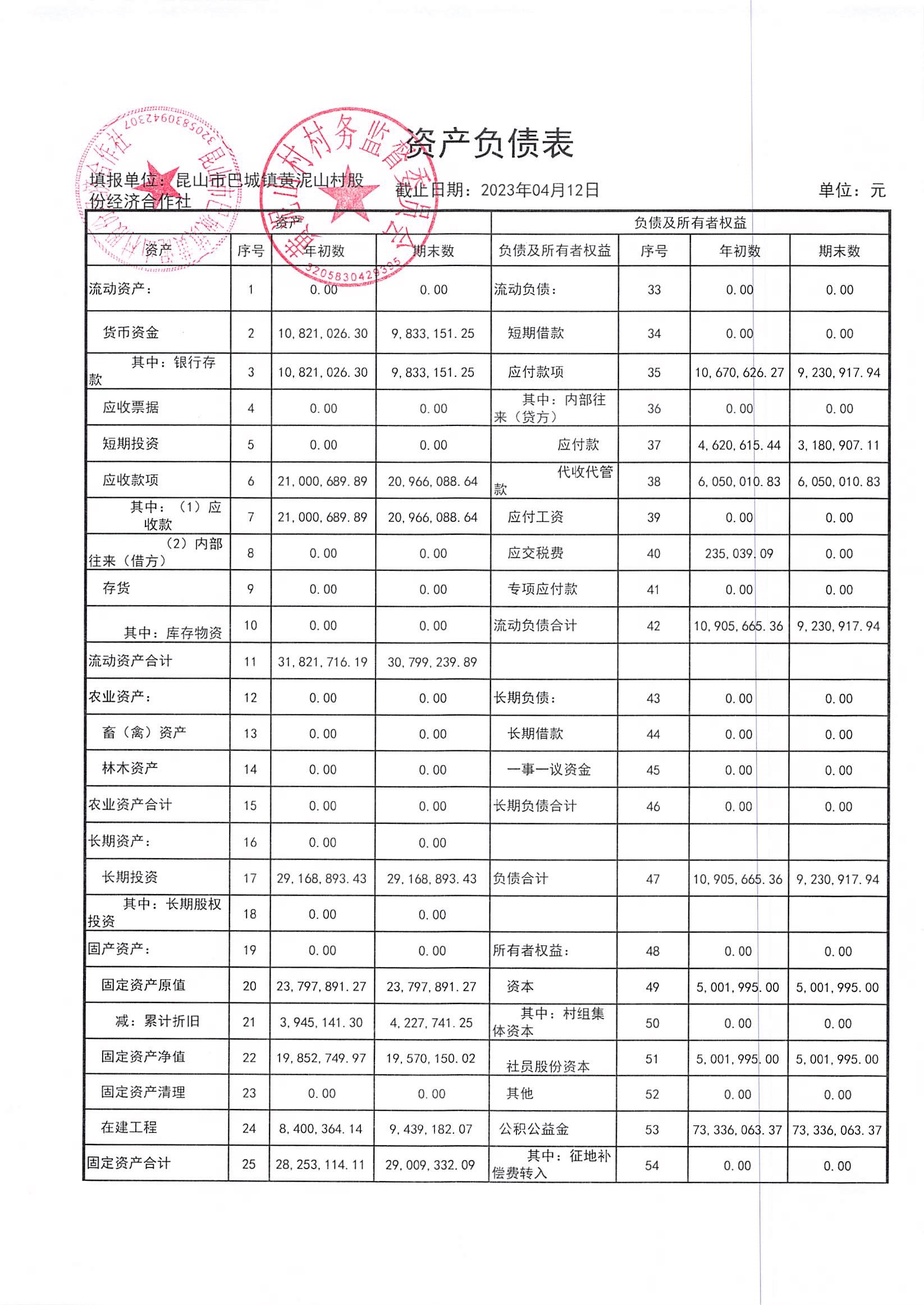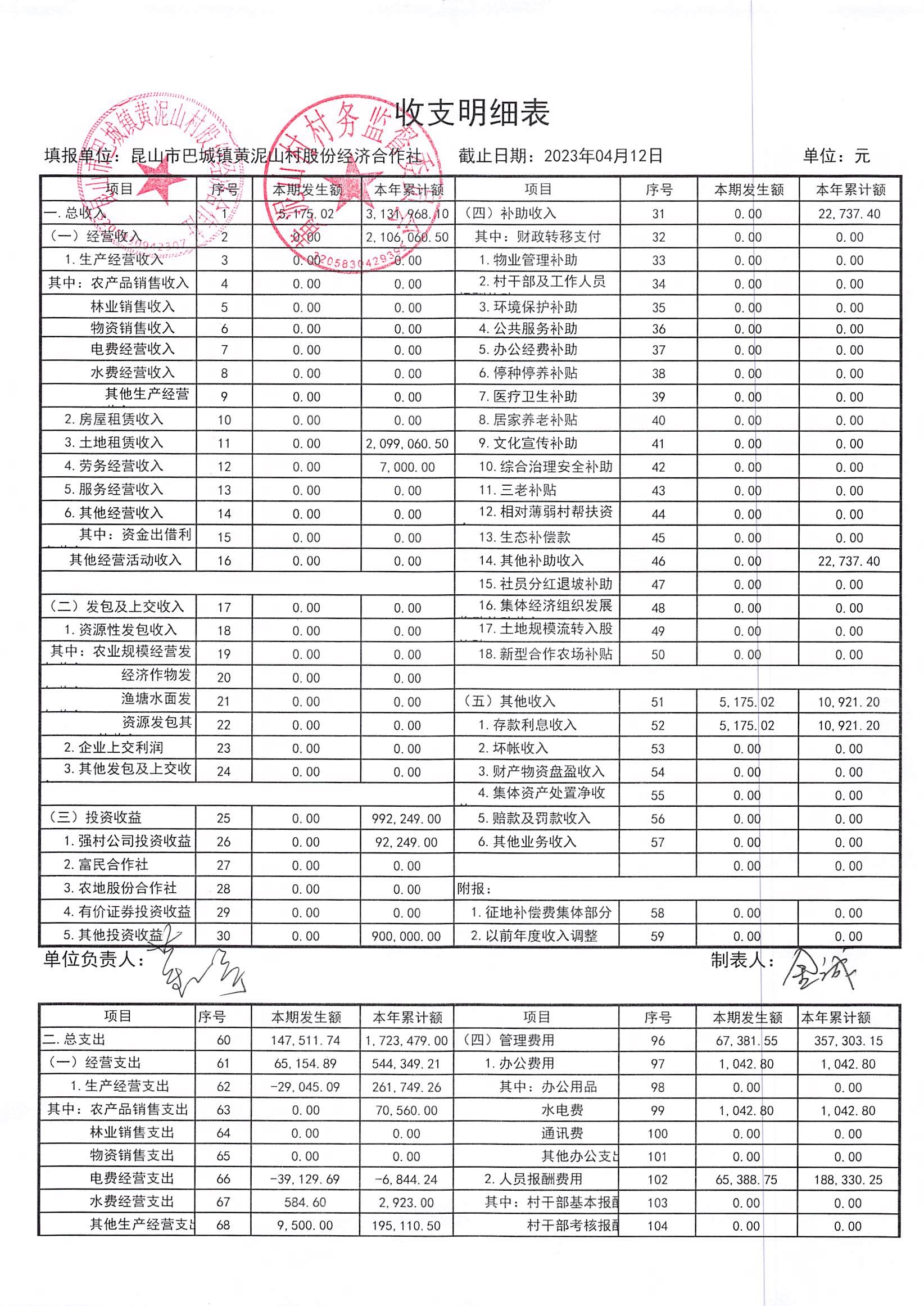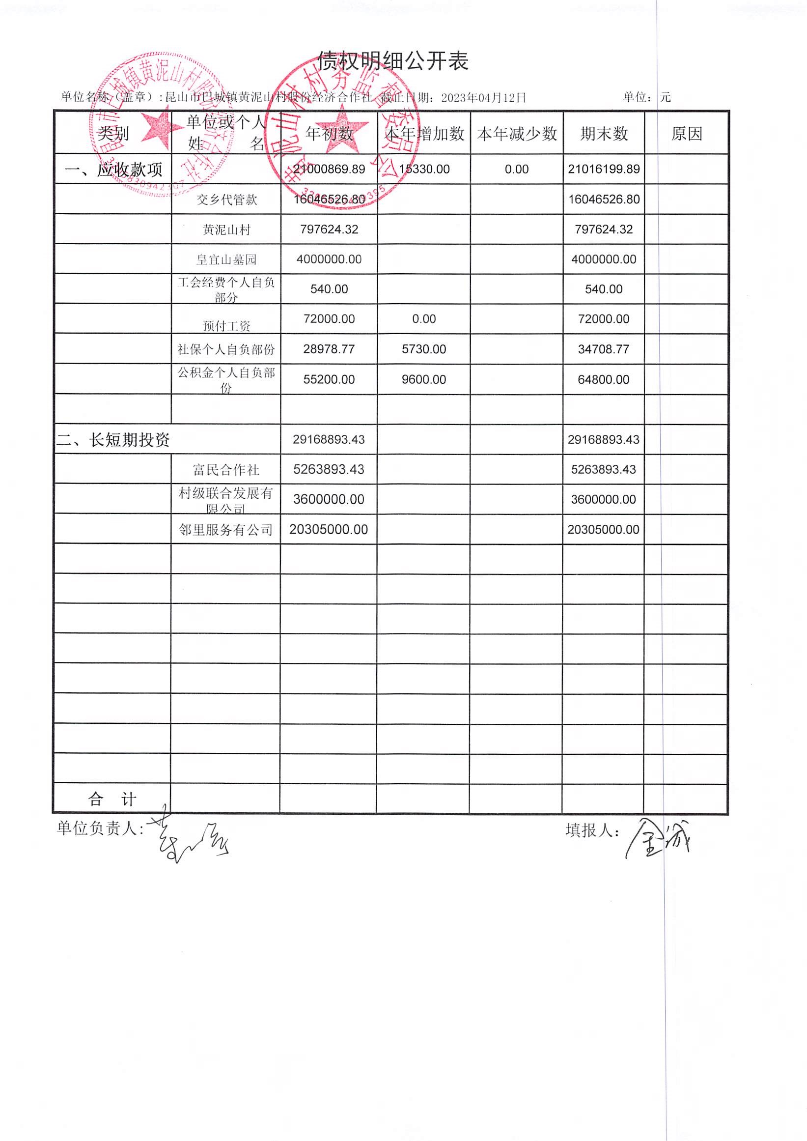 黄泥山村股份经济合作社3月份财务公开