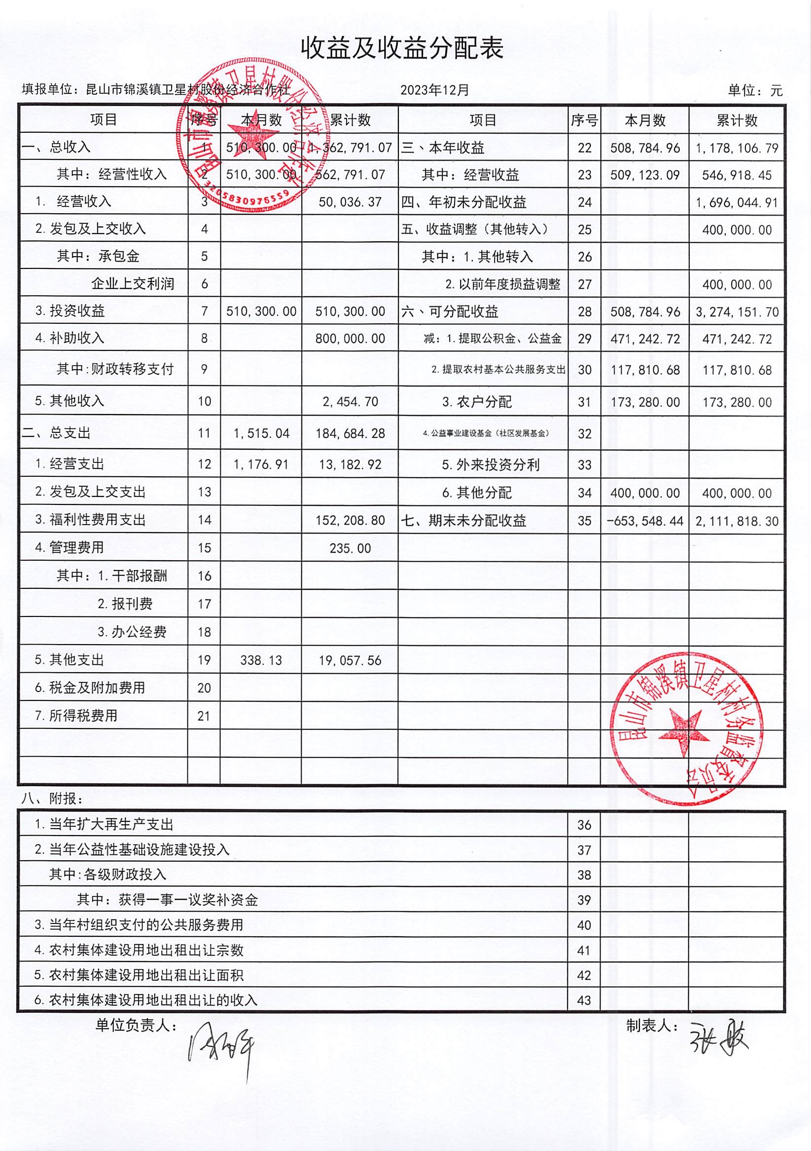 卫星股份经济合作社2023年12月财务公开内容如下: