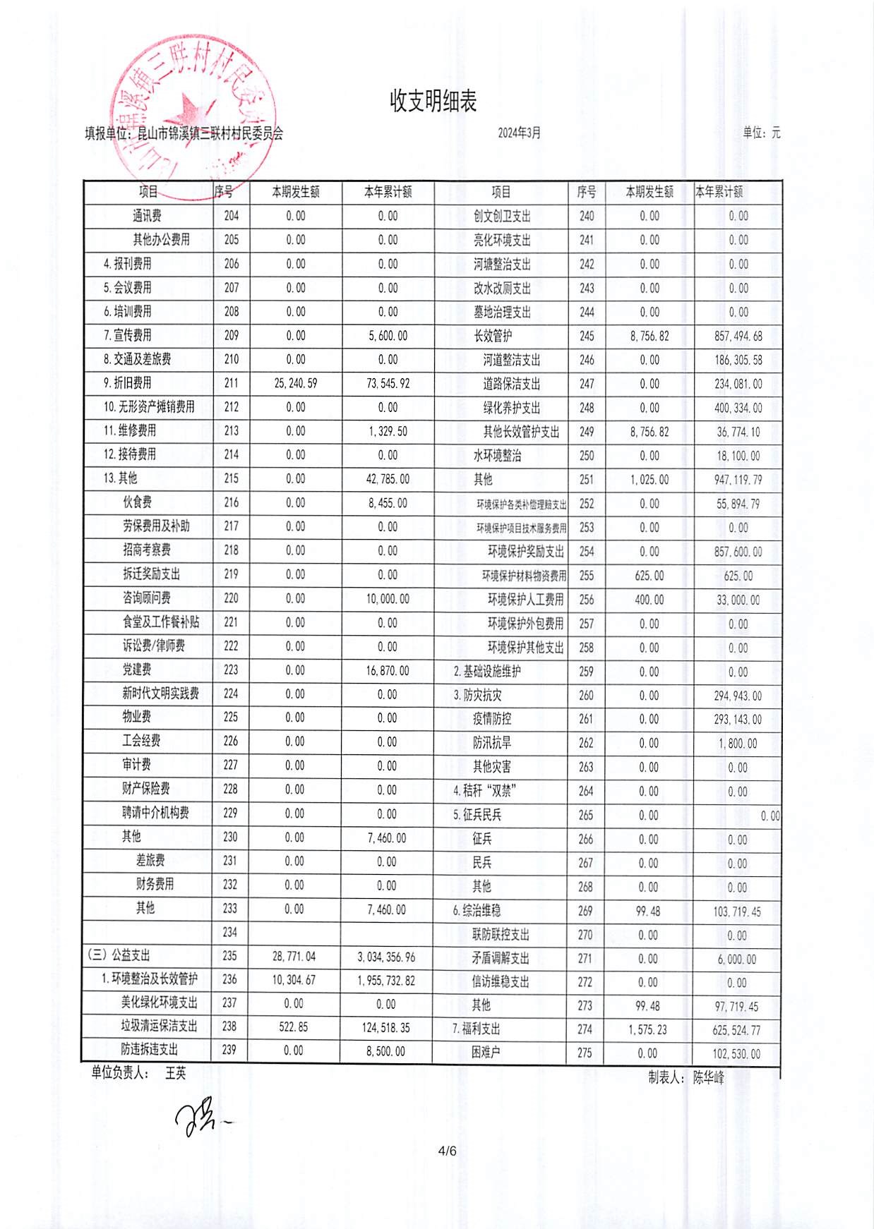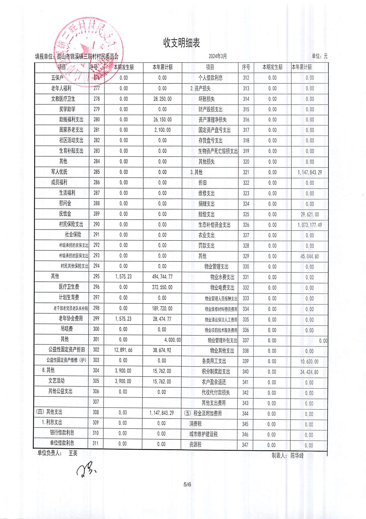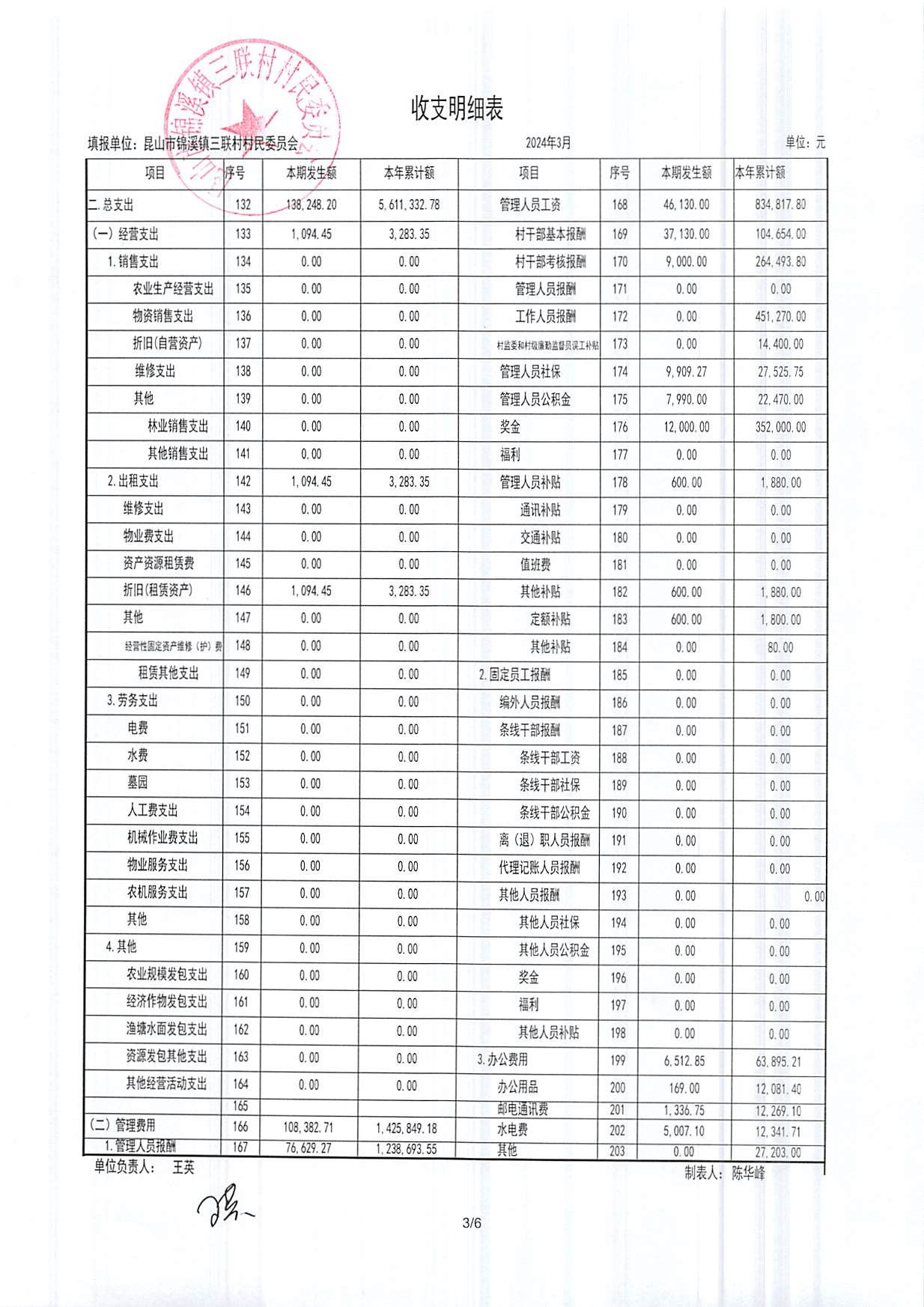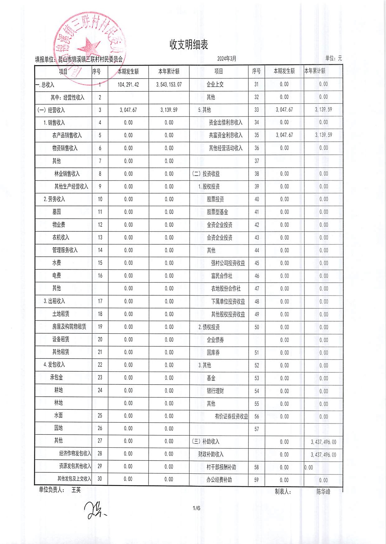 2024年三联村村委会3月份财务公开