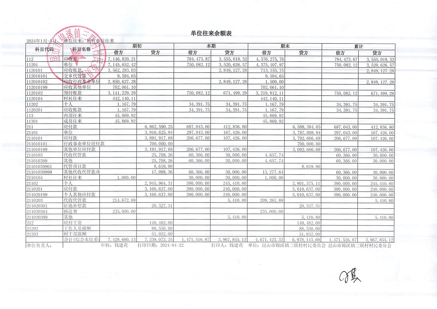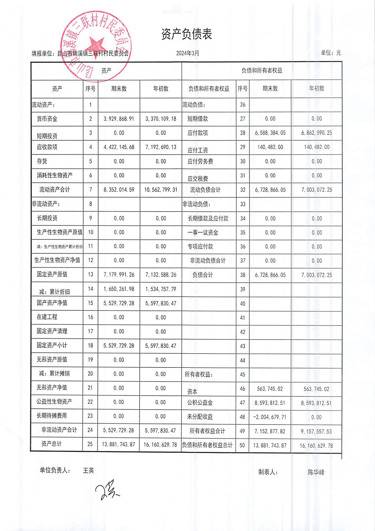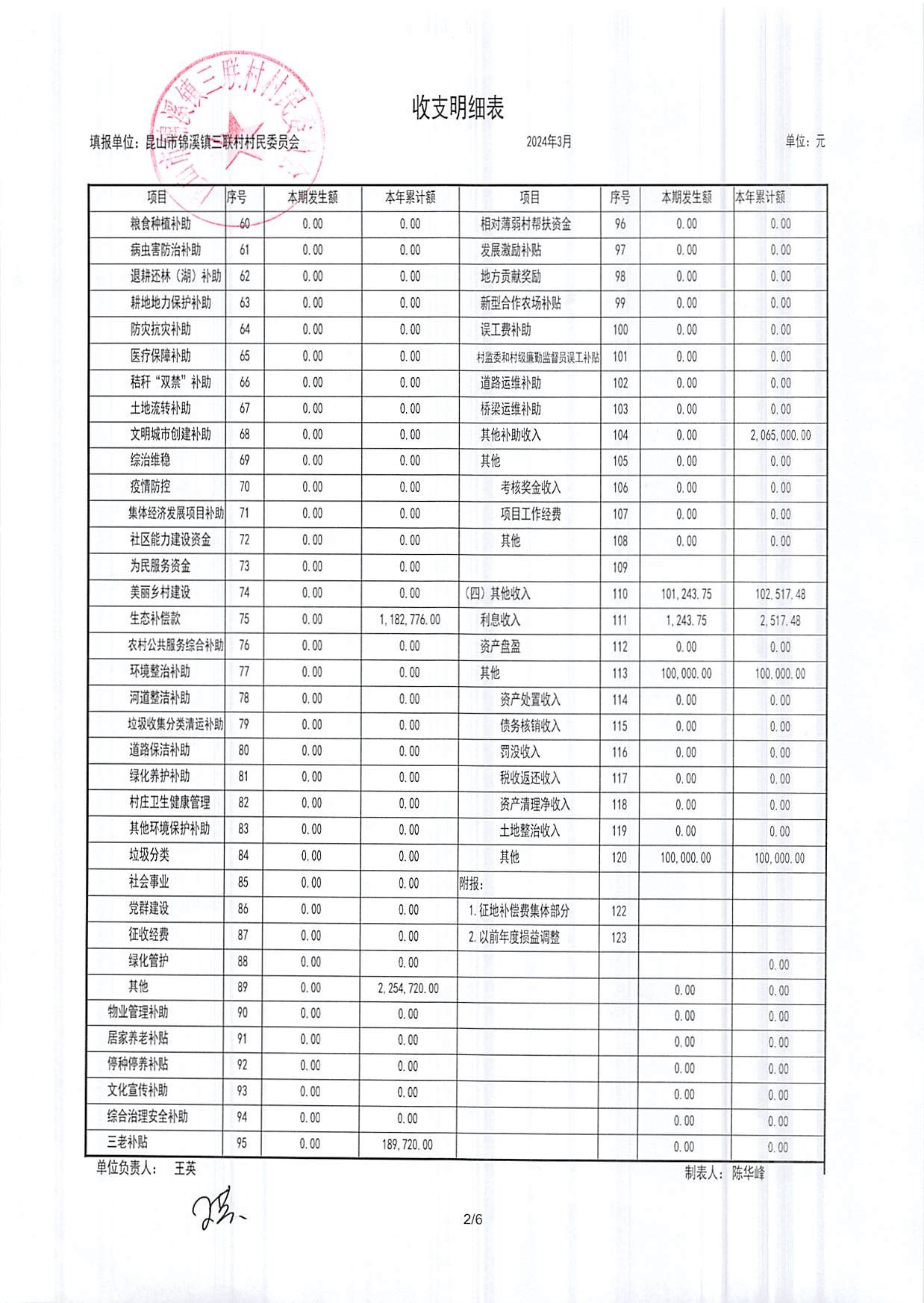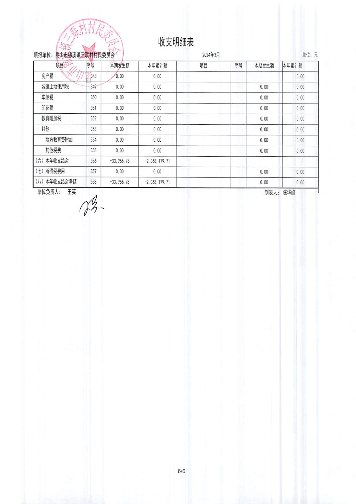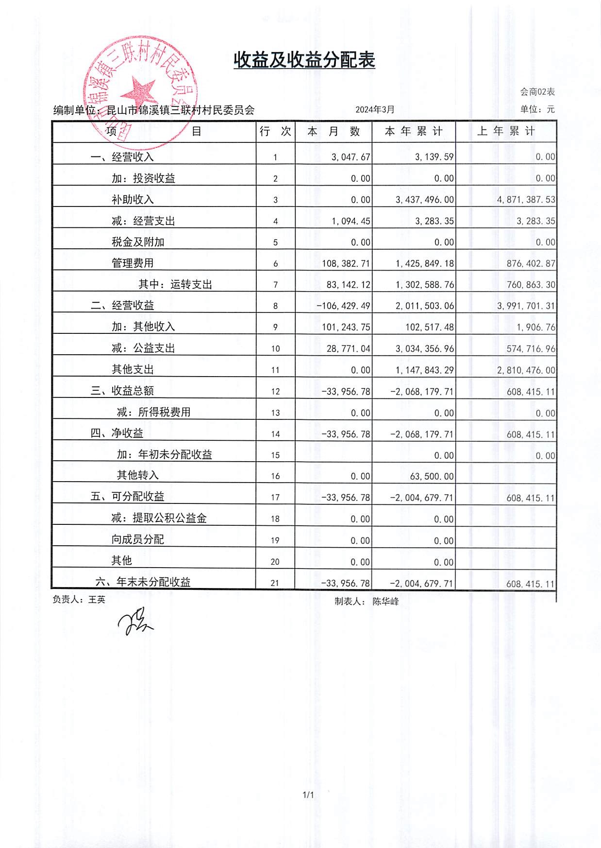 2024年三联村村委会3月份财务公开