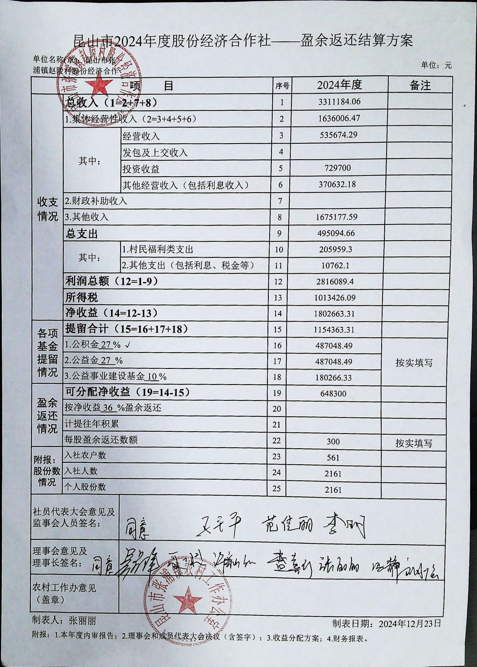 2024年度股份经济合作社-盈余返还结算方案公示