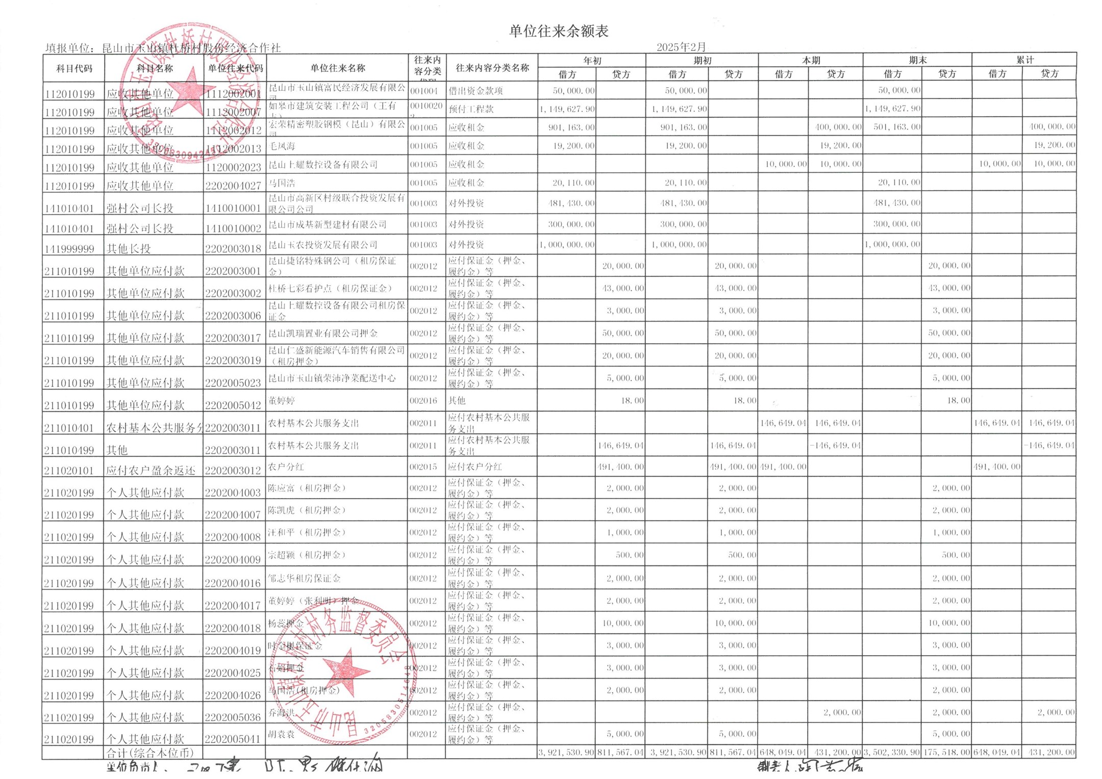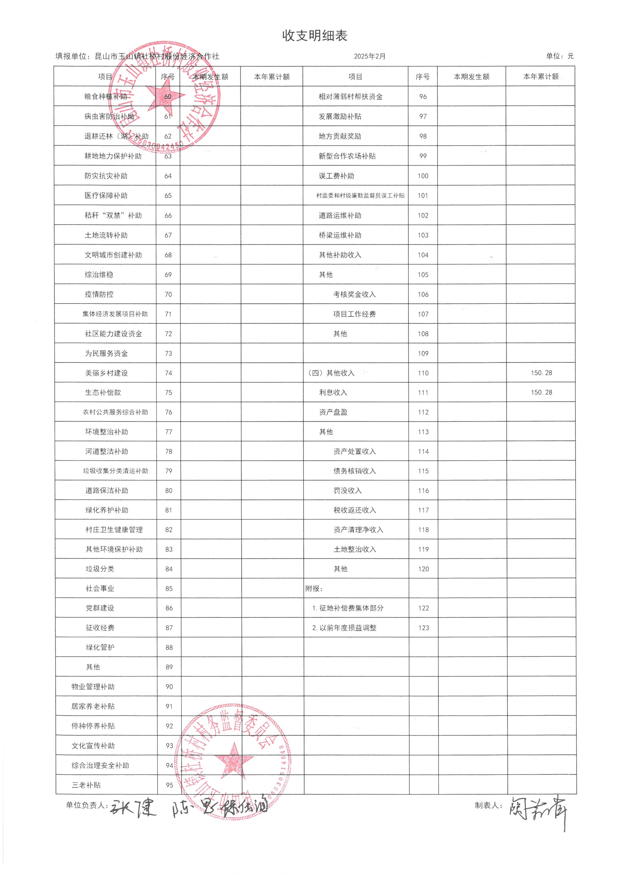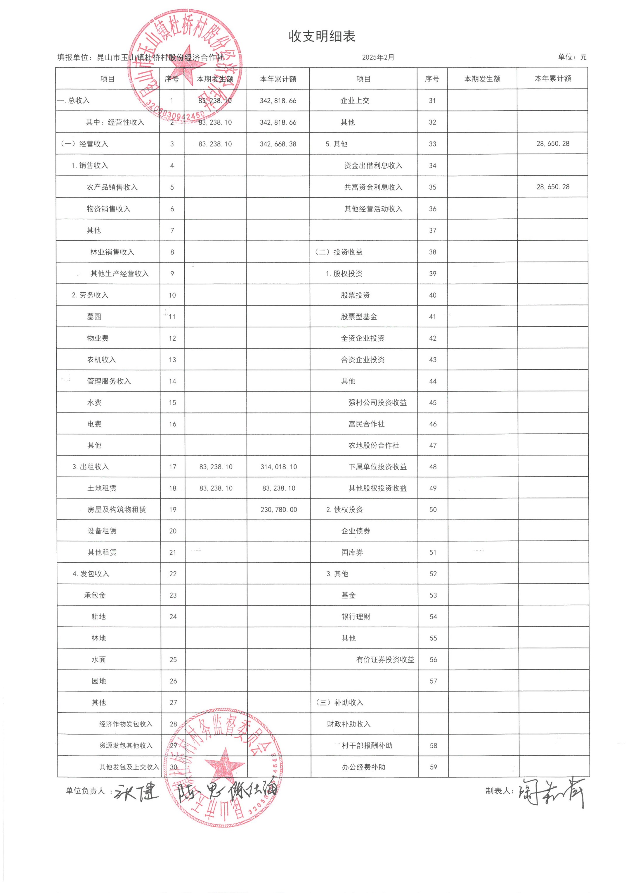 杜桥村股份经济合作社2025年3月份财务公开(2025年2月数据)