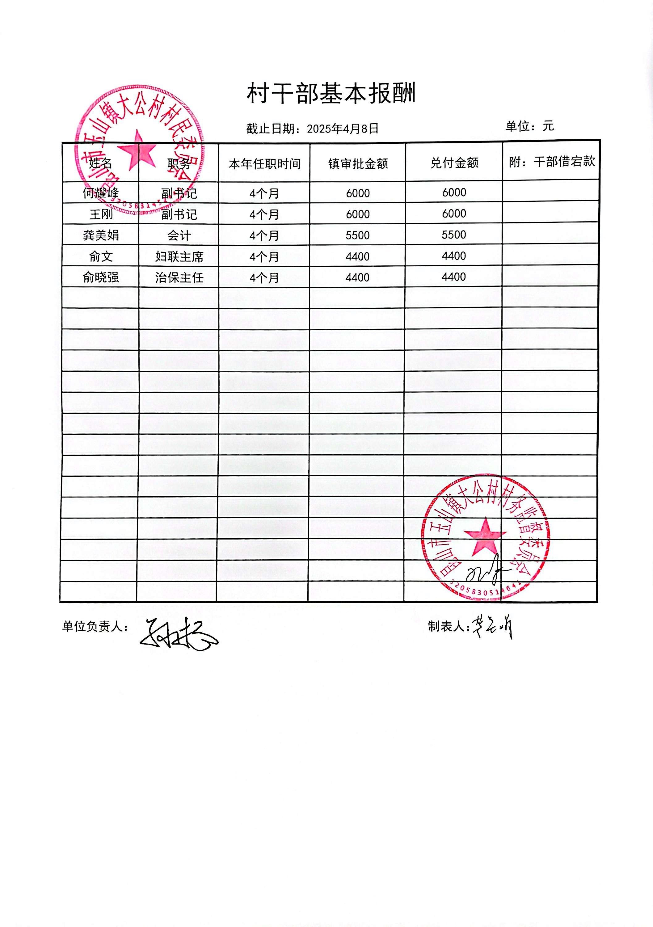 2025年4月村干部报酬