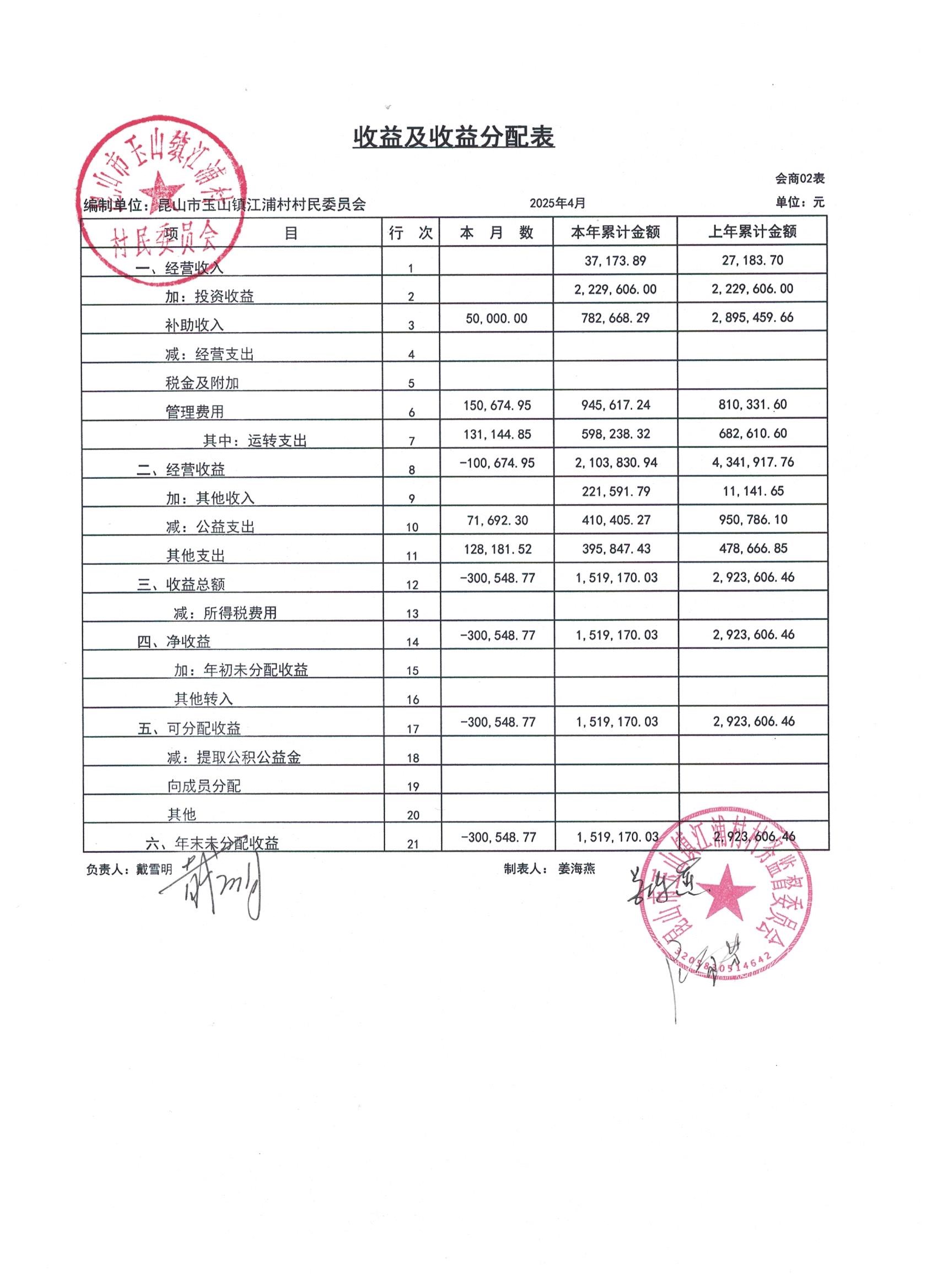 2025年5月份江浦村财务公开-----收益及收益分配表(4月)