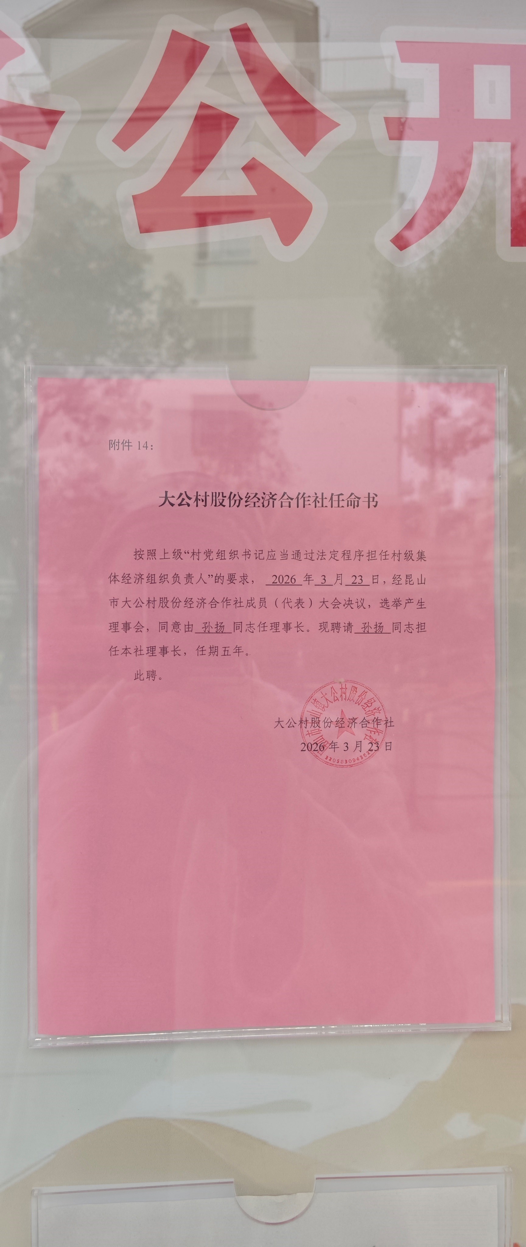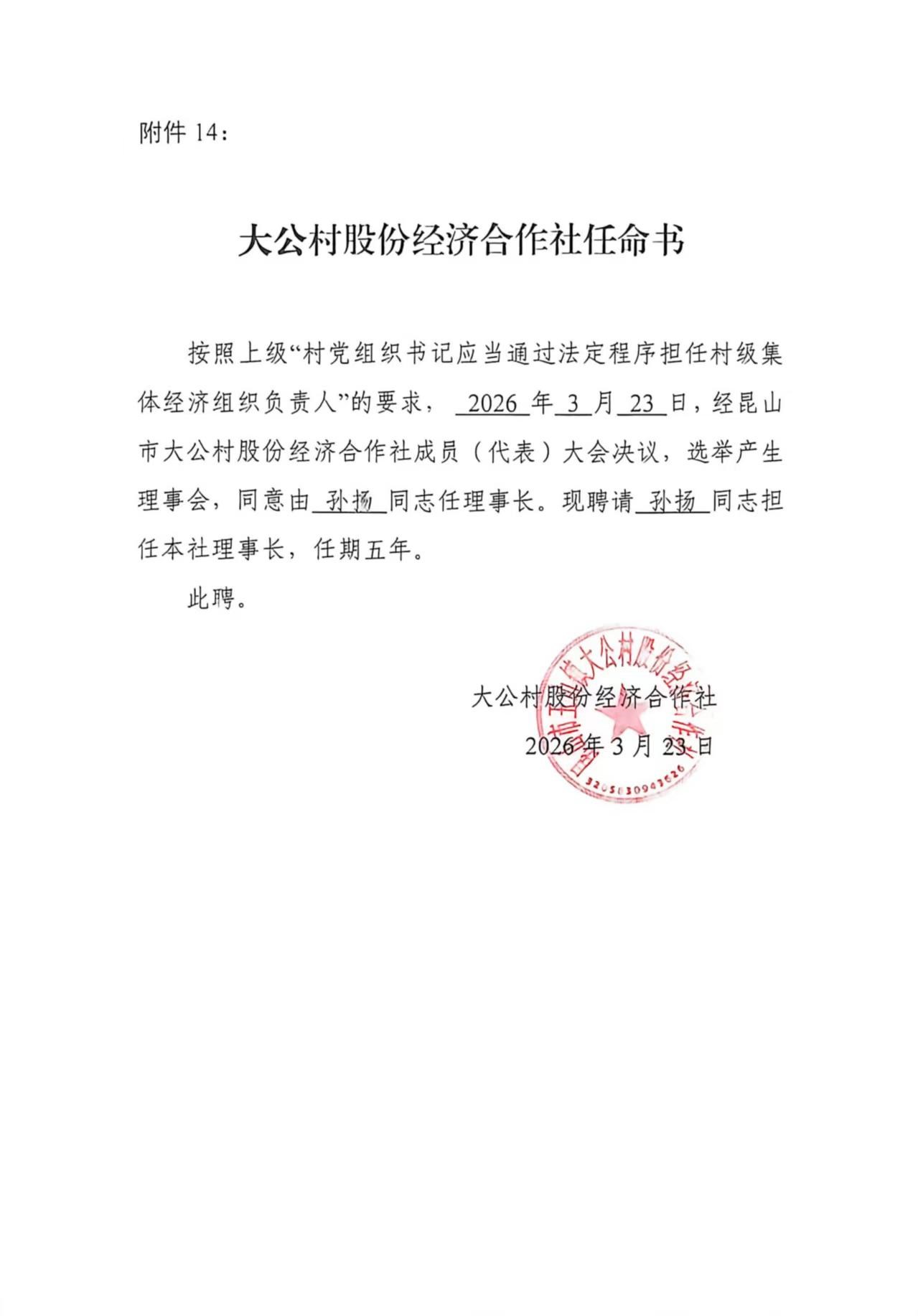 大公村股份经济合作社理事长及任命书公告