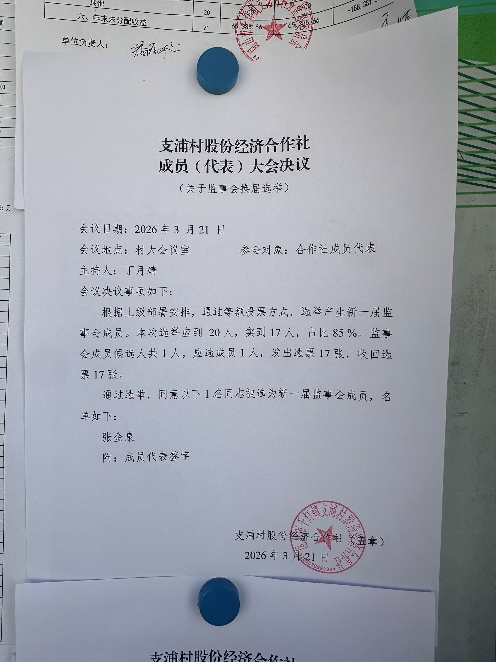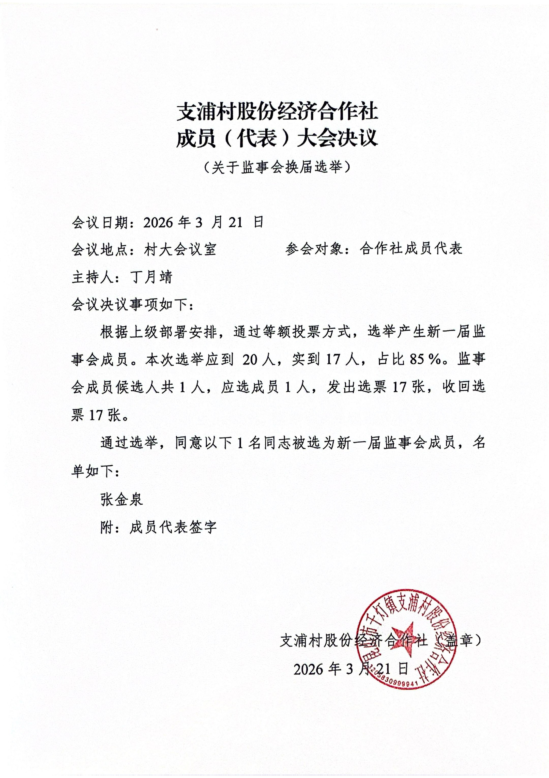 支浦村股份经济合作社成员(代表)大会决议 (关于监事会换届选举)
