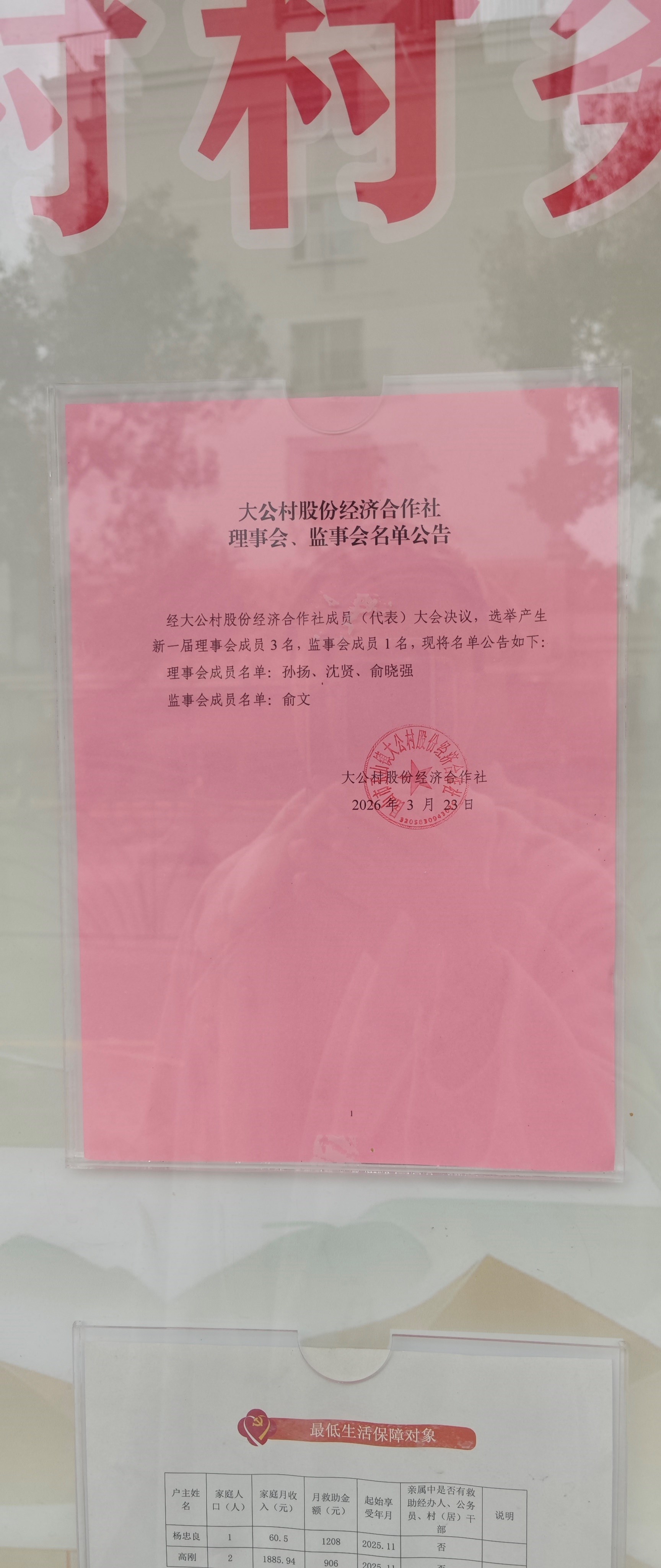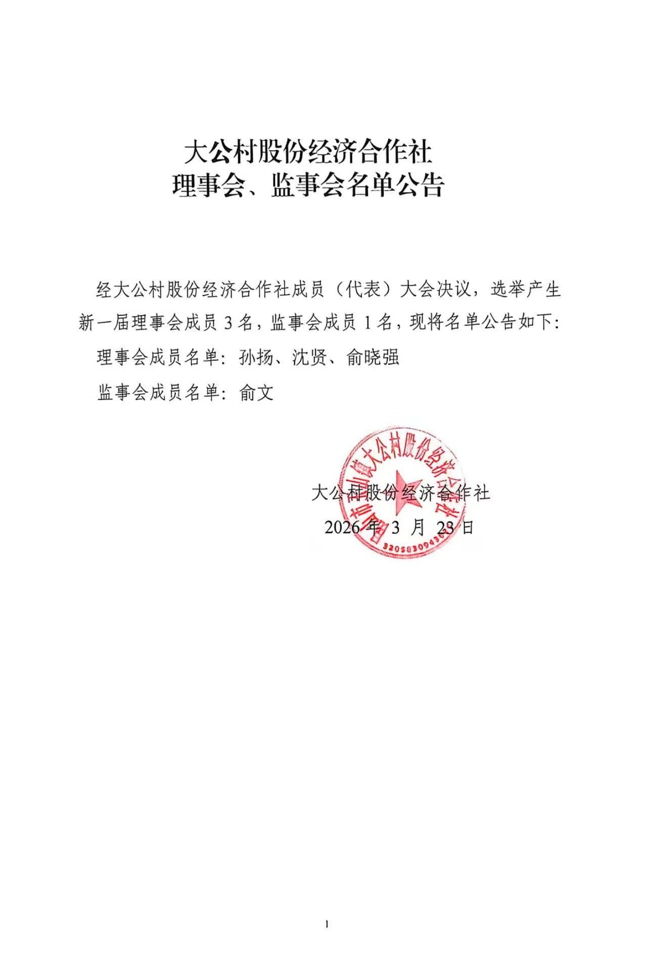 大公村股份经济合作社理事会、监事会成员公告