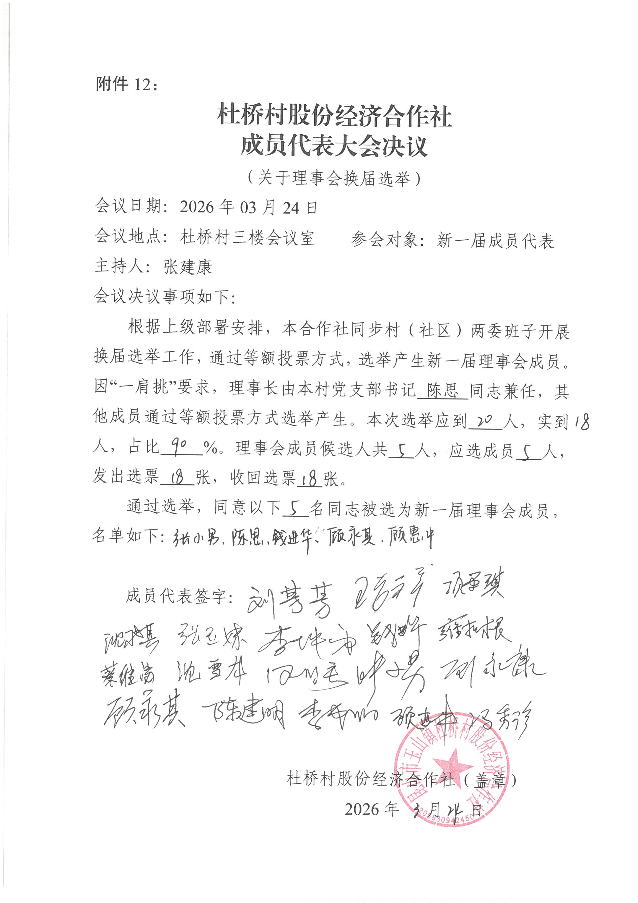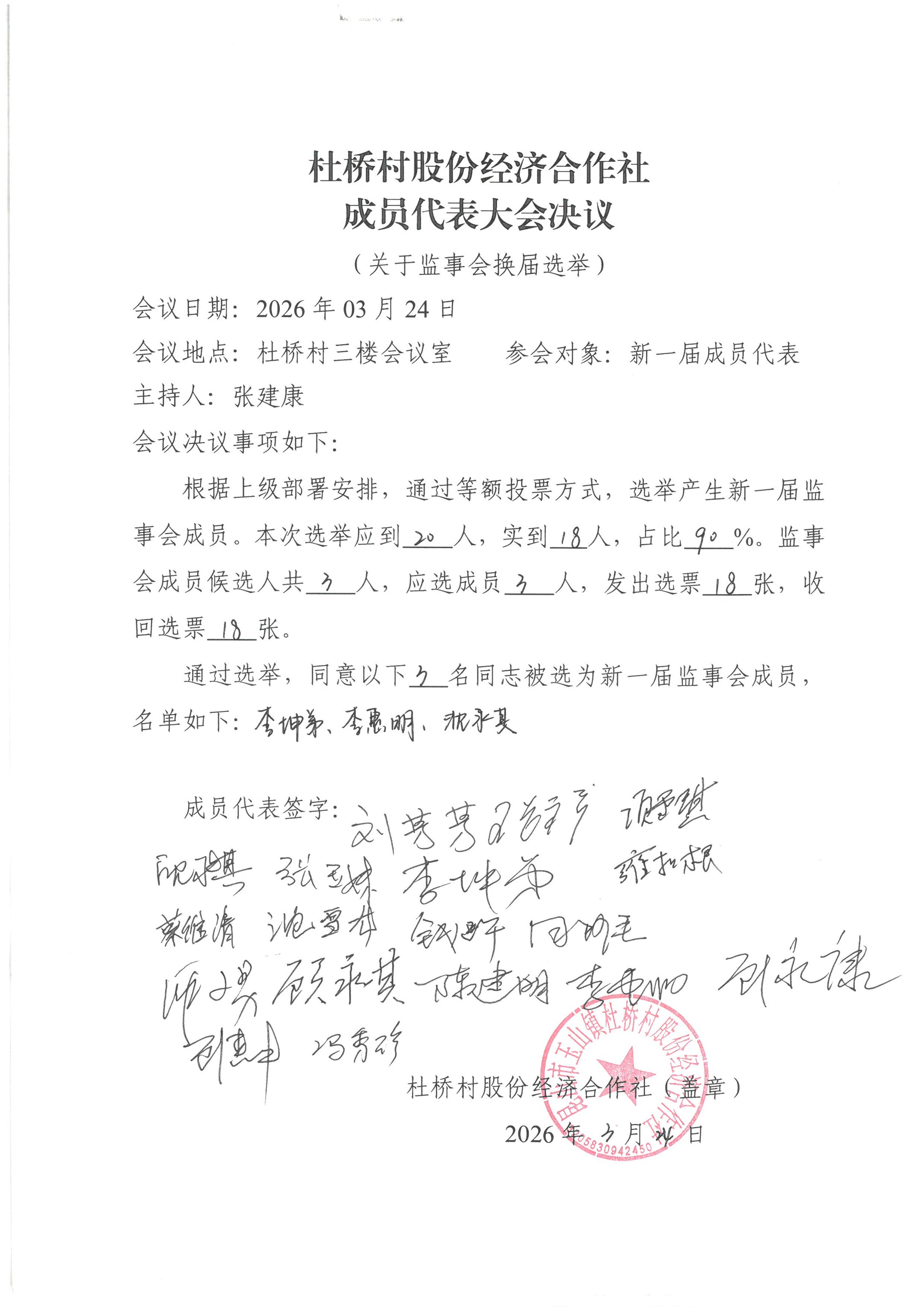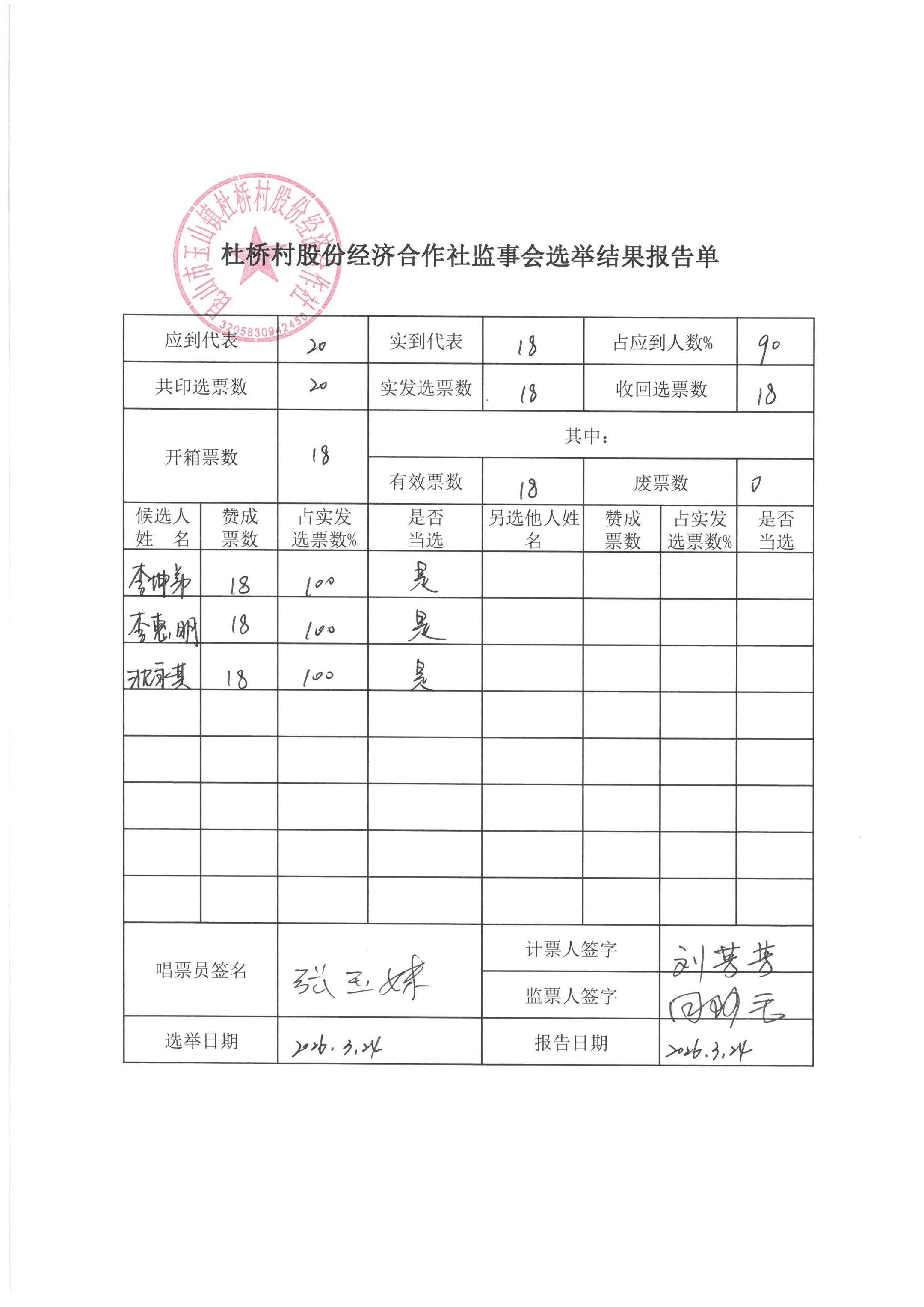 杜桥村股份经济合作社理事会、监事会决议、报告单公示(理事会、监事会选举)