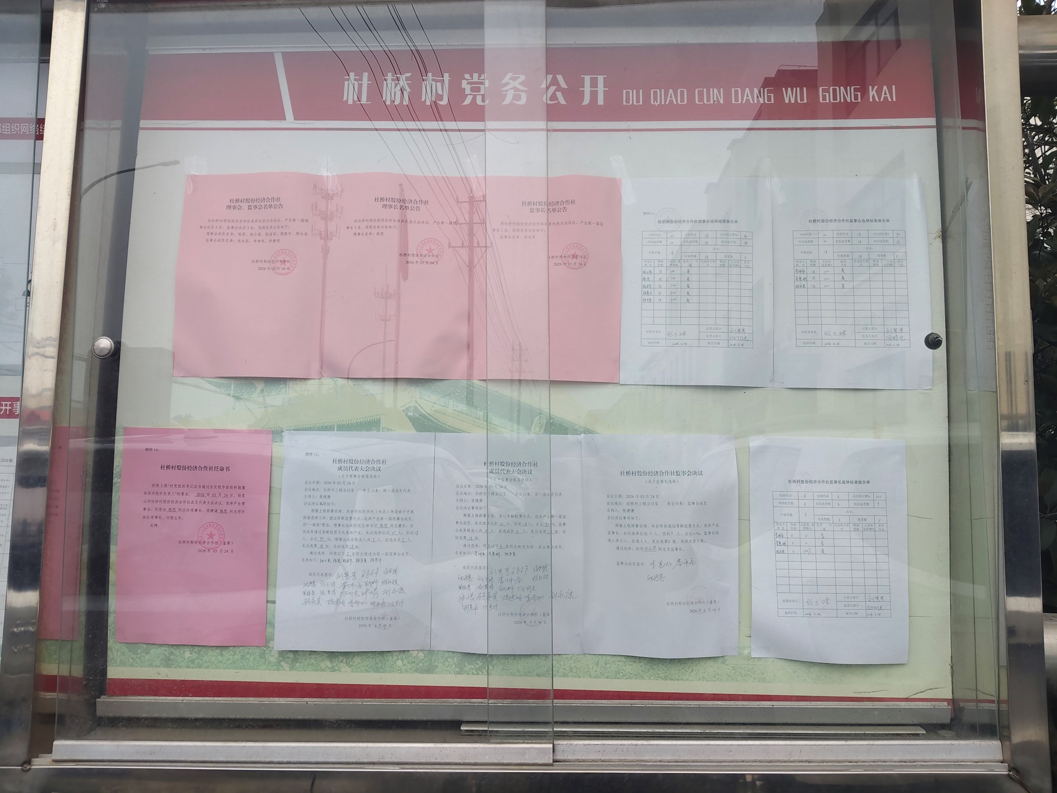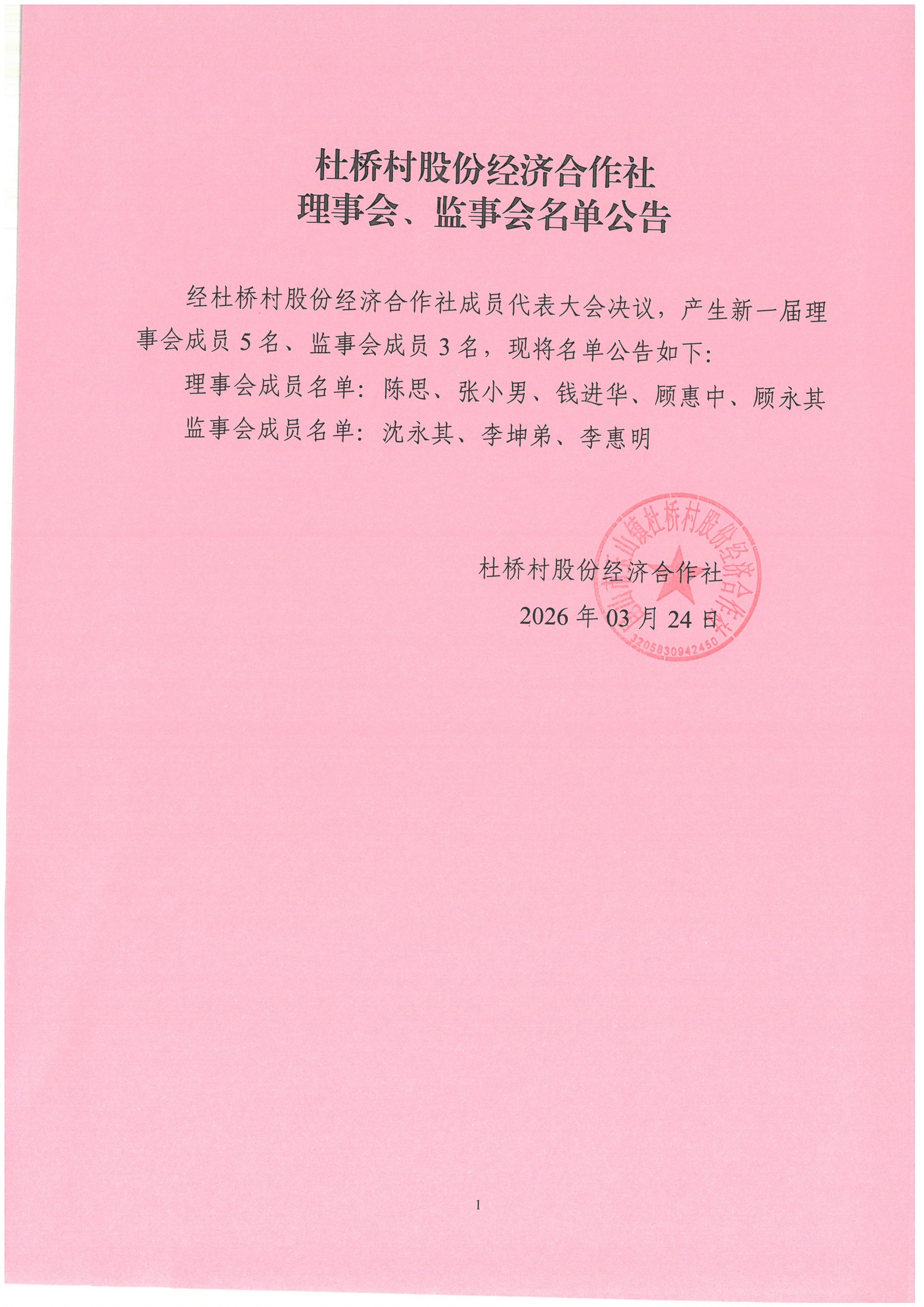 杜桥村股份经济合作社理事会、监事会名单公告