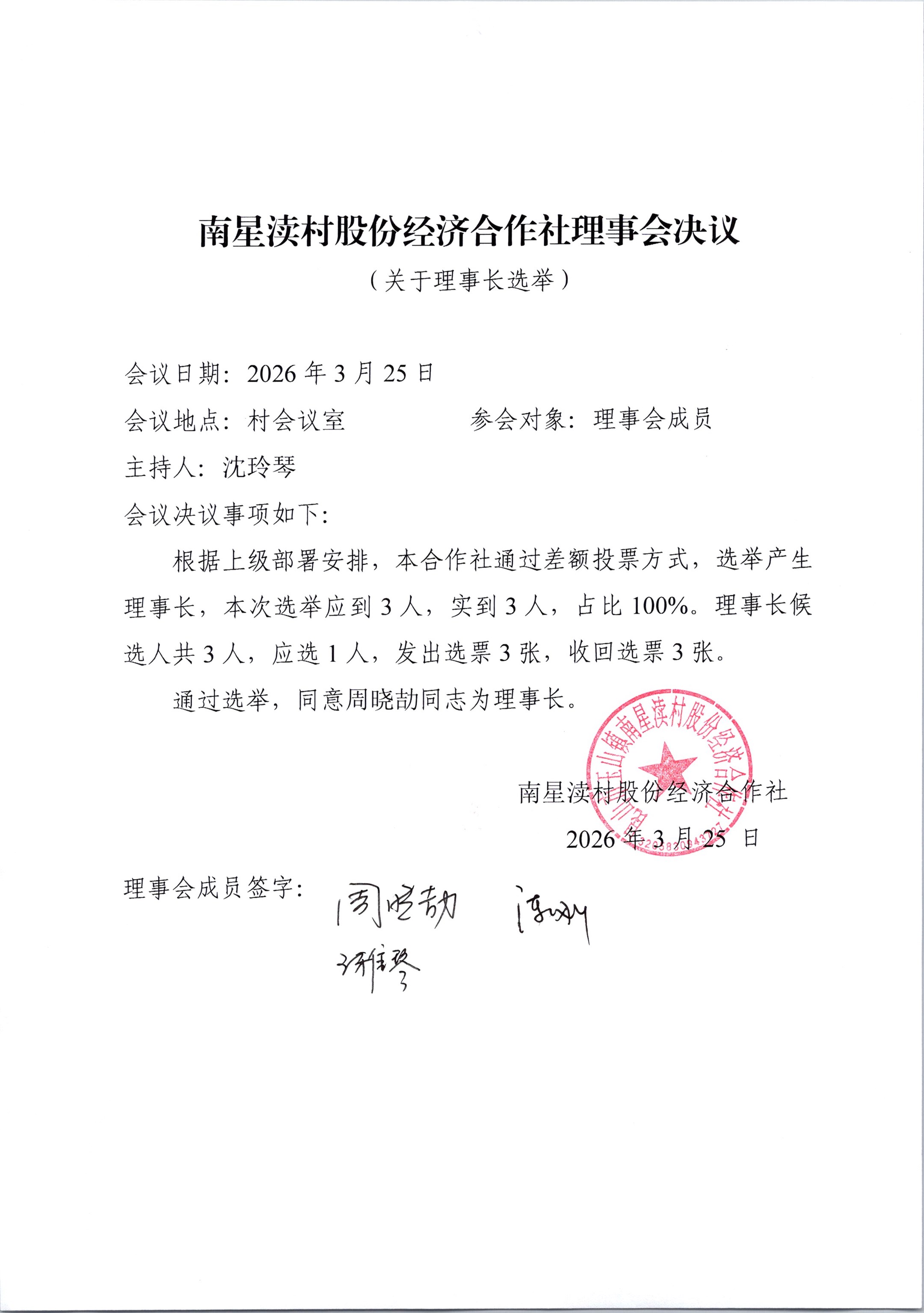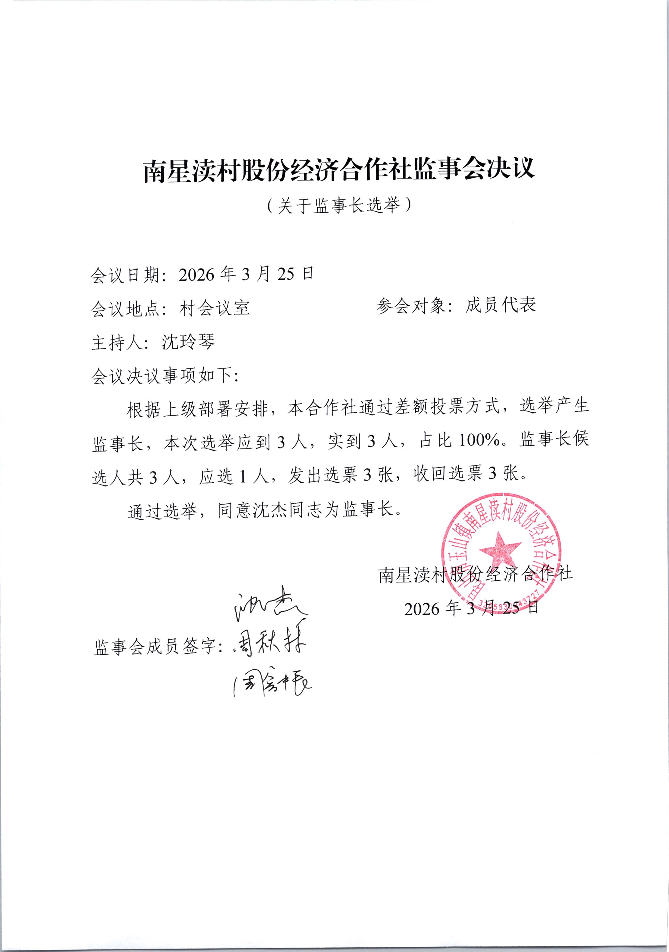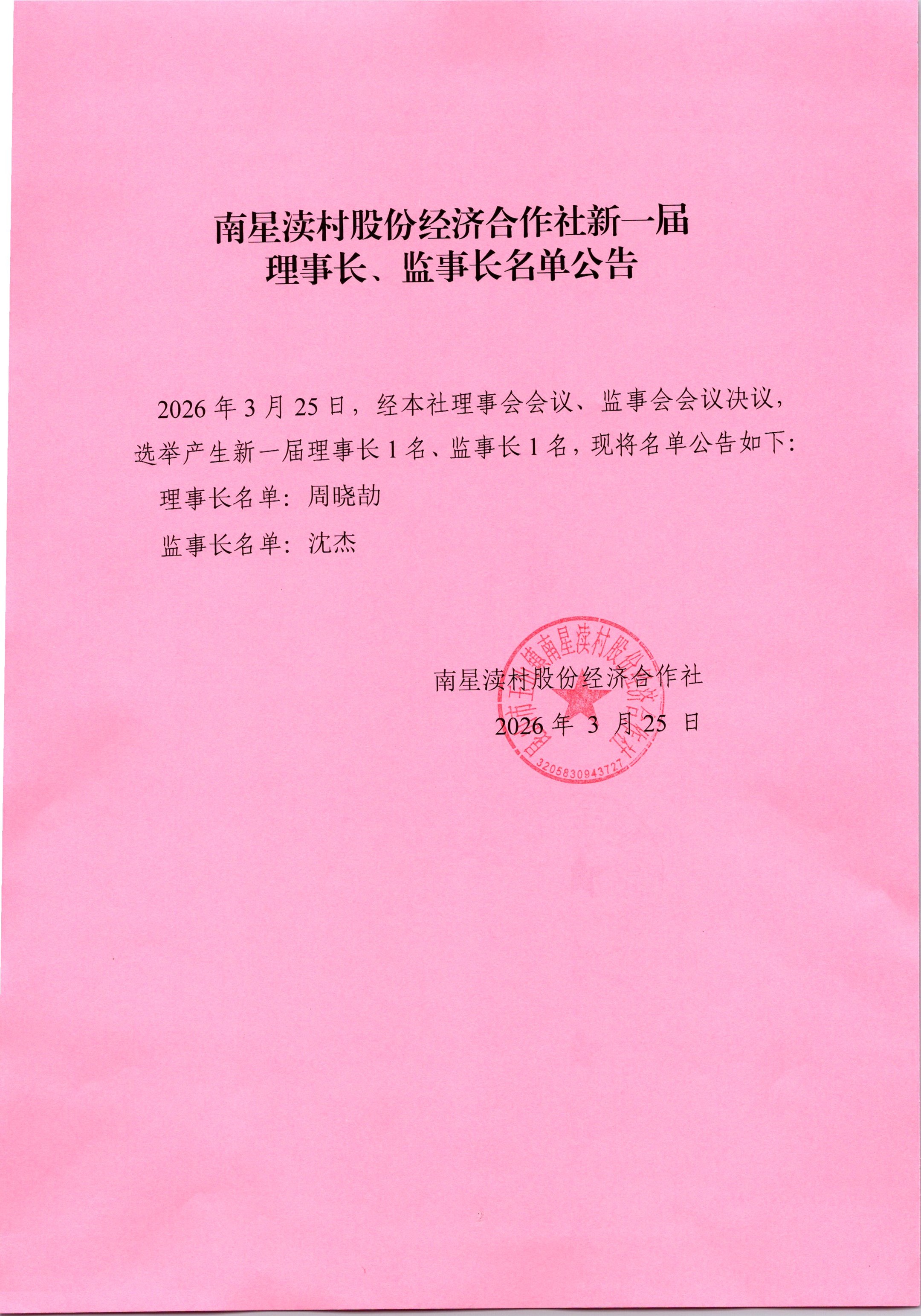 南星渎村股份经济合作社理事会、监事会决议公示(关于理事长、监事长选举)